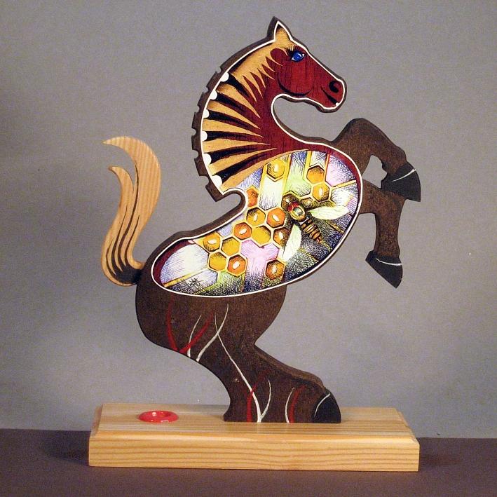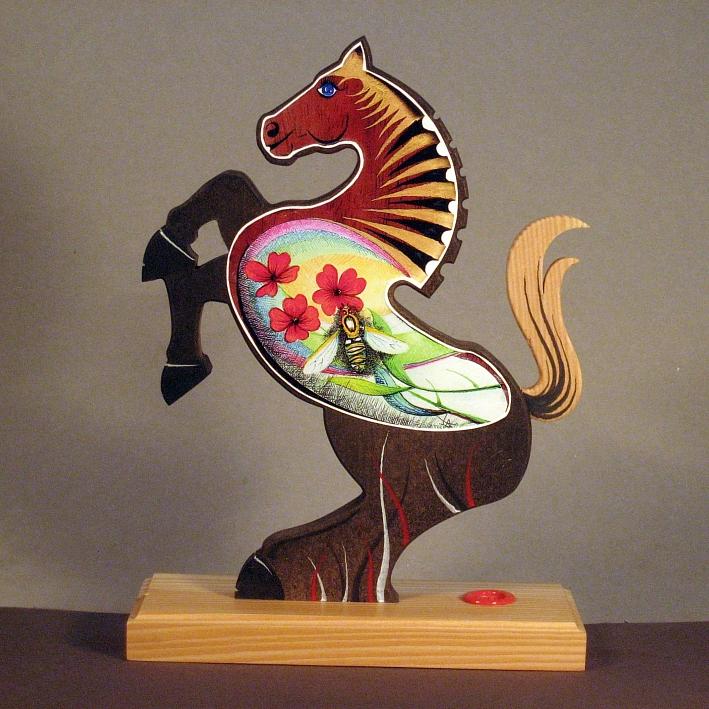 Giocattoli d'arte del maestro Sergio Milani - collezione "whim" , linea "Brisk". Brisk 2018-13 copia - ideato e costruito in Italy - dimensioni cm 17 x 23 x 7 - peso Kg 0,350. Il cavallino della linea Brisk è realizzato in legno MDF con la base di supporto in legno pregiato a vista, può assumere anche la funzione di reggilibri. La decorazione è fedele all'opera originale è realizzata con procedimento fotografico ad alta definizione. Le copie sono numerate ed appartengono ad una tiratura limitata a 50 pezzi, sono tutte siglate con sigillo in cera lacca ed accompagnate da un certificato di autenticità con foto, numero progressivo e firma dell'artista.