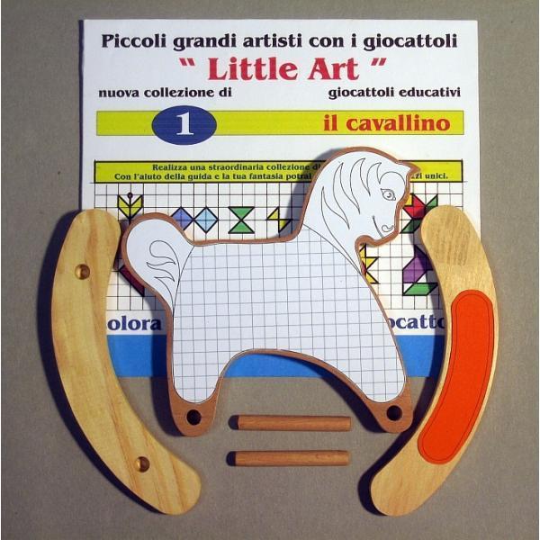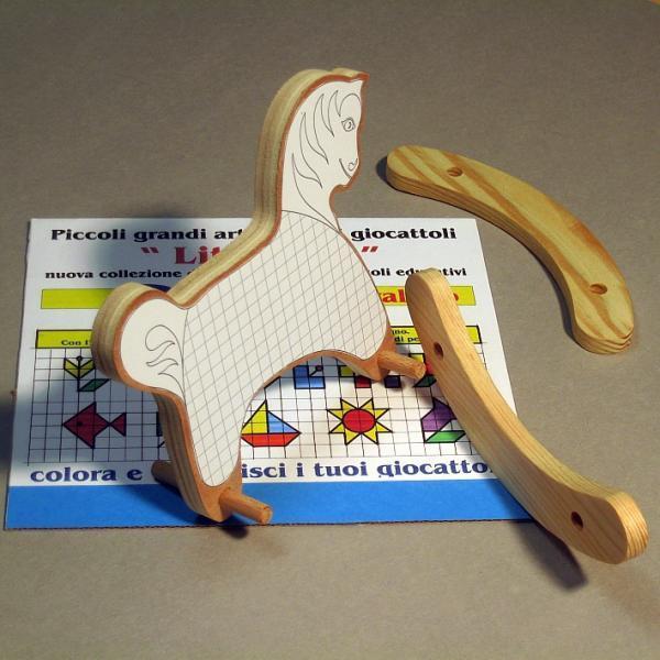 Giocattoli d'arte del maestro Sergio Milani - collezione "whim" , linea "Little art - IL CAVALLINO versione A". Giocattolo educativo realizzato con procedimento manuale, il corpo del cavallino è realizzato in legno mdf e le bascule dondolo in legno pregiato. Il cavallino è rivestito con un cartoncino bianco quadrettato pronto per l'esercitazione nel disegno e la coloritura con qualsiasi tecnica. Una breve descrizione con dei semplici consigli serve a dare istruzioni per la realizzazione sia del disegno che per il colore. L'assemblaggio è ad incastro senza collante.