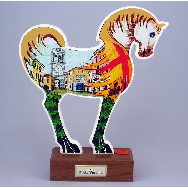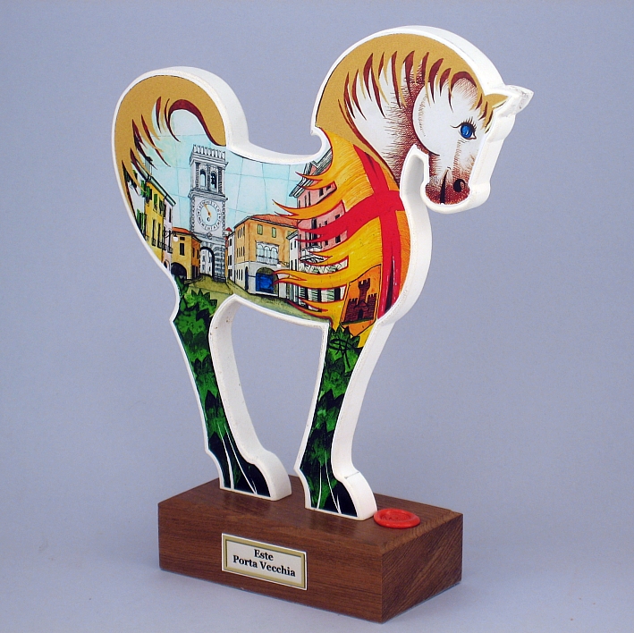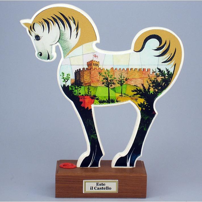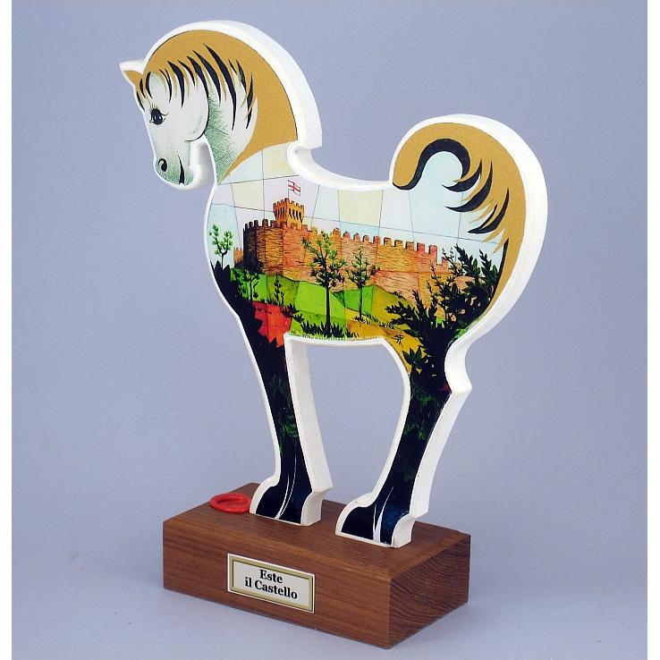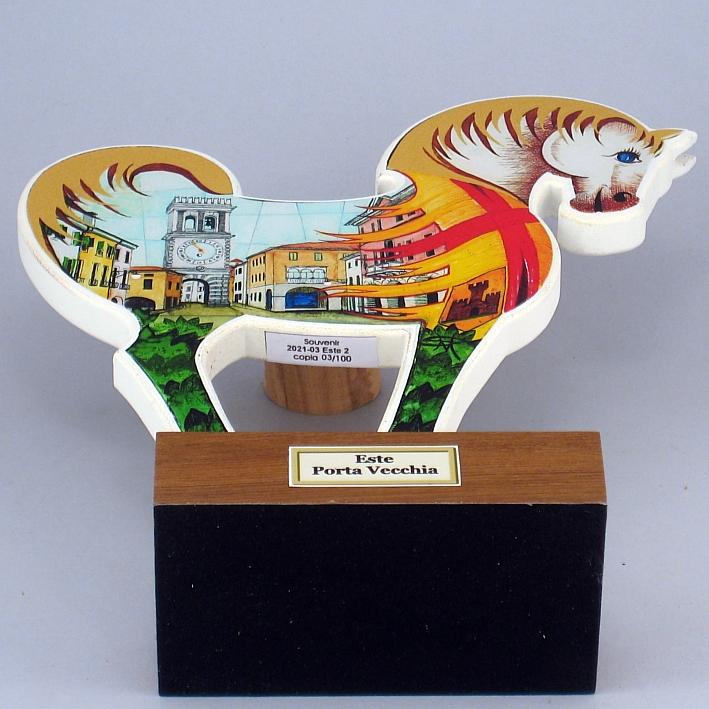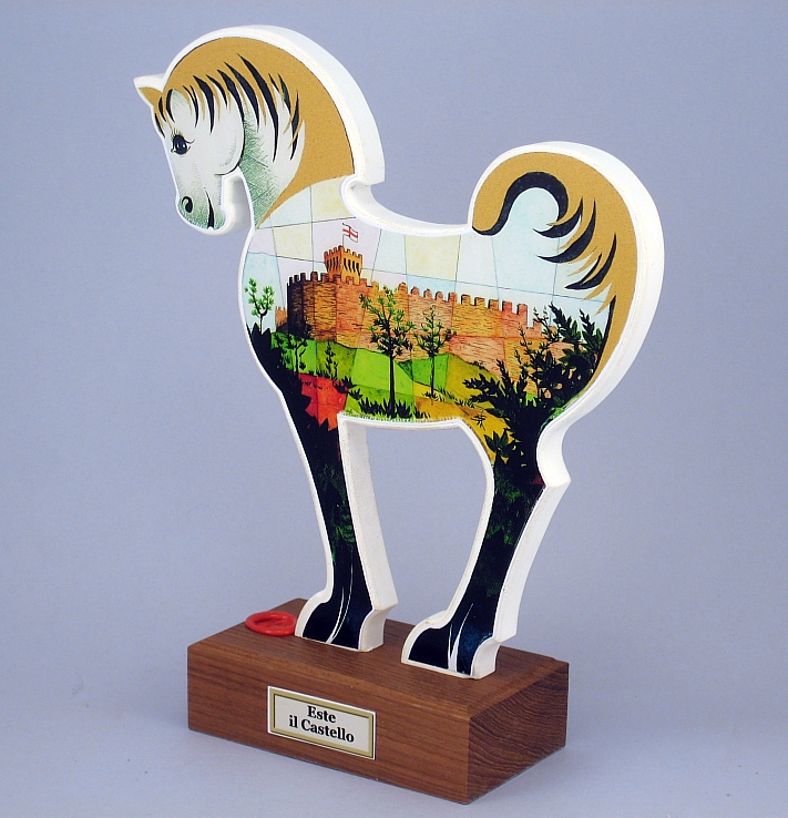 Giocattoli del maestro Sergio Milani, collezione "whim", linea di cavallini "Souvenir copia". Il cavallino avente le stesse dimensioni dell'opera originale è realizzato con lavorazione manuale, il corpo in legno MDF, la base in legno pregiato a vista, dimensioni cm 20x23x6. La decorazione è fedele all'opera originale ed è riprodotta con procedimento fotografico ad alta definizione. Il tema decorativo riservato alla linea è "Monumenti storici e paesaggi", la presente opera interpreta due monumenti della città di Este, il Castello e la cosidetta Porta Vecchia. I cavallini della presente linea appartengono ad una serie numerata limitata a 100 pezzi non ripetibili.