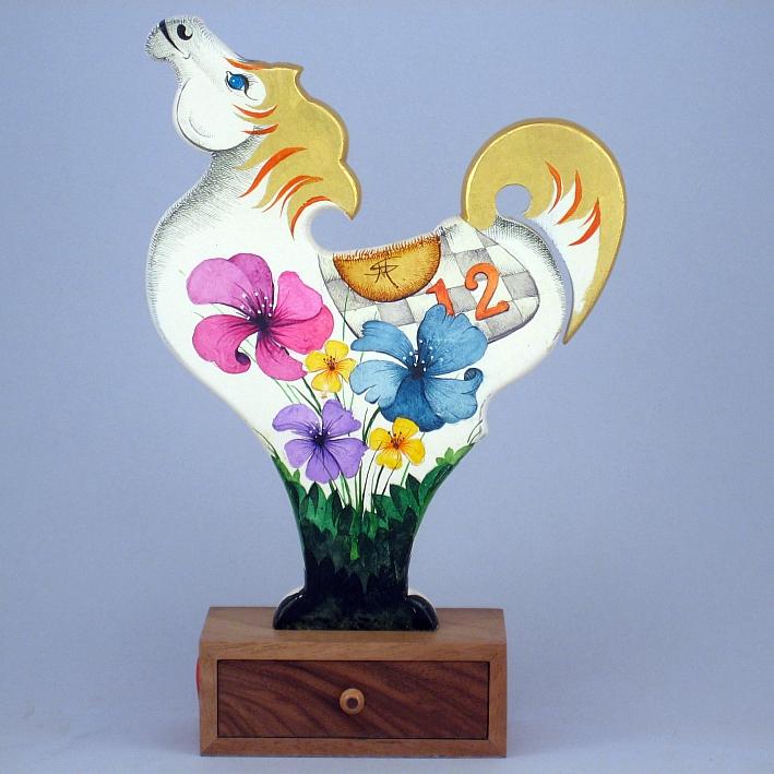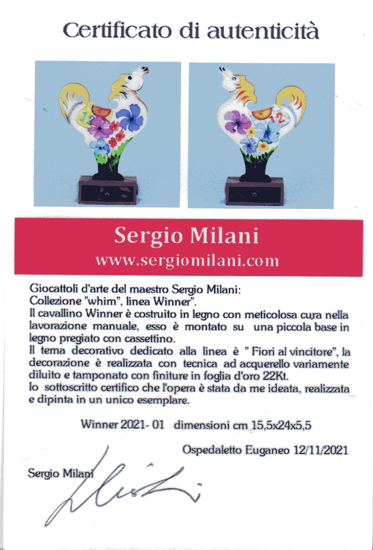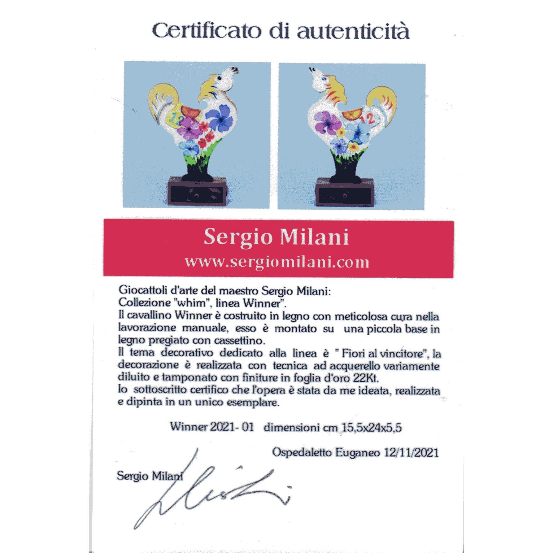 Giocattoli d'arte del maestro Sergio Milani - collezione "whim" , linea "Winner". "Winner 2021-01", ideato, realizzato e dipinto in Italy - dimensioni cm 16 x 24 x 5 - in 6.2 -9.4 -1.9 peso kg 0,300. - lb 0.66. Il cavallino Winner è costruito in legno mdf con meticolosa cura nella lavorazione manuale, esso è montato su una base con cassettino realizzata in legno pregiato a vista. Il tema decorativo dedicato alla linea è tratto dalla natura " Onori al Vincitore", la decorazione è realizzata con tecnica ad acquerello variamente diluito e tamponato su un fondo appositamente preparato, essa viene terminata con finiture in foglia d'oro 22Kt. Opera unica accompagnata da un certificato di autenticità, con foto, numero di catalogo e firma dell'artista.