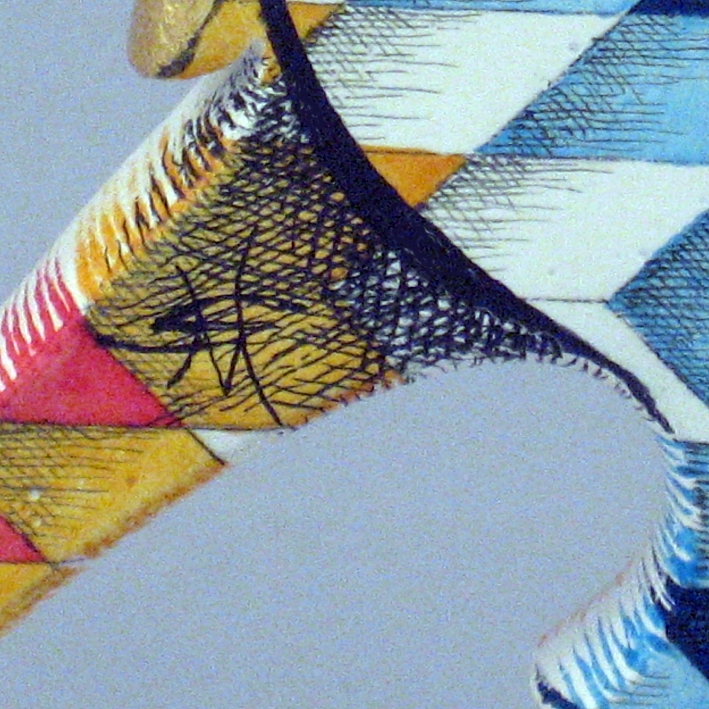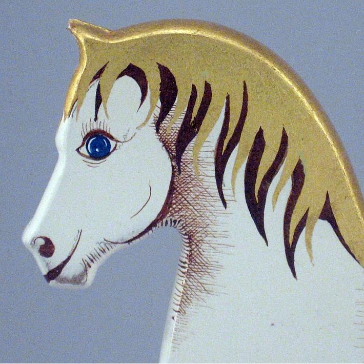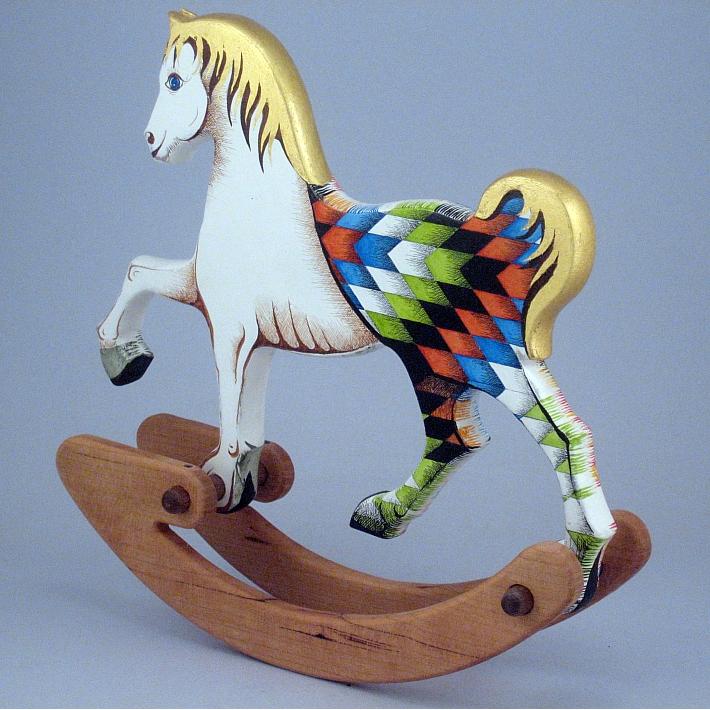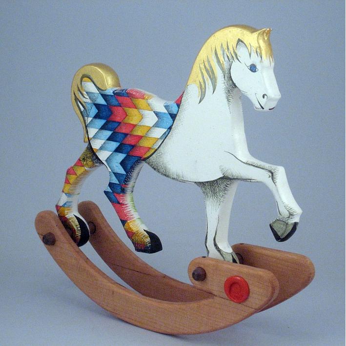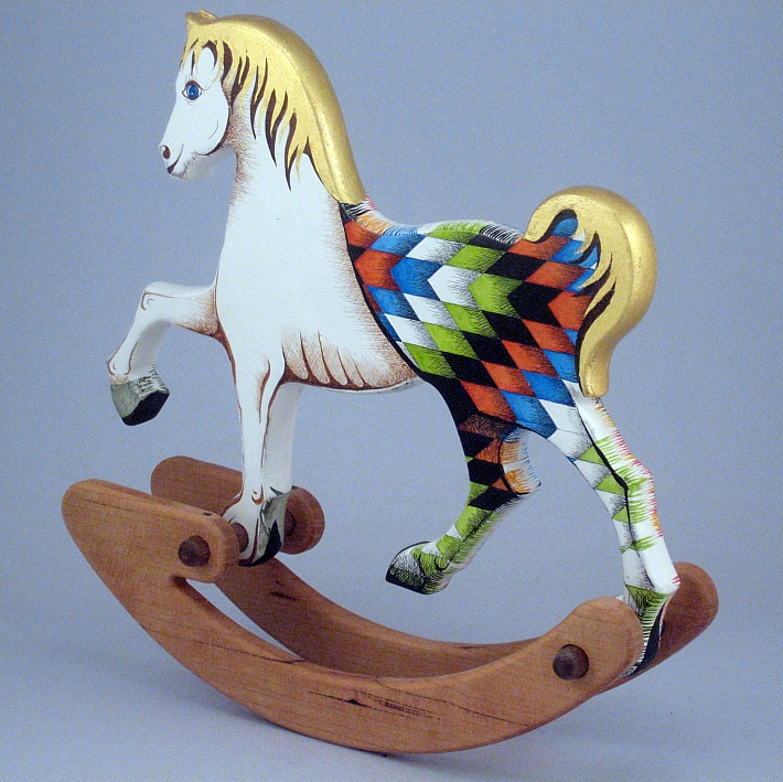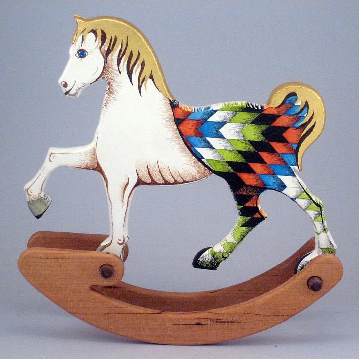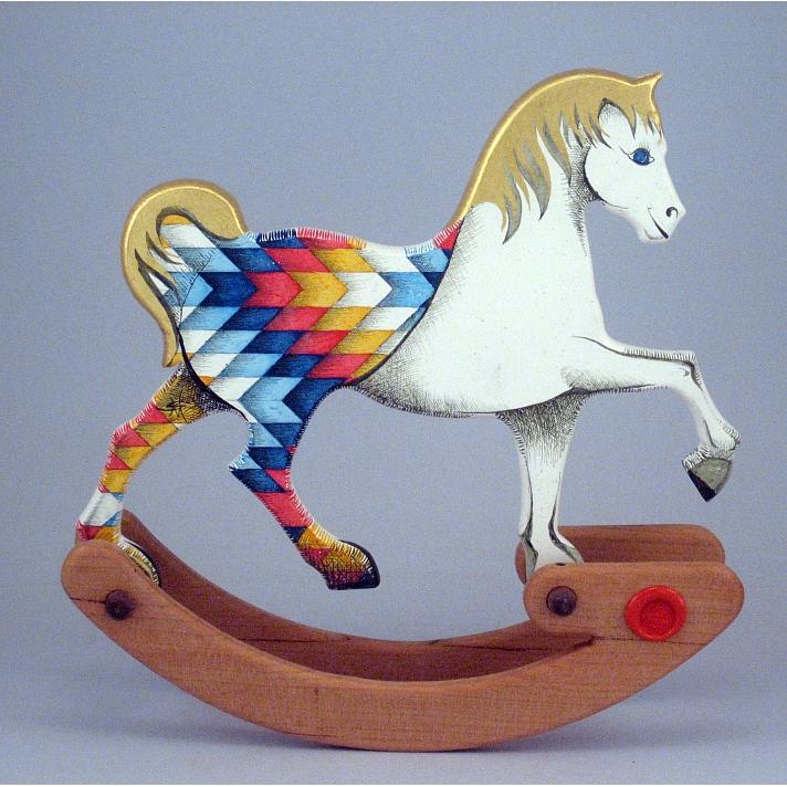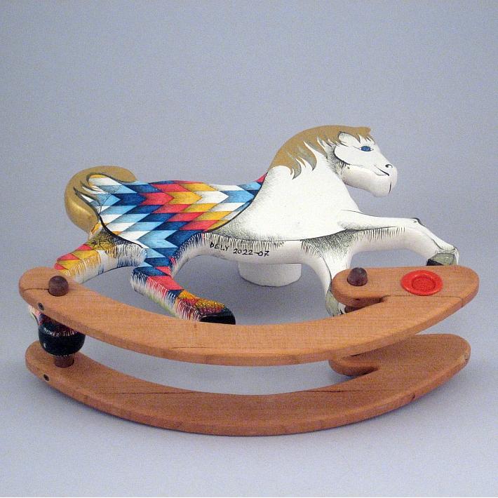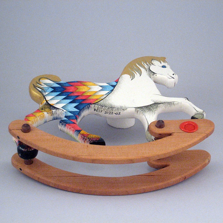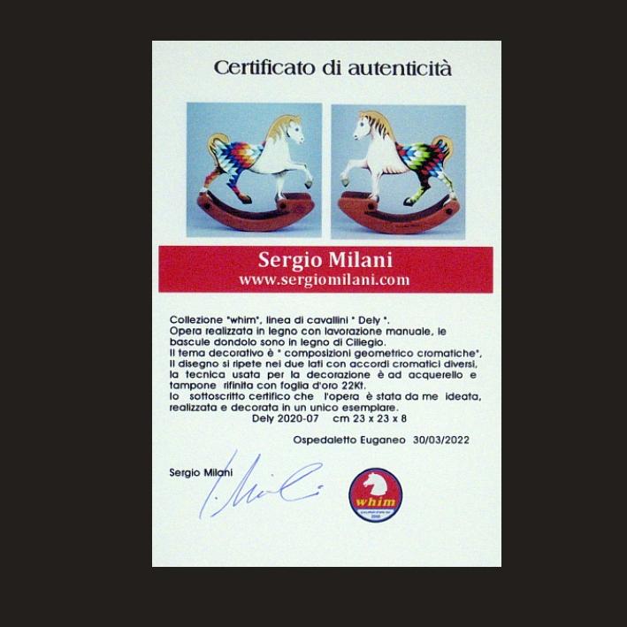 Giocattoli d'arte del maestro Sergio Milani - collezione "whim" , linea "Dely". Dely 2022-07, ideato, costruito e dipinto in Italy - dimensioni cm 23 x 23 x 8 - peso Kg 0,300. La galleria Dely presenta cavallini con dondolo, sono realizzati completamente in legno con lavorazione manuale, le bascule dondolo sono realizzate in legno pregiato a vista, il cavallino è preparato alla decorazione con un fondo bianco specifico. Il tema decorativo dedicato a questa linea è "Geometrie cromatiche", con due immagini diverse una per lato, aventi lo stesso disegno ma composizione cromatica differente. La tecnica è eseguita con colori ad acquerello variamente diluito e tamponato e finiture in foglia d'oro 22 Kt. L'opera è accompagnata da un certificato di autenticità, con dichiarazione di opera unica, foto, numero di catalogo e firma dell'artista.