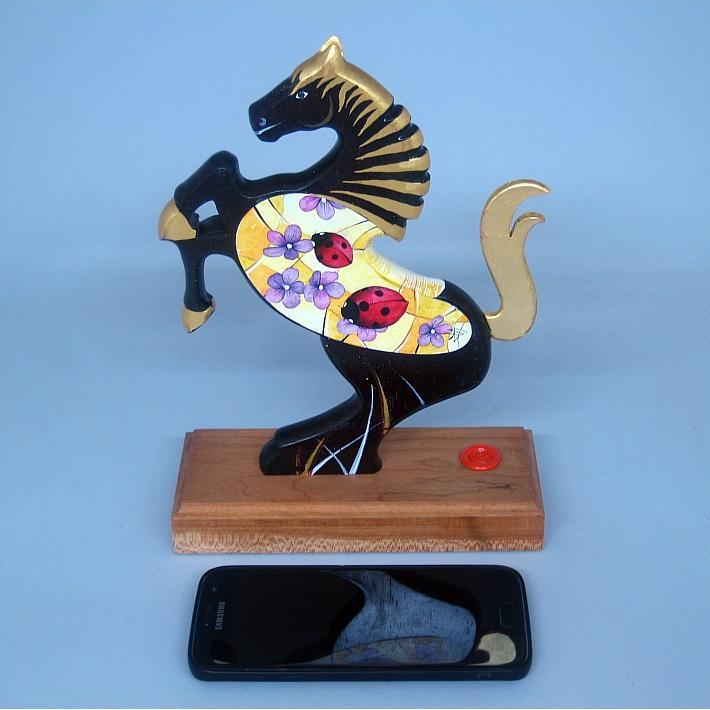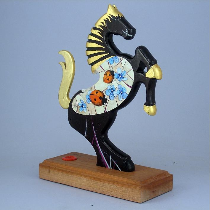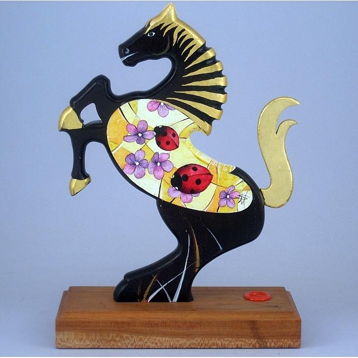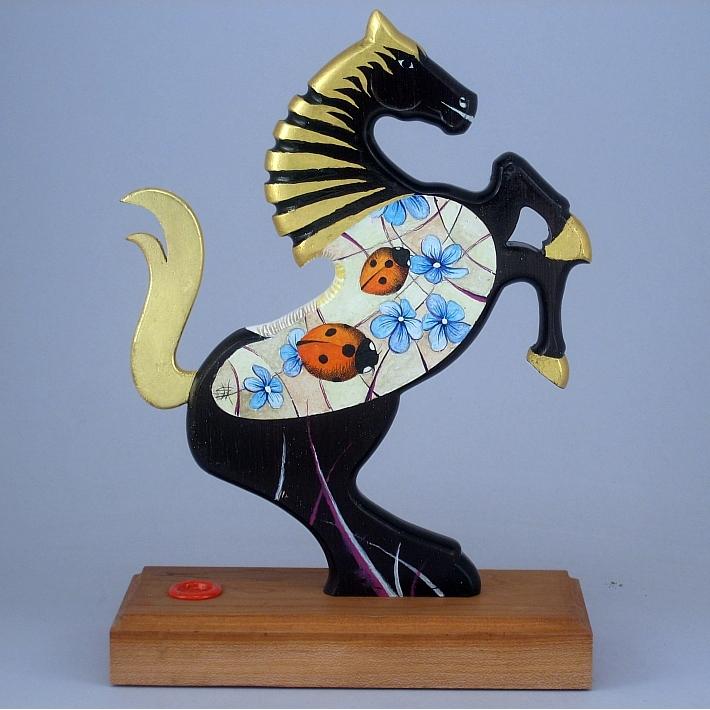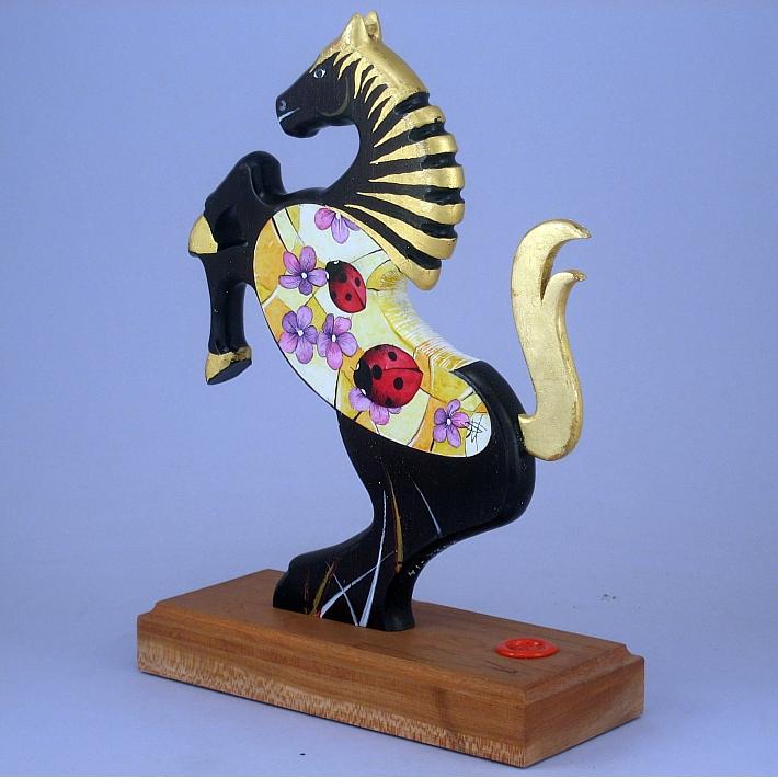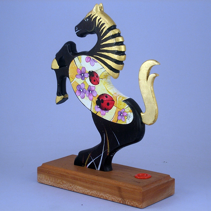 Il cavallino della linea Brisk è realizzato completamente in legno pregiato, può assumere anche la funzione di reggilibri, il corpo del cavallino è preparato alla pittura con un fondo bianco specifico. Il tema decorativo dedicato a questa linea è "Gli insetti", sviluppato con due immagini una per lato aventi lo stesso disegno ma composizione cromatica diversa, la decorazione è eseguita con colori ad acquerello variamente diluiti e tamponati con finiture in foglia d'oro 22Kt. L'opera è autenticata con sigillo in cera lacca e accompagnata da un certificato di autenticità, con dichiarazione di opera unica, foto, numero di catalogo e firma dell'artista. Dal 2000 realizzo "giocattoli d'arte" opere di nicchia create con amore e dedizione nella cura dei particolari. Ogni giocattolo della collezione " whim " è un'opera unica e irripetibile, deve possedere una propria dinamica o funzione di gioco, una minuziosa ed elaborata decorazione con finiture in foglia d'oro, un'insieme di caratteristiche che evidenziano un'opera dai contenuti conoscitivi, educativi e culturali propri di un'opera d'arte. Quindi un'opera d'arte da collezione, un interessante oggetto d'arredo, un regalo originale, il ricordo di un momento di vita importante, un'opera che da vita, colore, luce e prestigio alla stanza, per alcuni può considerarsi un talismano per la vita, ma può anche assumere l'importante funzione di giocattolo ludico-educativo, un riferimento culturale per il bambino, un invito rivolto all'adulto per educare il bambino all'arte, a capire amare e rispettare oggetti di valore. Mi è sembrata infine un'idea molto interessante trasformare un giocattolo in un quadro o una scultura, sviluppando argomenti specifici riferiti alla natura e al mondo dell'arte.