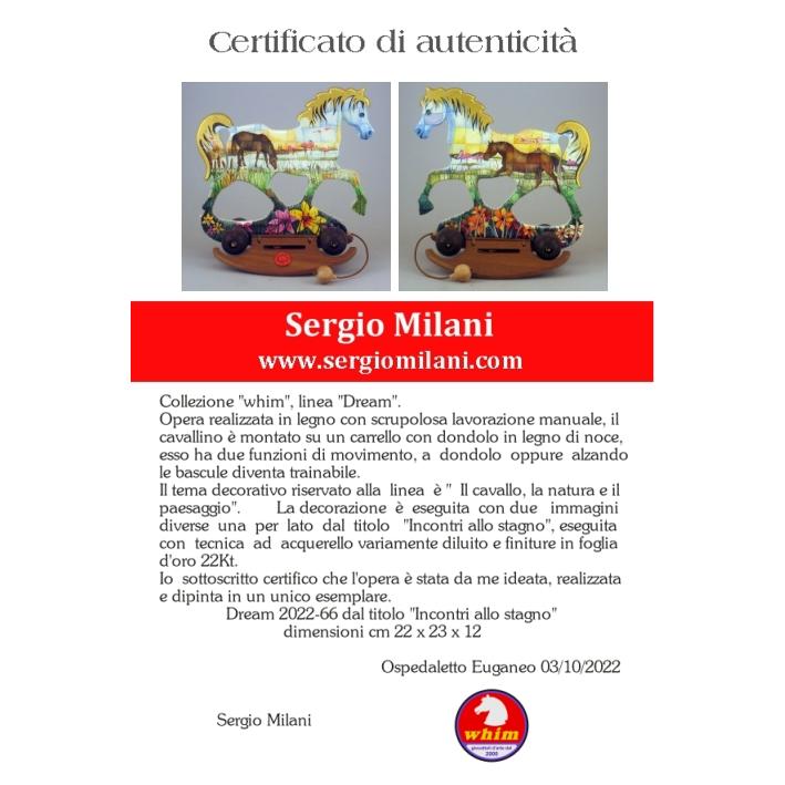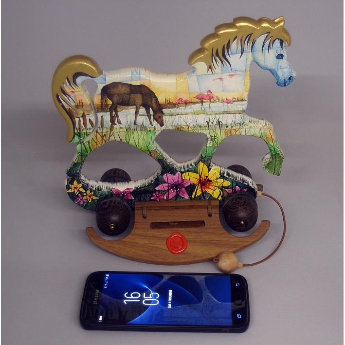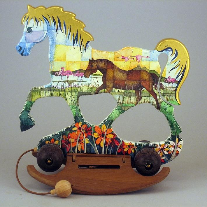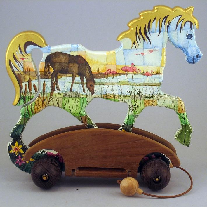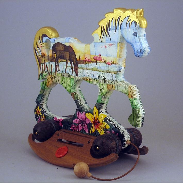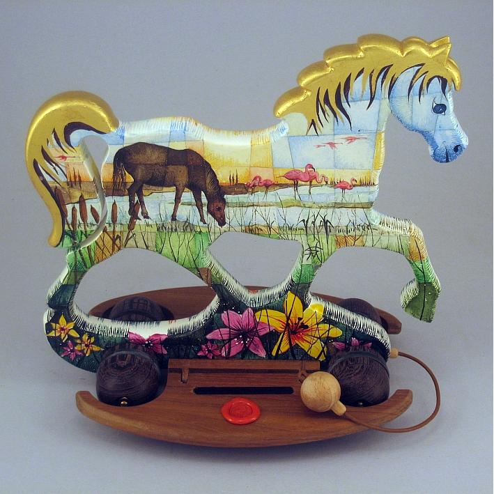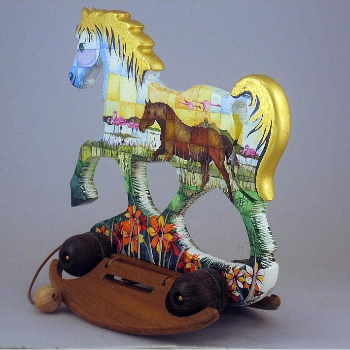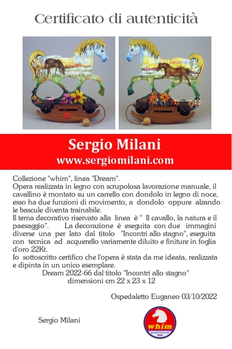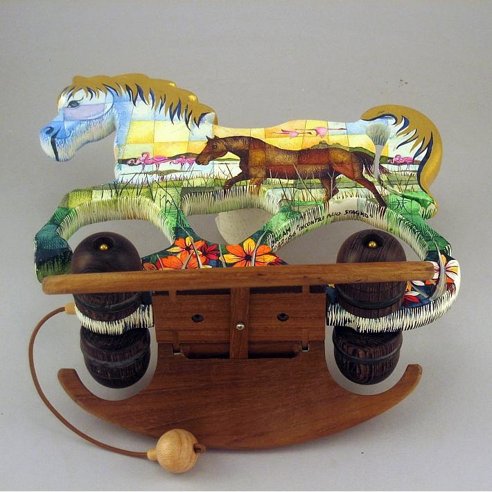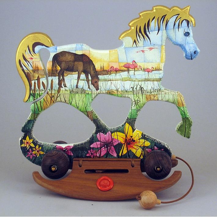 Opera realizzata in legno con scrupolosa lavorazione manuale, il cavallino è montato su un carrello in noce, esso ha due funzioni di movimento, a dondolo oppure alzando le bascule diventa trainabile.