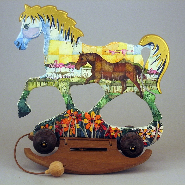 Giocattoli d'arte da collezione, realizzati con legni pregiati, dipinti ad acquerello variamente diluito e tampone con finiture in foglia d'oro 22Kt. Sono tutti pezzi unici, numerati e catalogati, forniti di certificato di produzione firmato dall'artista e sigillati con logo in cera lacca. Ideali per il collezionista, per un regalo di prestigio, per l'arredamento, opere rivolte a bambini e ragazzi come forma educativa per avvicinarli all'arte. Collectible art toys made of precious wood, painted with watercolor and swab with 22Kt gold leaf finishes. They are all unique pieces, numbered and cataloged, provided with a production certificate signed by the artist and sealed with lacquer wax logo. Ideal for the collector, for a prestigious gift, for furnishings, works directed at children and teens as an educational form to bring them closer to art.