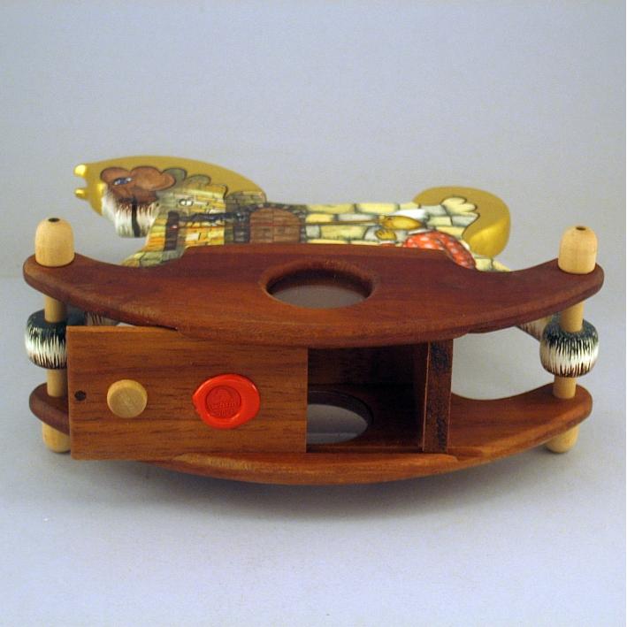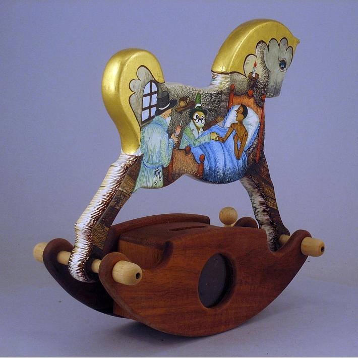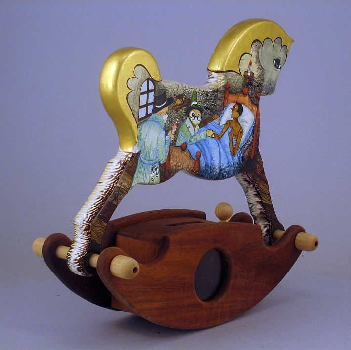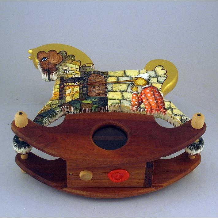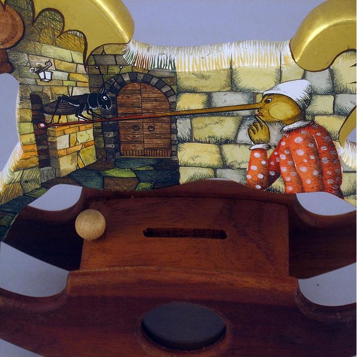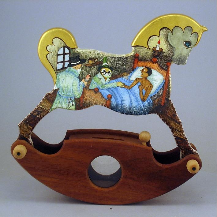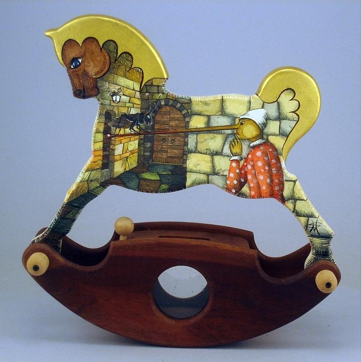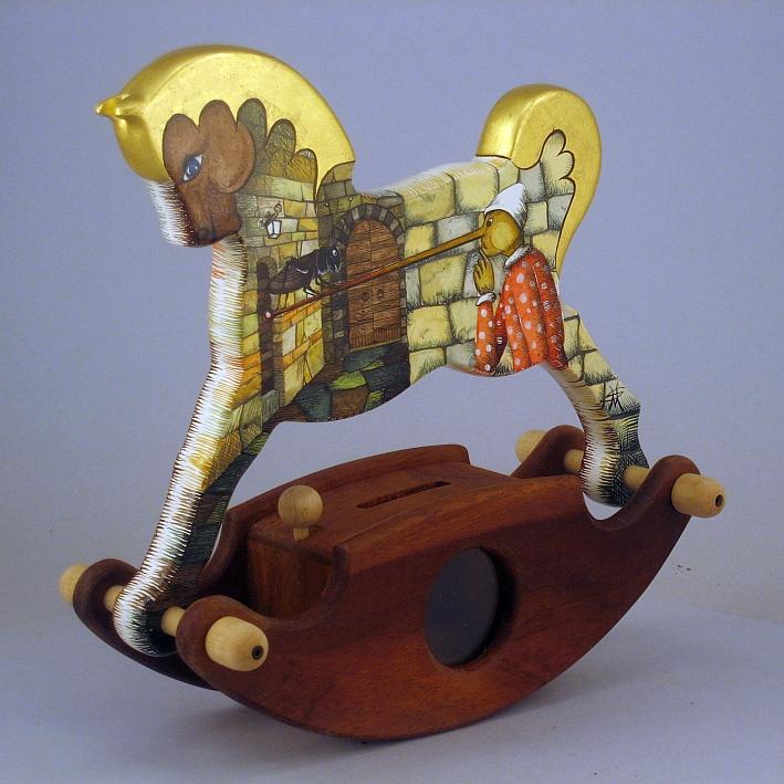 Giocattoli d'arte da collezione, realizzati con legni pregiati, dipinti ad acquerello variamente diluito e tampone con finiture in foglia d'oro 22Kt. Sono tutti pezzi unici, numerati e catalogati, forniti di certificato di produzione firmato dall'artista e sigillati con logo in cera lacca. Ideali per il collezionista, per un regalo di prestigio, per l'arredamento, opere rivolte a bambini e ragazzi come forma educativa per avvicinarli all'arte. Collectible art toys made of precious wood, painted with watercolor and swab with 22Kt gold leaf finishes. They are all unique pieces, numbered and cataloged, provided with a production certificate signed by the artist and sealed with lacquer wax logo. Ideal for the collector, for a prestigious gift, for furnishings, works directed at children and teens as an educational form to bring them closer to art.