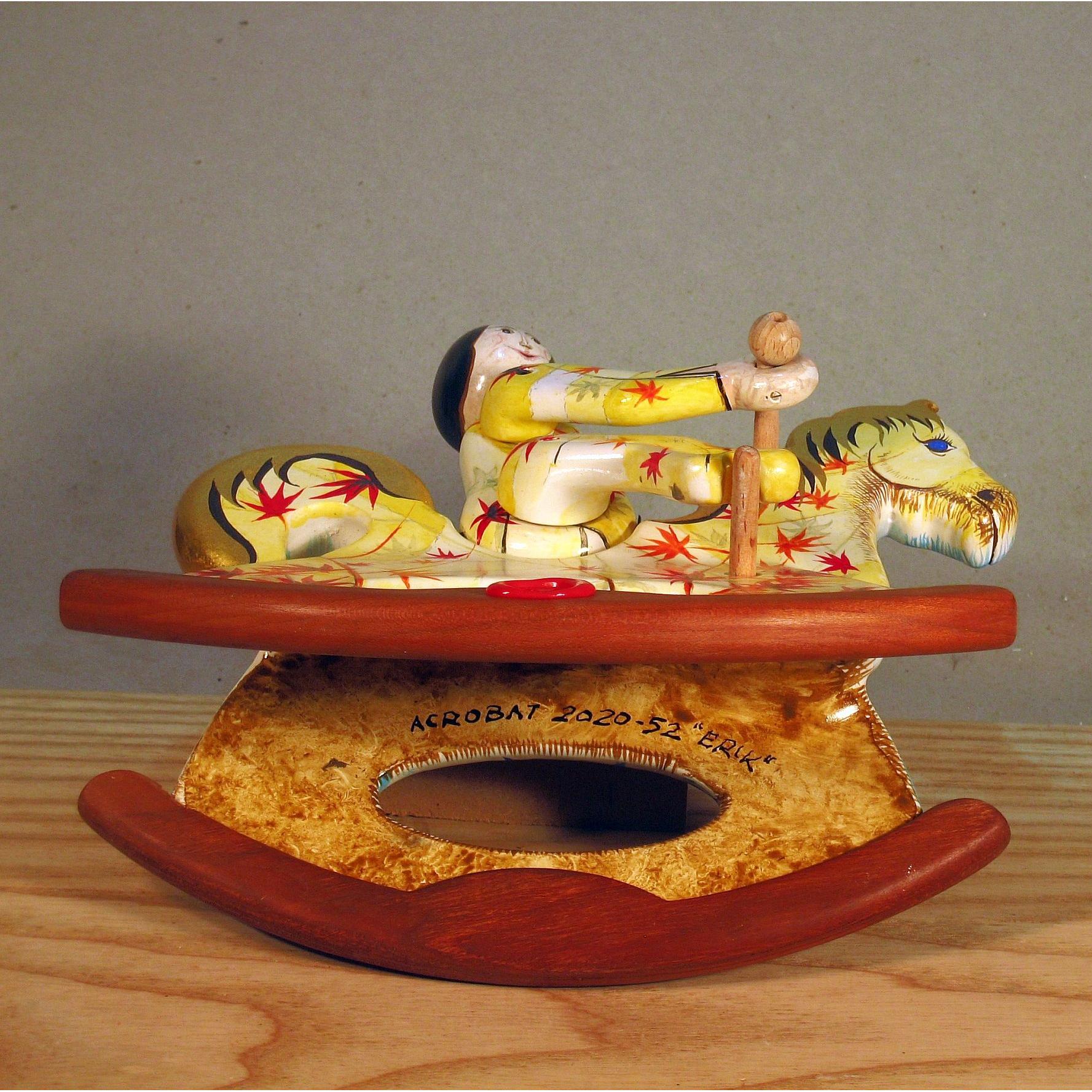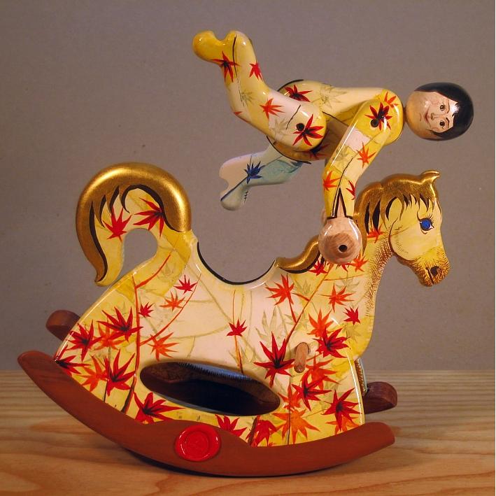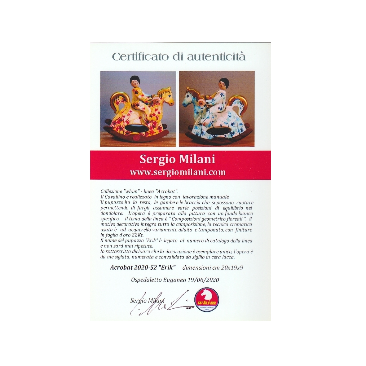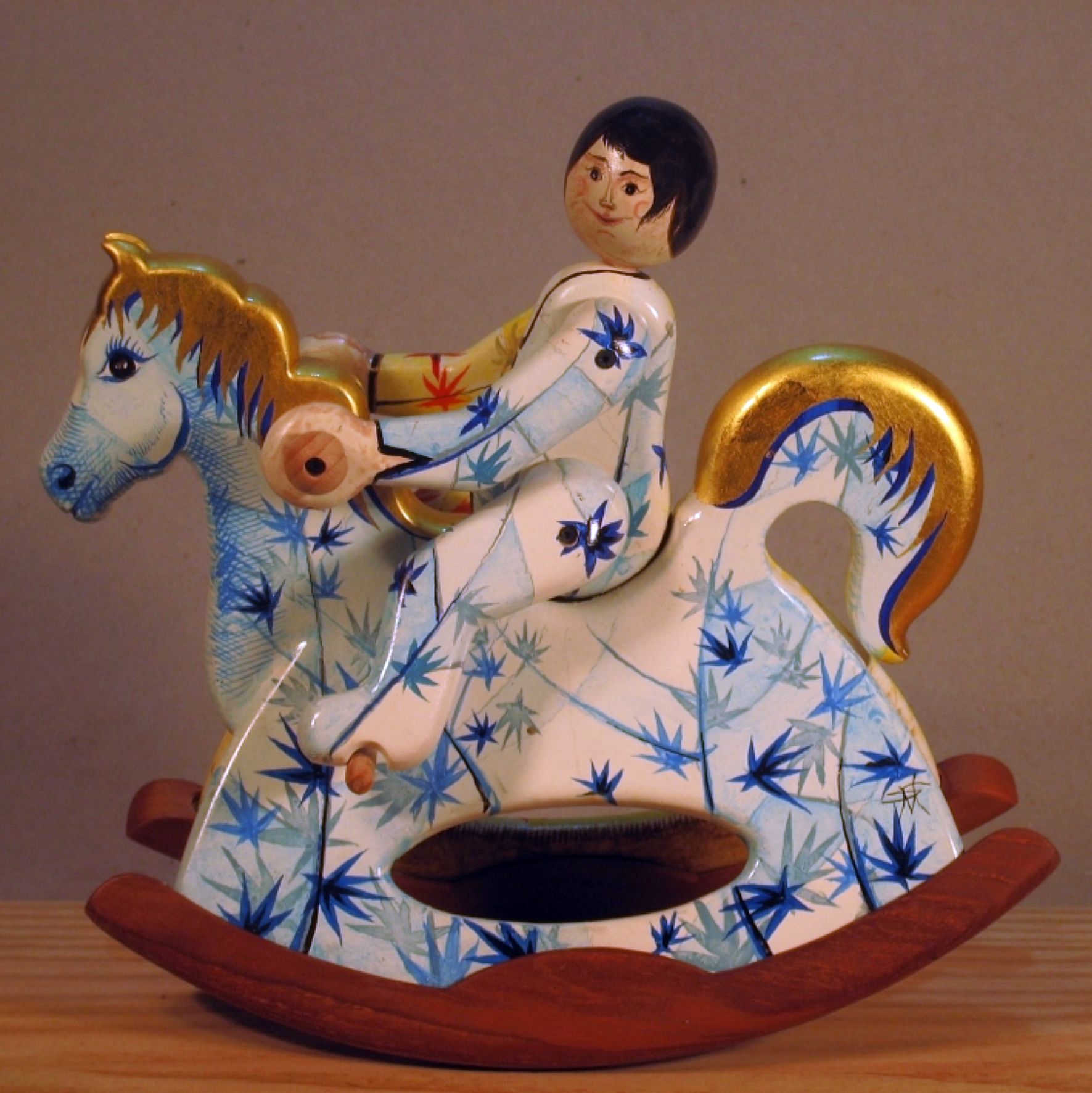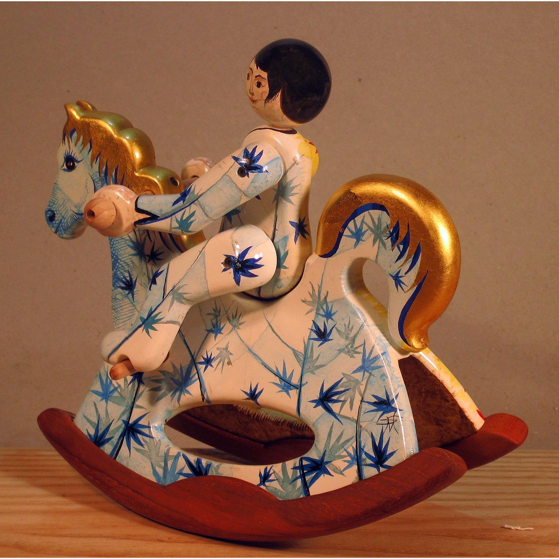 Giocattoli d'arte da collezione, realizzati con legni pregiati, dipinti ad acquerello variamente diluito e tampone con finiture in foglia d'oro 22Kt. Sono tutti pezzi unici, numerati e catalogati, forniti di certificato di produzione firmato dall'artista e sigillati con logo in cera lacca. Ideali per il collezionista, per un regalo di prestigio, per l'arredamento, opere rivolte a bambini e ragazzi come forma educativa per avvicinarli all'arte. Collectible art toys made of precious wood, painted with watercolor and swab with 22Kt gold leaf finishes. They are all unique pieces, numbered and cataloged, provided with a production certificate signed by the artist and sealed with lacquer wax logo. Ideal for the collector, for a prestigious gift, for furnishings, works directed at children and teens as an educational form to bring them closer to art.