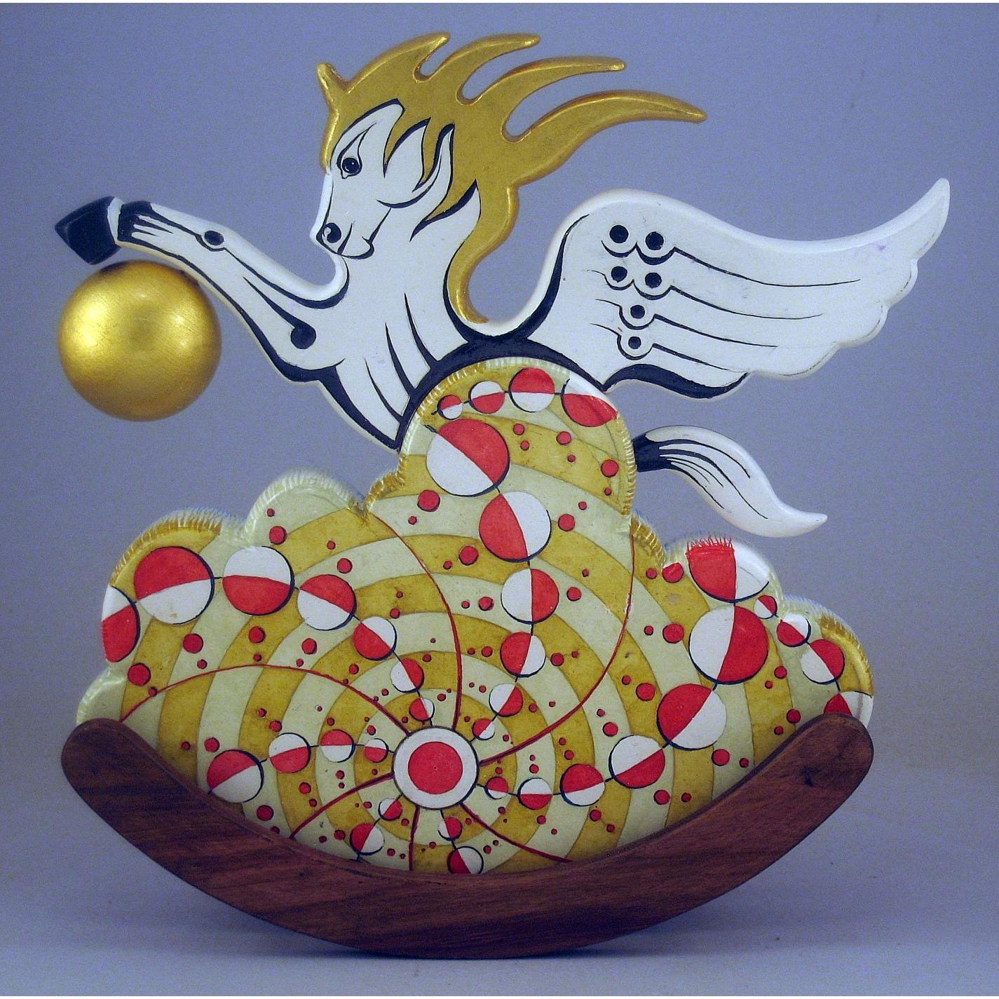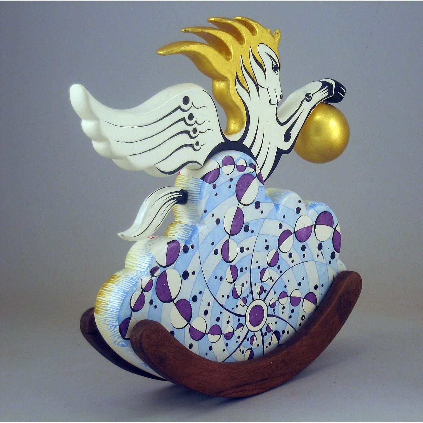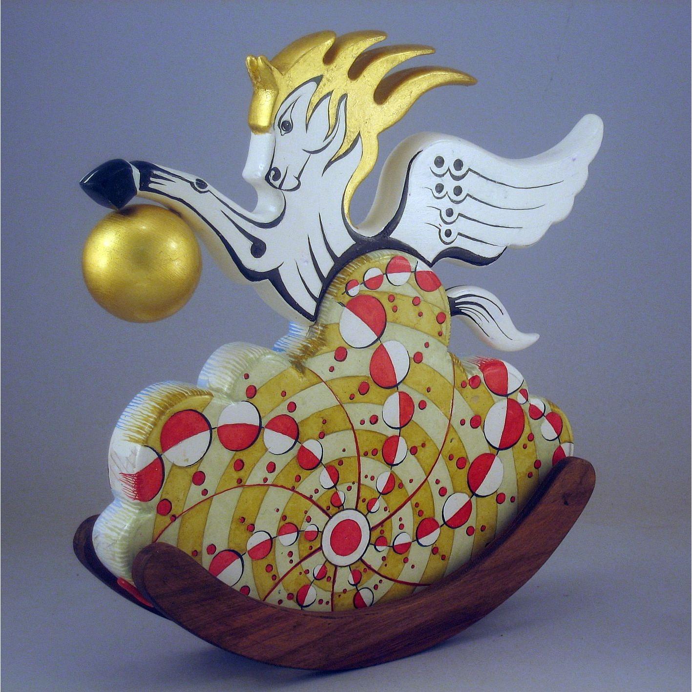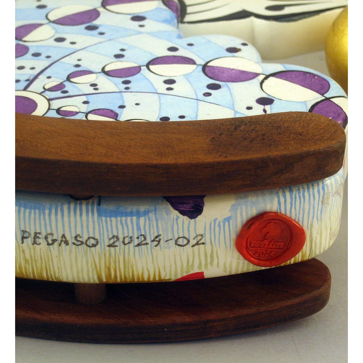 Collezione "whim", linea "Pegaso"."Pegaso 2024-02". L'opera è eseguita in legno con meticolosa lavorazione manuale, essa è montata su una base a dondolo in legno di noce. Il tema decorativo è " Sfere di luce e cerchi nel grano", Interpretazione del cerchio nel grano apparso il 12 agosto 2001 a White Horse, Milk Hill, Wiltshire, Regno Unito.il cavallo Pegaso uscendo da una nube si avvicina alla sfera di luce che ha creato l'immagine geometrica.La tecnica è realizzata ad acquerello variamente diluito con finiture in foglia d'oro 22 Kt.