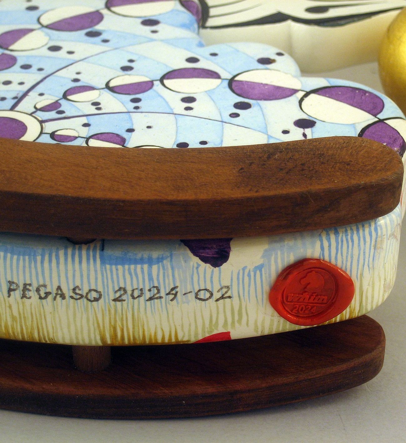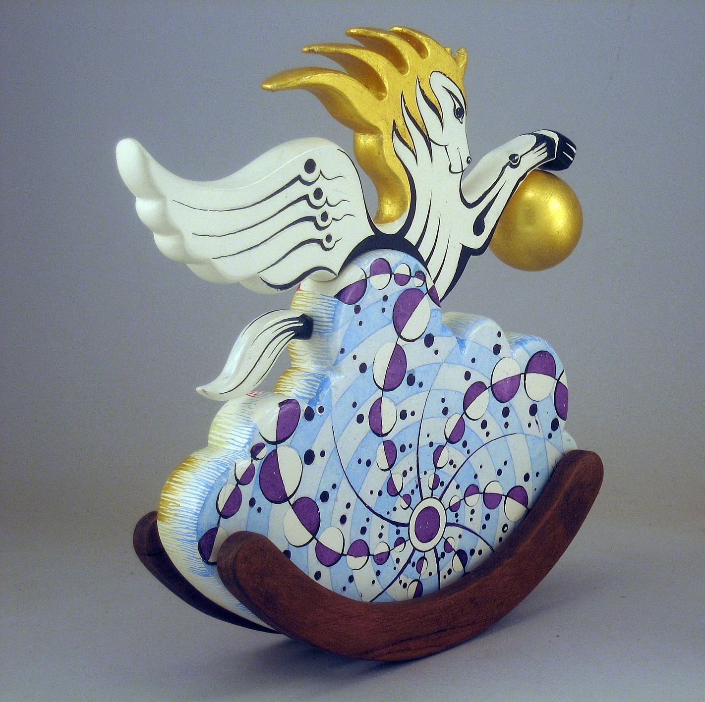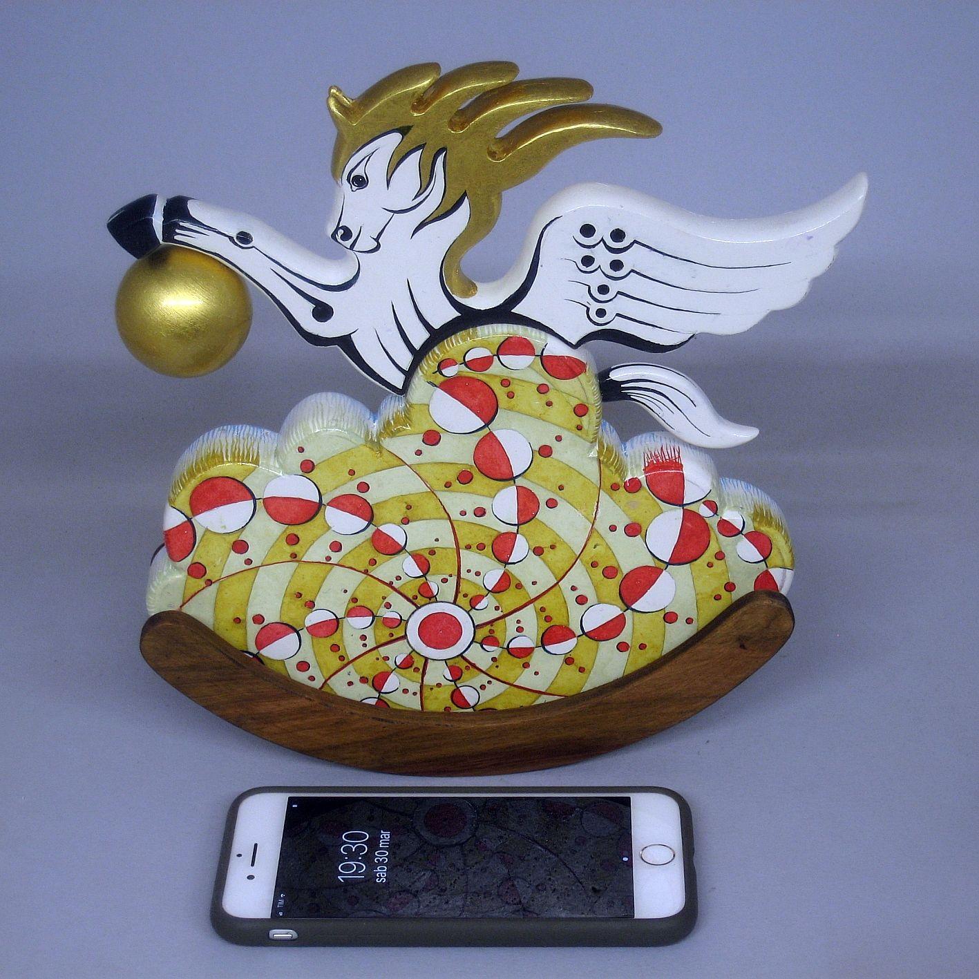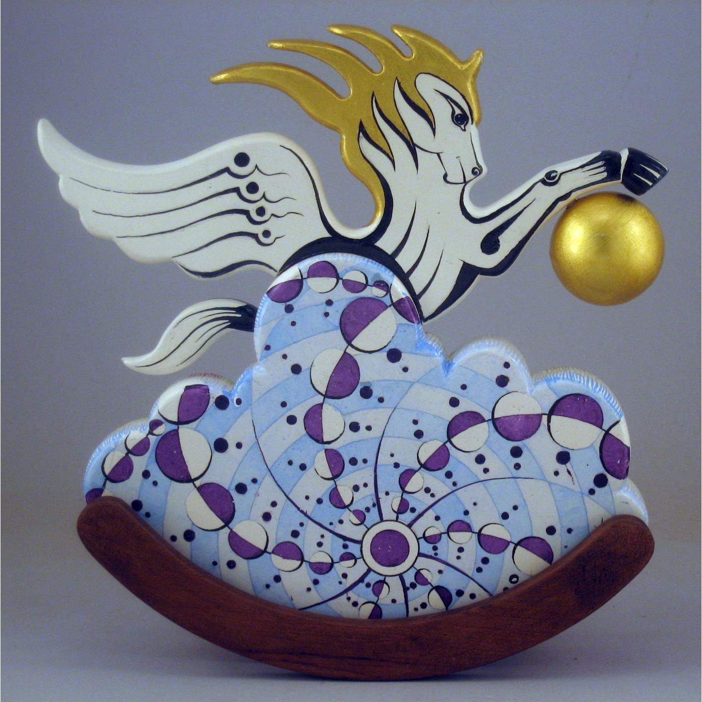 Collezione "whim", linea "Pegaso"."Pegaso 2024-02". L'opera è eseguita in legno con meticolosa lavorazione manuale, essa è montata su una base a dondolo in legno di noce. Il tema decorativo è " Sfere di luce e cerchi nel grano", Interpretazione del cerchio nel grano apparso il 12 agosto 2001 a White Horse, Milk Hill, Wiltshire, Regno Unito.il cavallo Pegaso uscendo da una nube si avvicina alla sfera di luce che ha creato l'immagine geometrica.La tecnica è realizzata ad acquerello variamente diluito con finiture in foglia d'oro 22 Kt.