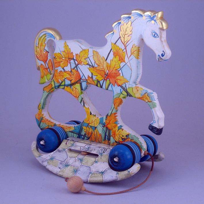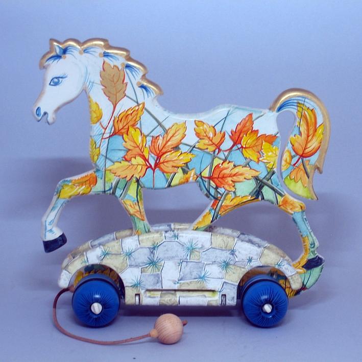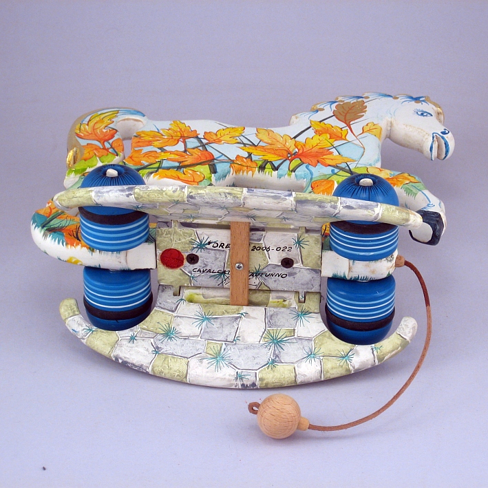 Il cavallo della linea Dream è un dondolo che si può trasformare in trainabile. E' realizzato manualmente in legno, il tema decorativo è, " la natura, il paesaggio e il cavallo ", la pittura è applicata su fondo bianco specifico per legno. La decorazione, che si sviluppa con due scene una per lato del cavallino, è realizzata con tecnica ad acquerello variamente diluito e tamponato, criniera e coda sono rifinite con foglia d'oro 22 kt. L'opera è punzonata con sigillo in cera lacca ed è corredata da un certificato di autenticazione con foto, numero di catalogo, dichiarazione di opera unica e firma dell'artista.