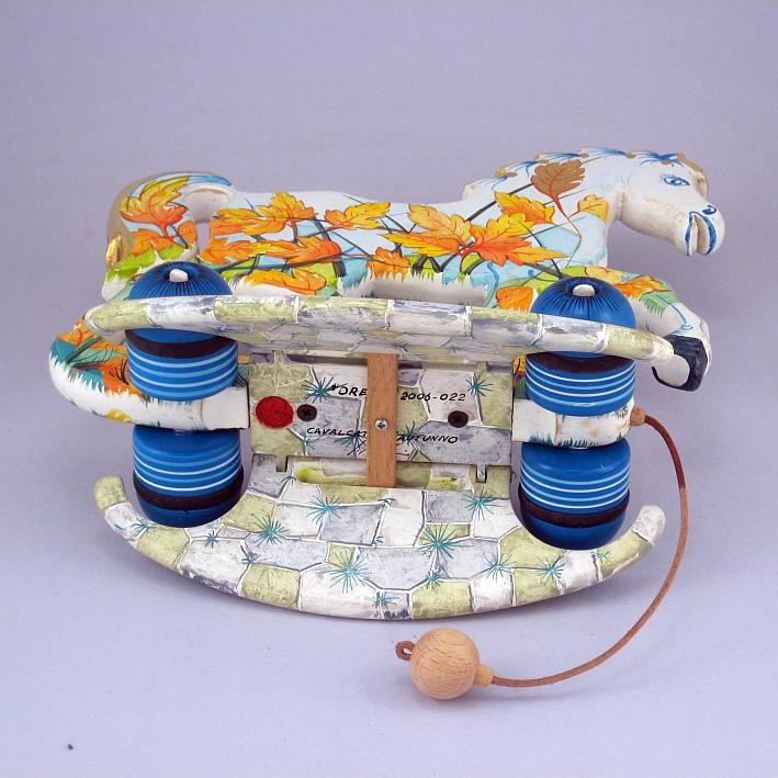 Giocattoli d'arte da collezione, realizzati con legni pregiati, dipinti ad acquerello variamente diluito e tampone con finiture in foglia d'oro 22Kt. Sono tutti pezzi unici, numerati e catalogati, forniti di certificato di produzione firmato dall'artista e sigillati con logo in cera lacca. Ideali per il collezionista, per un regalo di prestigio, per l'arredamento, opere rivolte a bambini e ragazzi come forma educativa per avvicinarli all'arte. Collectible art toys made of precious wood, painted with watercolor and swab with 22Kt gold leaf finishes. They are all unique pieces, numbered and cataloged, provided with a production certificate signed by the artist and sealed with lacquer wax logo. Ideal for the collector, for a prestigious gift, for furnishings, works directed at children and teens as an educational form to bring them closer to art.