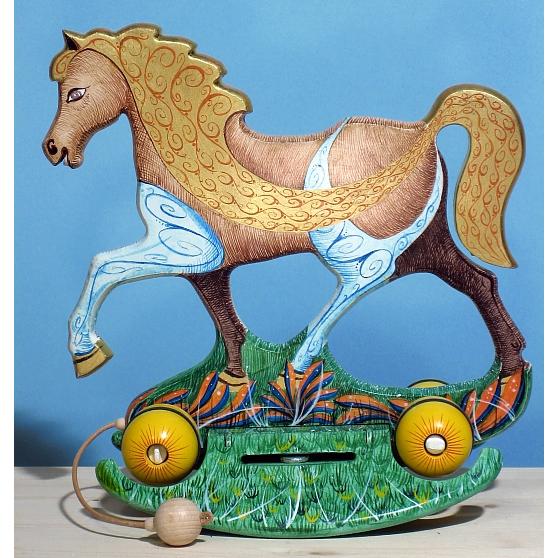 Giocattoli d'arte da collezione, realizzati con legni pregiati, dipinti ad acquerello variamente diluito e tampone con finiture in foglia d'oro 22Kt. Sono tutti pezzi unici, numerati e catalogati, forniti di certificato di produzione firmato dall'artista e sigillati con logo in cera lacca. Ideali per il collezionista, per un regalo di prestigio, per l'arredamento, opere rivolte a bambini e ragazzi come forma educativa per avvicinarli all'arte. Collectible art toys made of precious wood, painted with watercolor and swab with 22Kt gold leaf finishes. They are all unique pieces, numbered and cataloged, provided with a production certificate signed by the artist and sealed with lacquer wax logo. Ideal for the collector, for a prestigious gift, for furnishings, works directed at children and teens as an educational form to bring them closer to art.