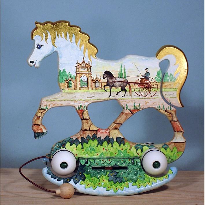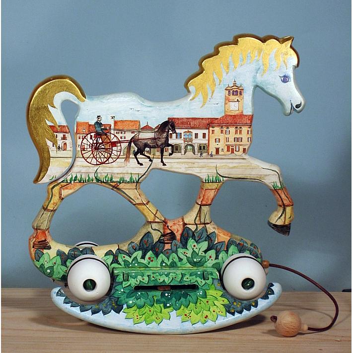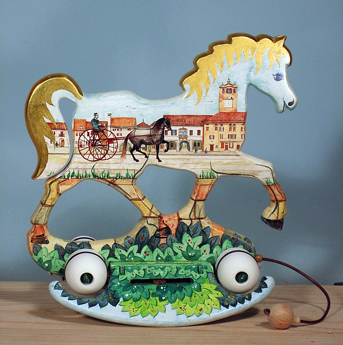 Giocattoli d'arte da collezione, realizzati con legni pregiati, dipinti ad acquerello variamente diluito e tampone con finiture in foglia d'oro 22Kt. Sono tutti pezzi unici, numerati e catalogati, forniti di certificato di produzione firmato dall'artista e sigillati con logo in cera lacca. Ideali per il collezionista, per un regalo di prestigio, per l'arredamento, opere rivolte a bambini e ragazzi come forma educativa per avvicinarli all'arte. Collectible art toys made of precious wood, painted with watercolor and swab with 22Kt gold leaf finishes. They are all unique pieces, numbered and cataloged, provided with a production certificate signed by the artist and sealed with lacquer wax logo. Ideal for the collector, for a prestigious gift, for furnishings, works directed at children and teens as an educational form to bring them closer to art.