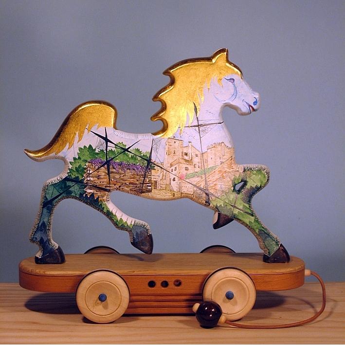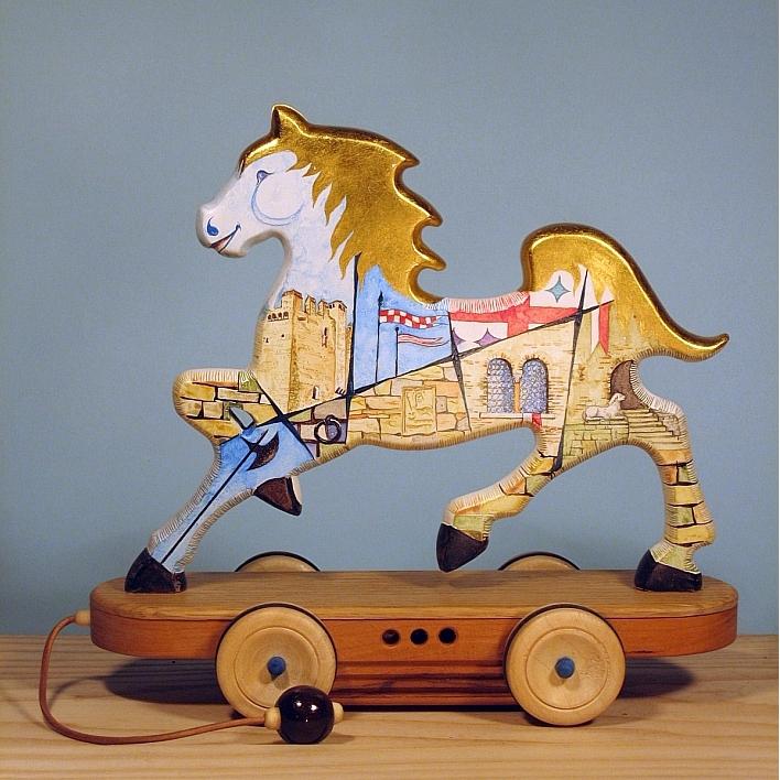 Giocattoli d'arte da collezione, realizzati con legni pregiati, dipinti ad acquerello variamente diluito e tampone con finiture in foglia d'oro 22Kt. Sono tutti pezzi unici, numerati e catalogati, forniti di certificato di produzione firmato dall'artista e sigillati con logo in cera lacca. Ideali per il collezionista, per un regalo di prestigio, per l'arredamento, opere rivolte a bambini e ragazzi come forma educativa per avvicinarli all'arte. Collectible art toys made of precious wood, painted with watercolor and swab with 22Kt gold leaf finishes. They are all unique pieces, numbered and cataloged, provided with a production certificate signed by the artist and sealed with lacquer wax logo. Ideal for the collector, for a prestigious gift, for furnishings, works directed at children and teens as an educational form to bring them closer to art.