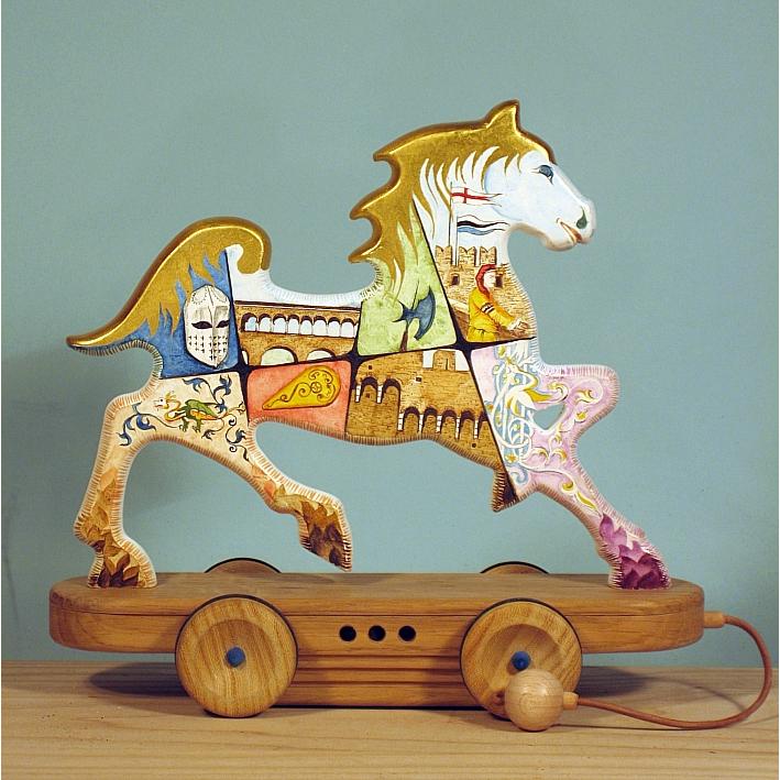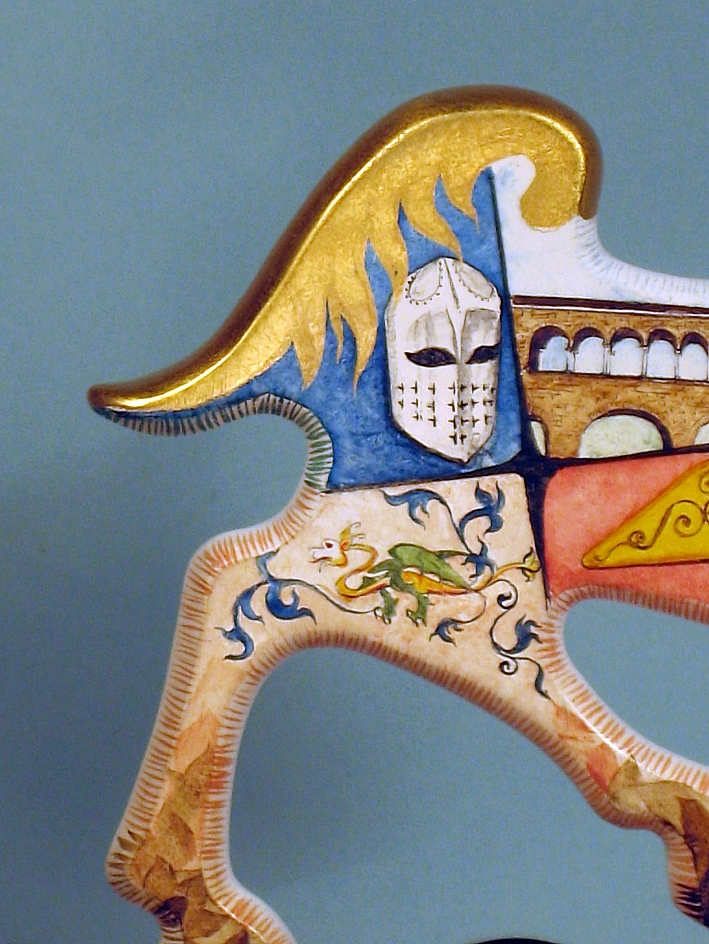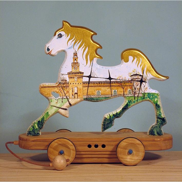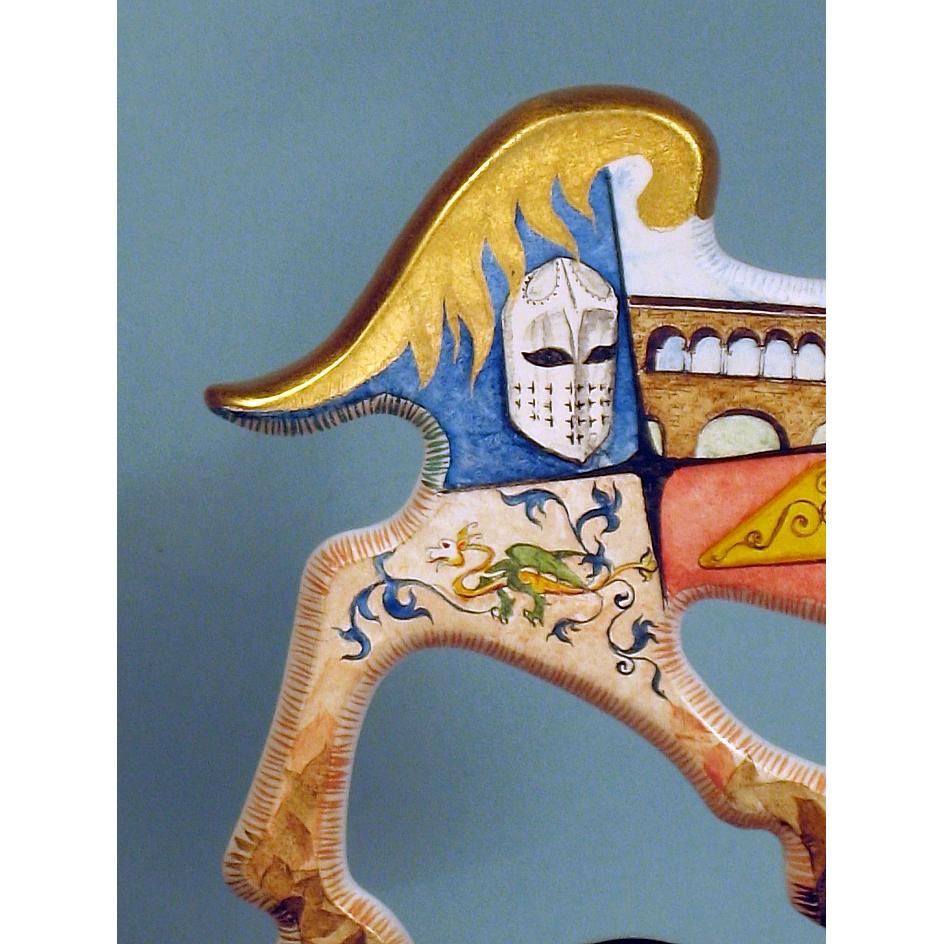 Giocattoli d'arte da collezione, realizzati con legni pregiati, dipinti ad acquerello variamente diluito e tampone con finiture in foglia d'oro 22Kt. Sono tutti pezzi unici, numerati e catalogati, forniti di certificato di produzione firmato dall'artista e sigillati con logo in cera lacca. Ideali per il collezionista, per un regalo di prestigio, per l'arredamento, opere rivolte a bambini e ragazzi come forma educativa per avvicinarli all'arte. Collectible art toys made of precious wood, painted with watercolor and swab with 22Kt gold leaf finishes. They are all unique pieces, numbered and cataloged, provided with a production certificate signed by the artist and sealed with lacquer wax logo. Ideal for the collector, for a prestigious gift, for furnishings, works directed at children and teens as an educational form to bring them closer to art.