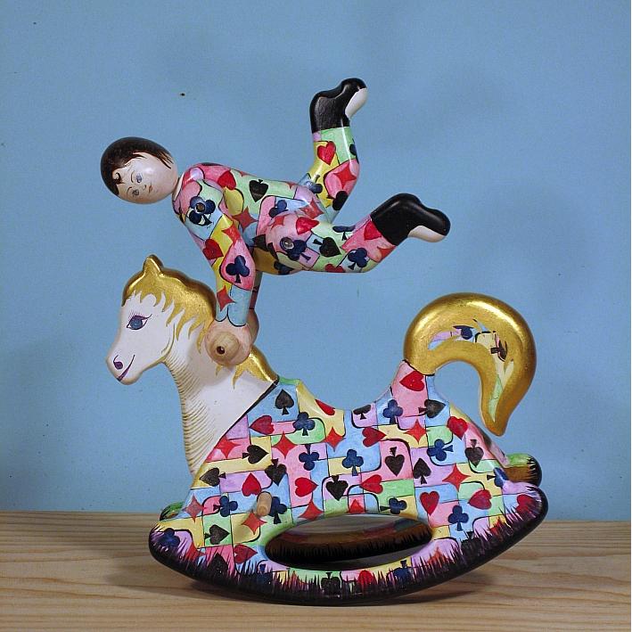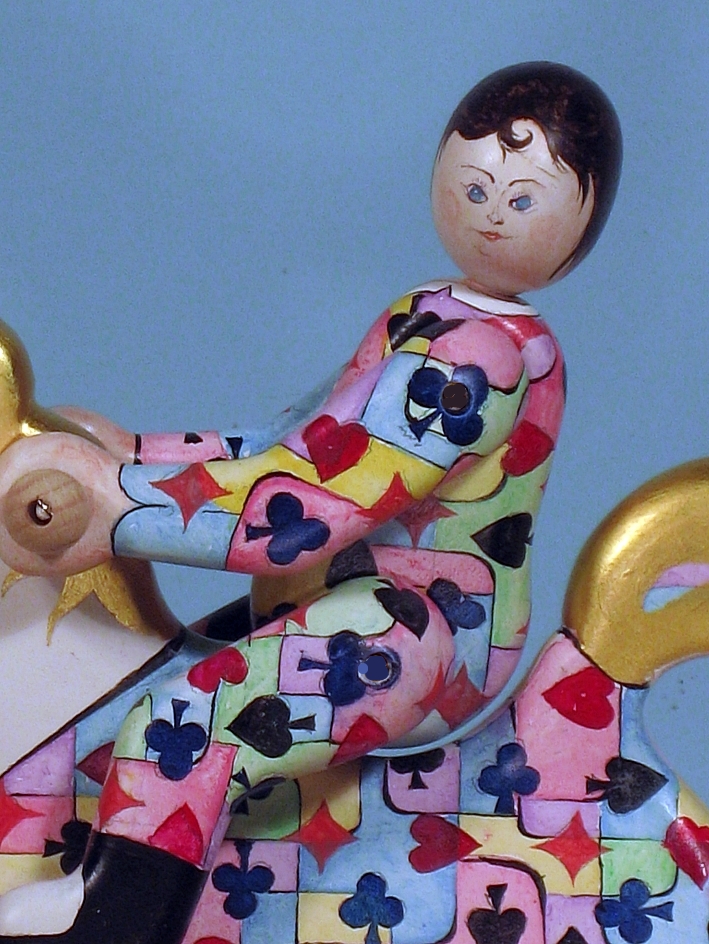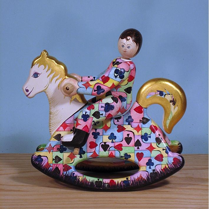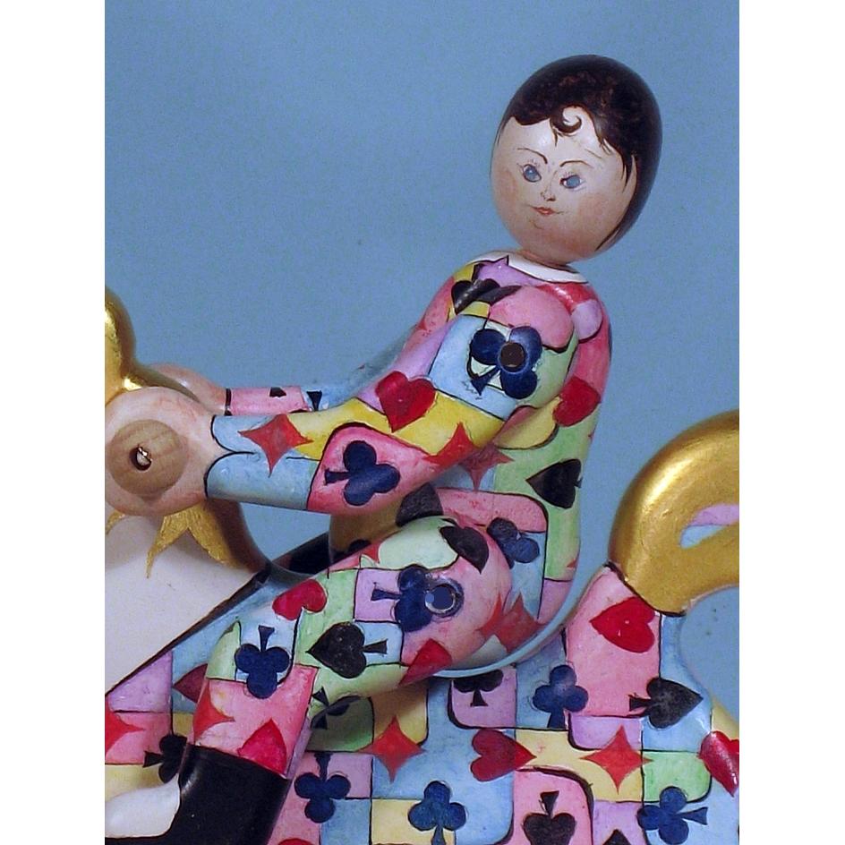 Giocattoli d'arte da collezione, realizzati con legni pregiati, dipinti ad acquerello variamente diluito e tampone con finiture in foglia d'oro 22Kt. Sono tutti pezzi unici, numerati e catalogati, forniti di certificato di produzione firmato dall'artista e sigillati con logo in cera lacca. Ideali per il collezionista, per un regalo di prestigio, per l'arredamento, opere rivolte a bambini e ragazzi come forma educativa per avvicinarli all'arte. Collectible art toys made of precious wood, painted with watercolor and swab with 22Kt gold leaf finishes. They are all unique pieces, numbered and cataloged, provided with a production certificate signed by the artist and sealed with lacquer wax logo. Ideal for the collector, for a prestigious gift, for furnishings, works directed at children and teens as an educational form to bring them closer to art.