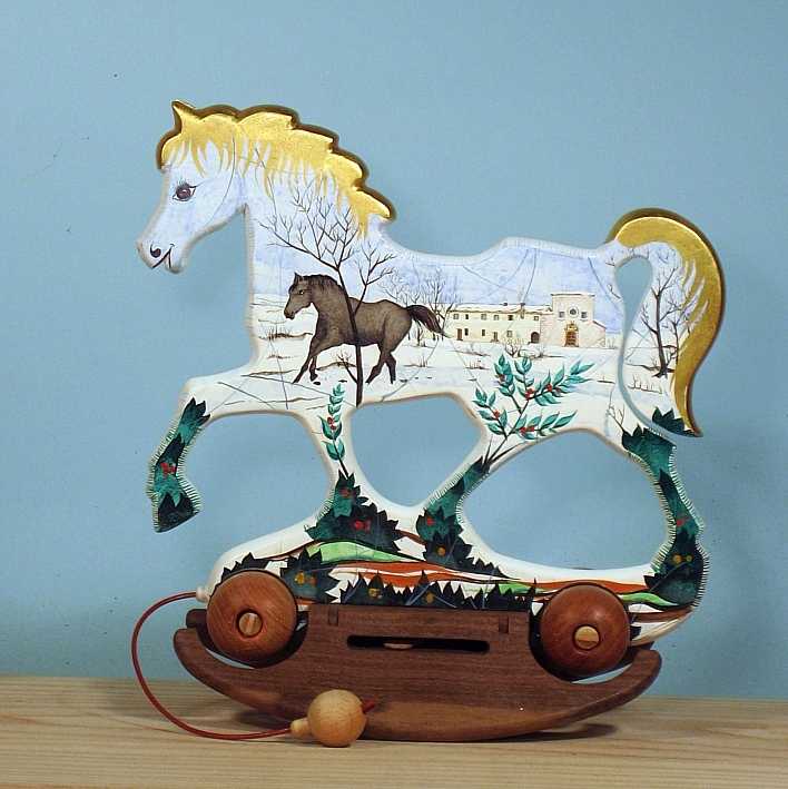 Giocattoli d'arte da collezione, realizzati con legni pregiati, dipinti ad acquerello variamente diluito e tampone con finiture in foglia d'oro 22Kt. Sono tutti pezzi unici, numerati e catalogati, forniti di certificato di produzione firmato dall'artista e sigillati con logo in cera lacca. Ideali per il collezionista, per un regalo di prestigio, per l'arredamento, opere rivolte a bambini e ragazzi come forma educativa per avvicinarli all'arte. Collectible art toys made of precious wood, painted with watercolor and swab with 22Kt gold leaf finishes. They are all unique pieces, numbered and cataloged, provided with a production certificate signed by the artist and sealed with lacquer wax logo. Ideal for the collector, for a prestigious gift, for furnishings, works directed at children and teens as an educational form to bring them closer to art.