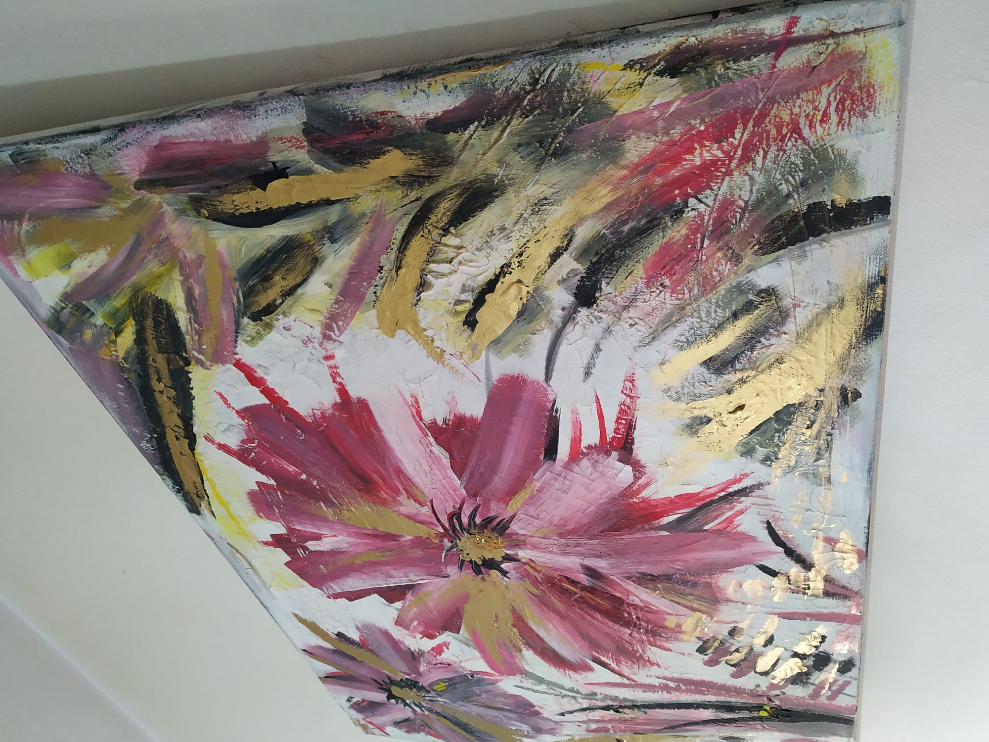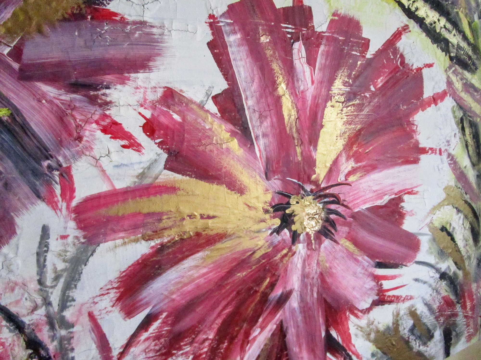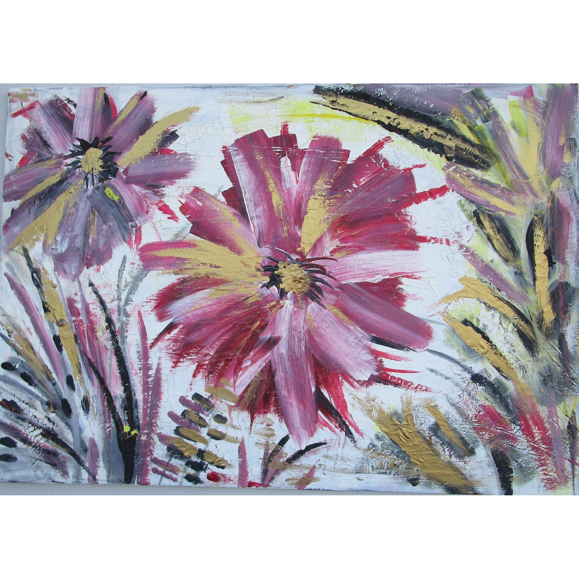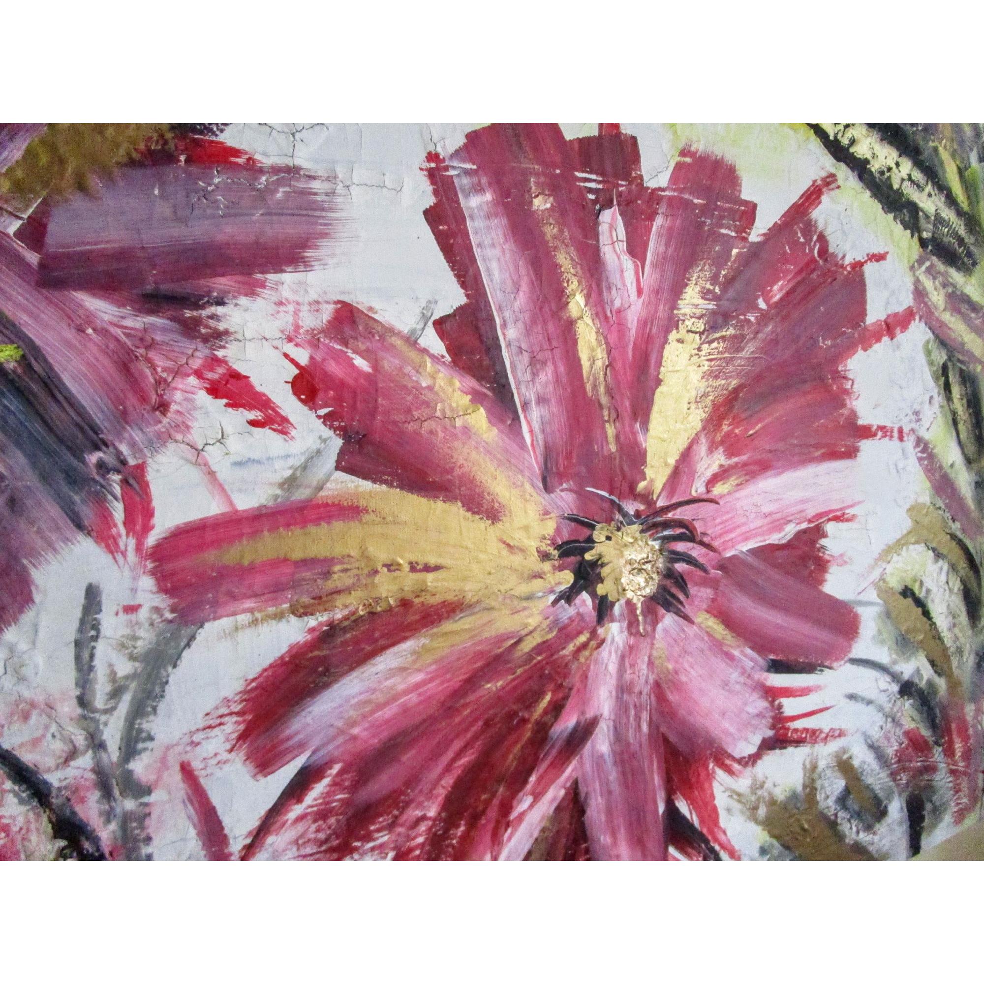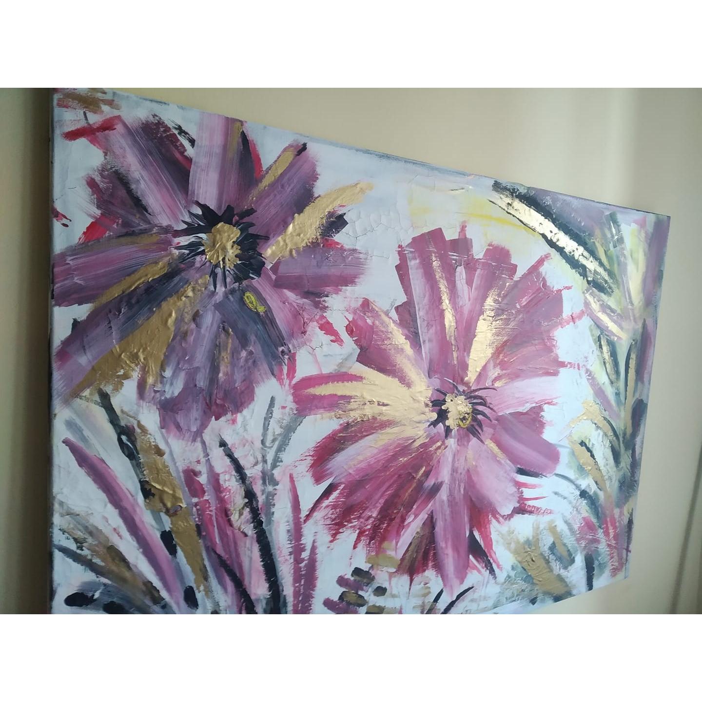 Energy la forza della vita, grandi fiori rigogliosi nel momento intenso della loro massima fioritura.Trasmettono energia, la forza della vita e la loro bellezza ringrazia l'esistenza stessa. Il dipinto ha una base di gesso che crea piccole crepe, pertanto il dipinto ha un effetto molto particolare.Il colore dorato fa riflettere il dipinto a seconda della luce della stanza e lo rende elegante.