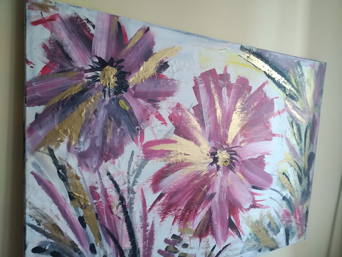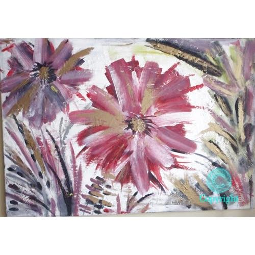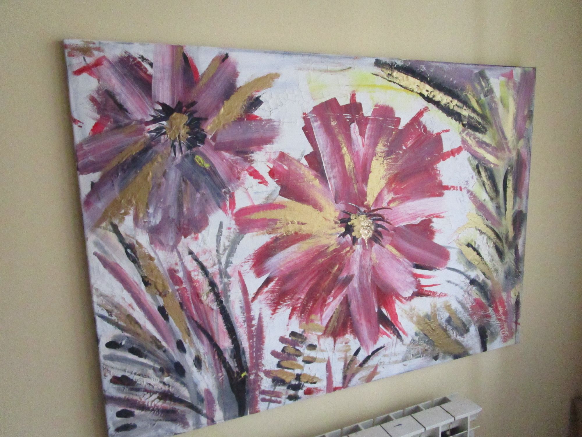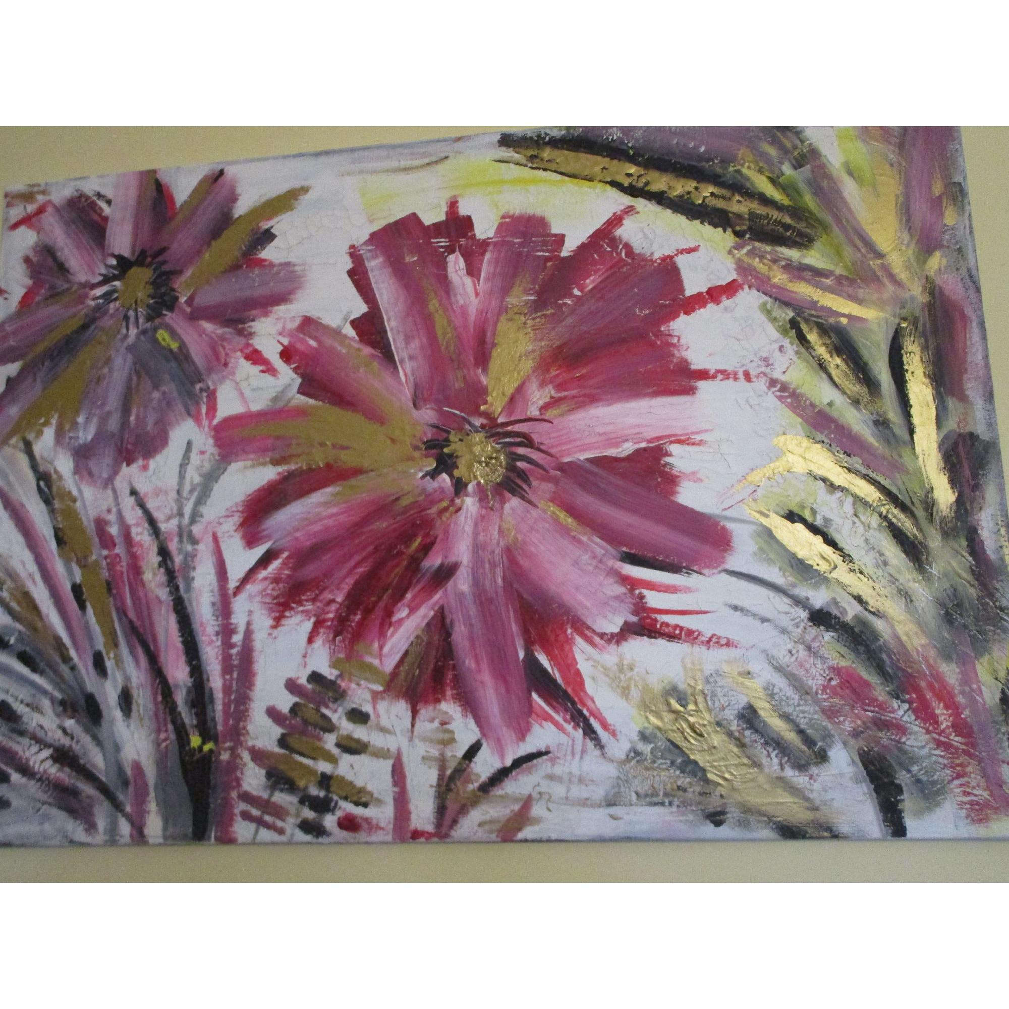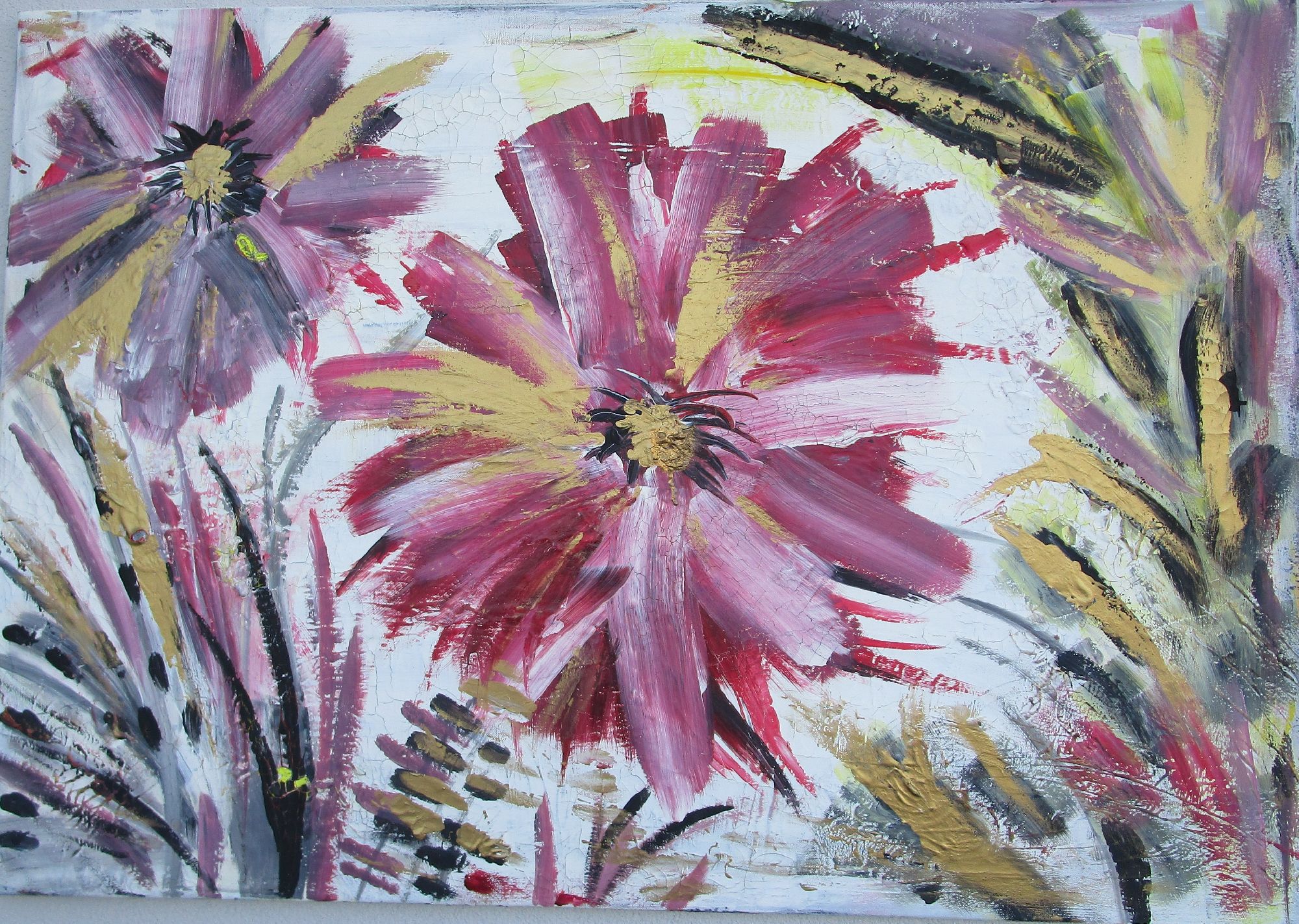 Energy la forza della vita, grandi fiori rigogliosi nel momento intenso della loro massima fioritura.Trasmettono energia, la forza della vita e la loro bellezza ringrazia l'esistenza stessa. Il dipinto ha una base di gesso che crea piccole crepe, pertanto il dipinto ha un effetto molto particolare.Il colore dorato fa riflettere il dipinto a seconda della luce della stanza e lo rende elegante.