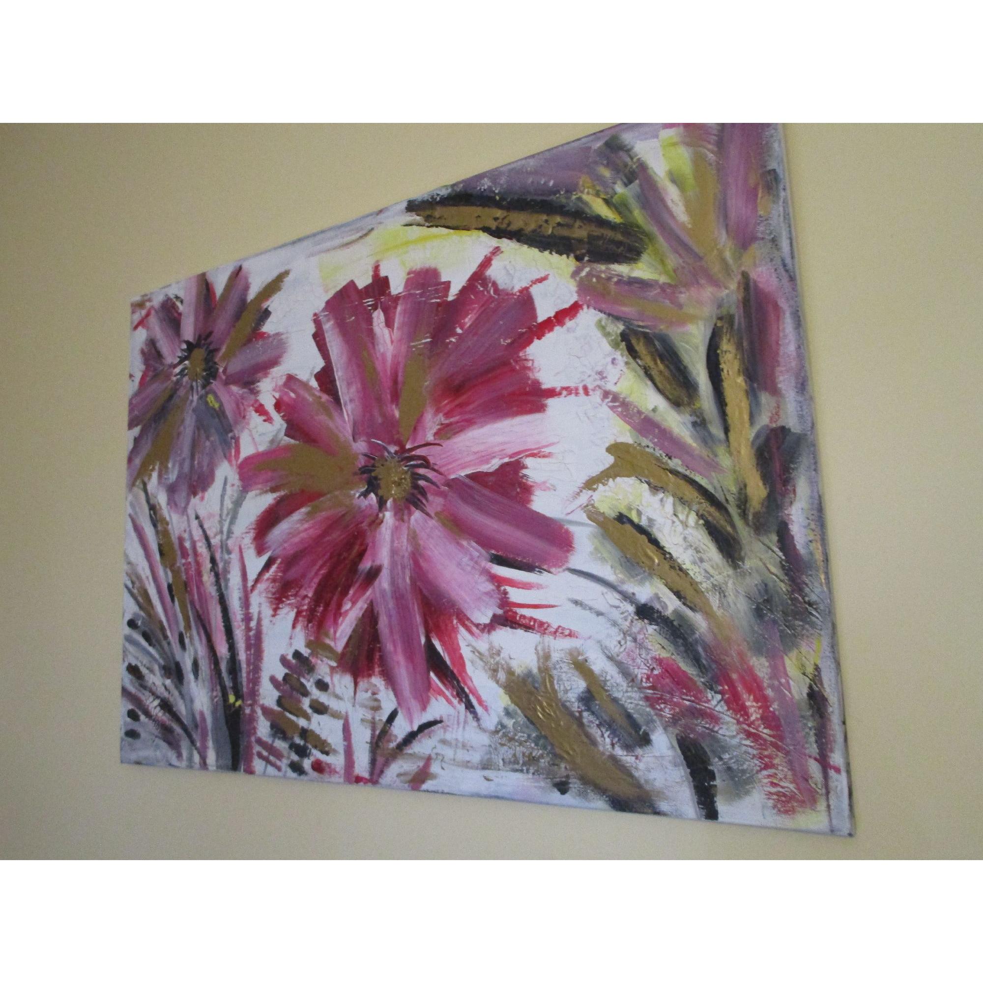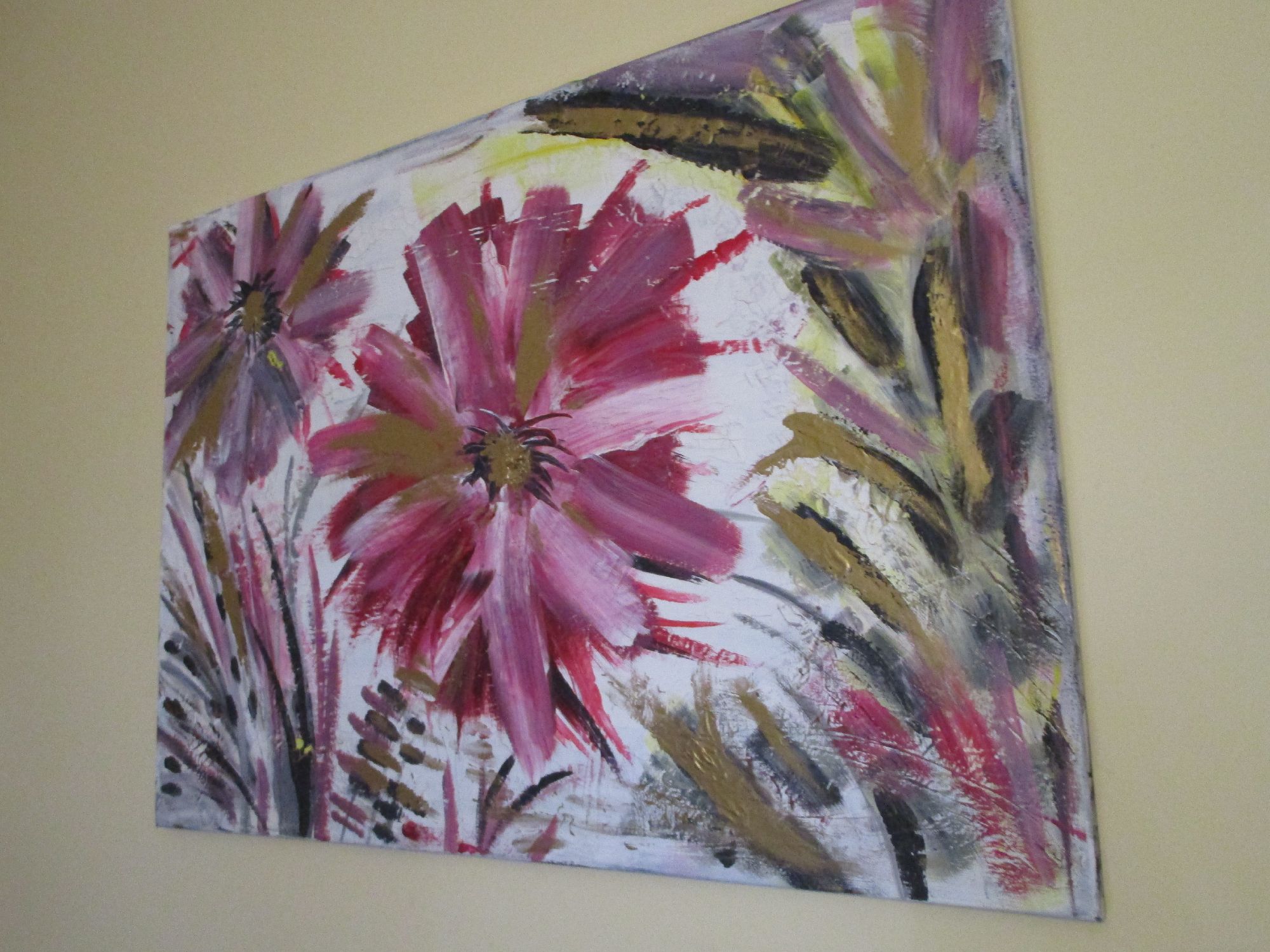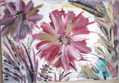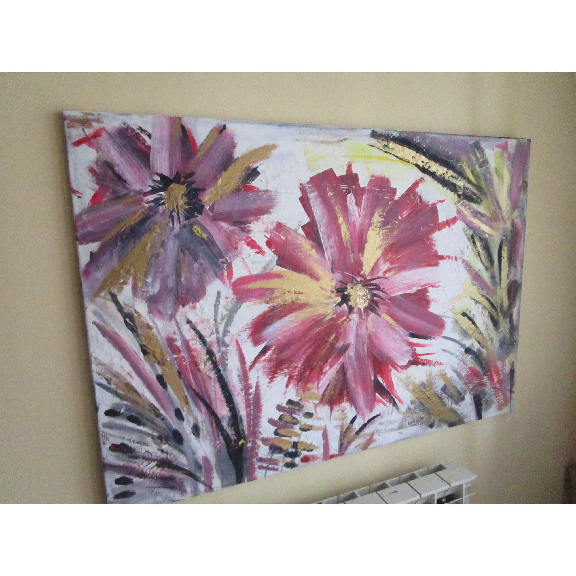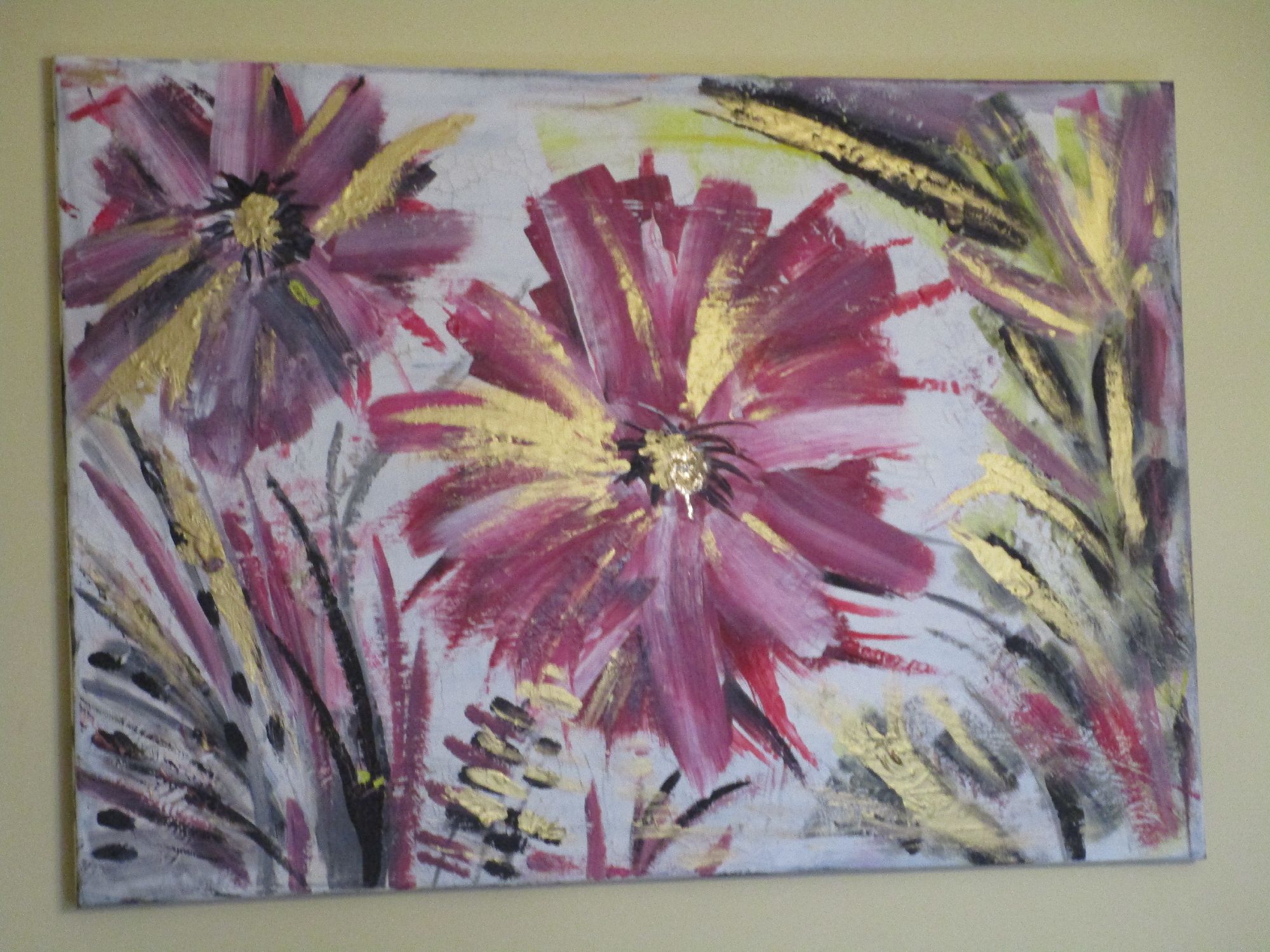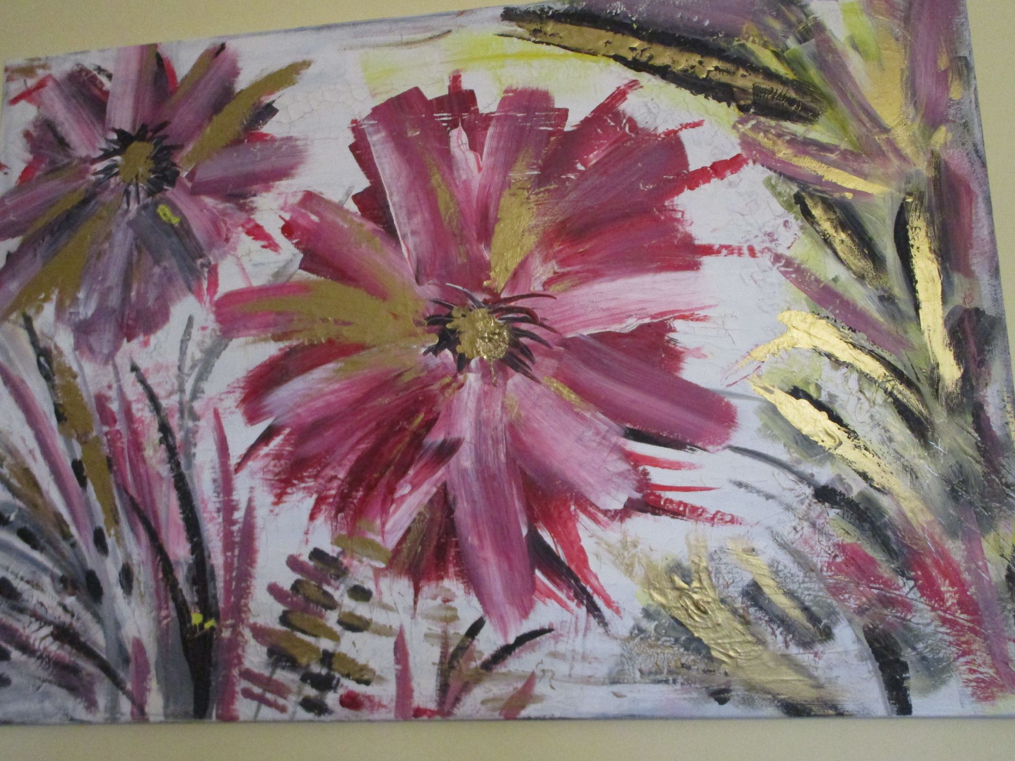 Energy la forza della vita, grandi fiori rigogliosi nel momento intenso della loro massima fioritura.Trasmettono energia, la forza della vita e la loro bellezza ringrazia l'esistenza stessa. Il dipinto ha una base di gesso che crea piccole crepe, pertanto il dipinto ha un effetto molto particolare.Il colore dorato fa riflettere il dipinto a seconda della luce della stanza e lo rende elegante.