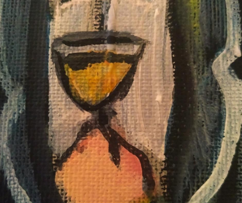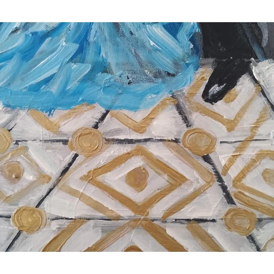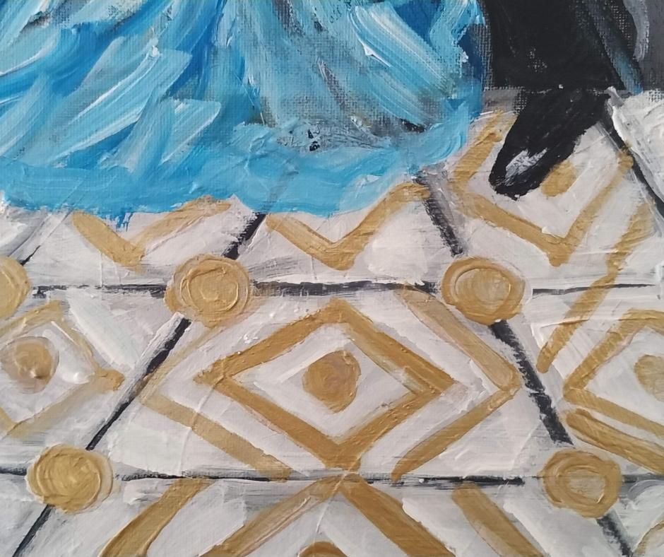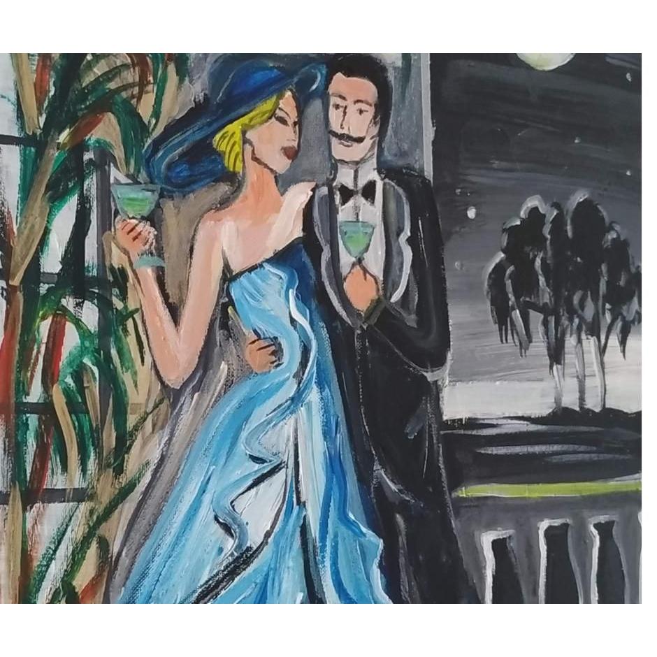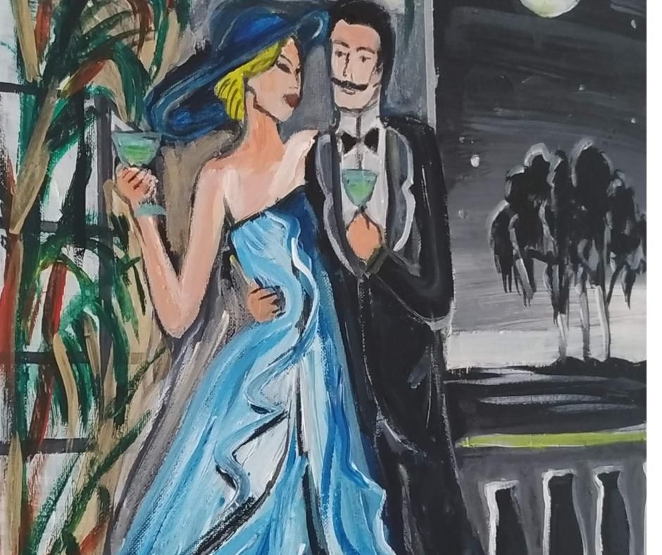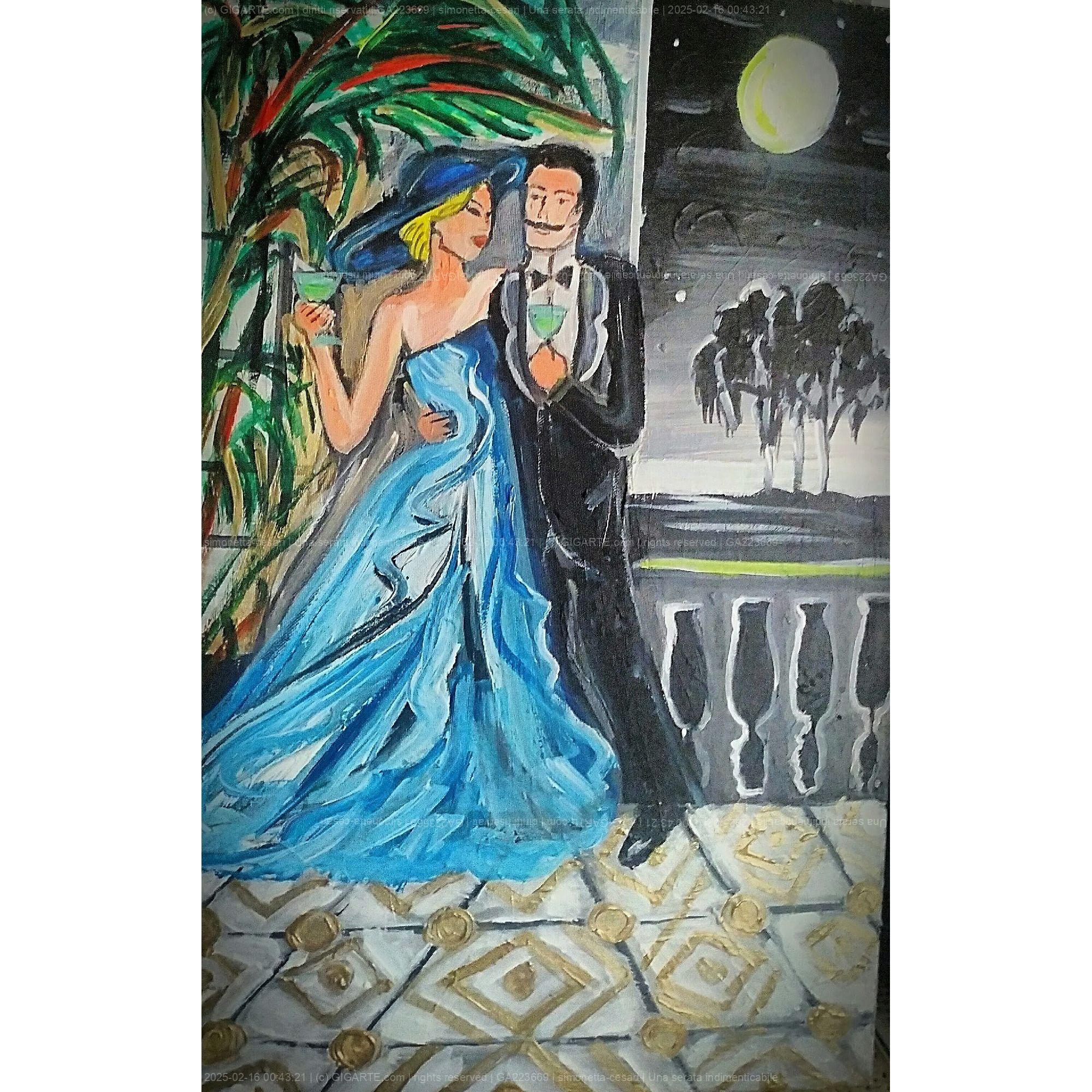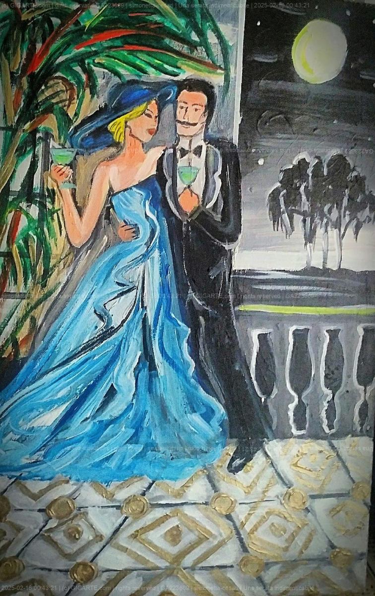 Dipinto su tela stile Art dèco realizzato con colori acrilici, ispirato ad un incontro durante un ricevimento importante di una donna e un uomo.