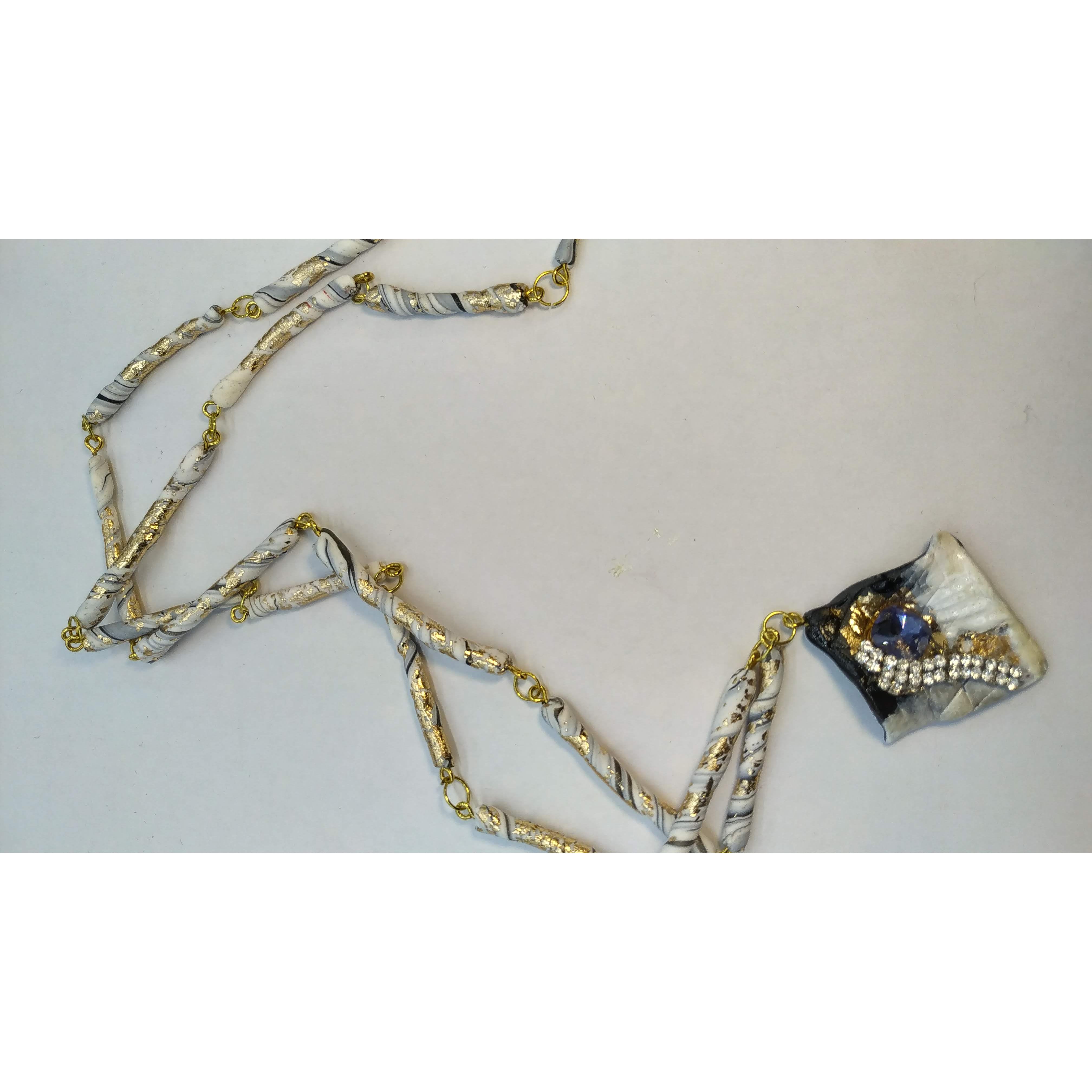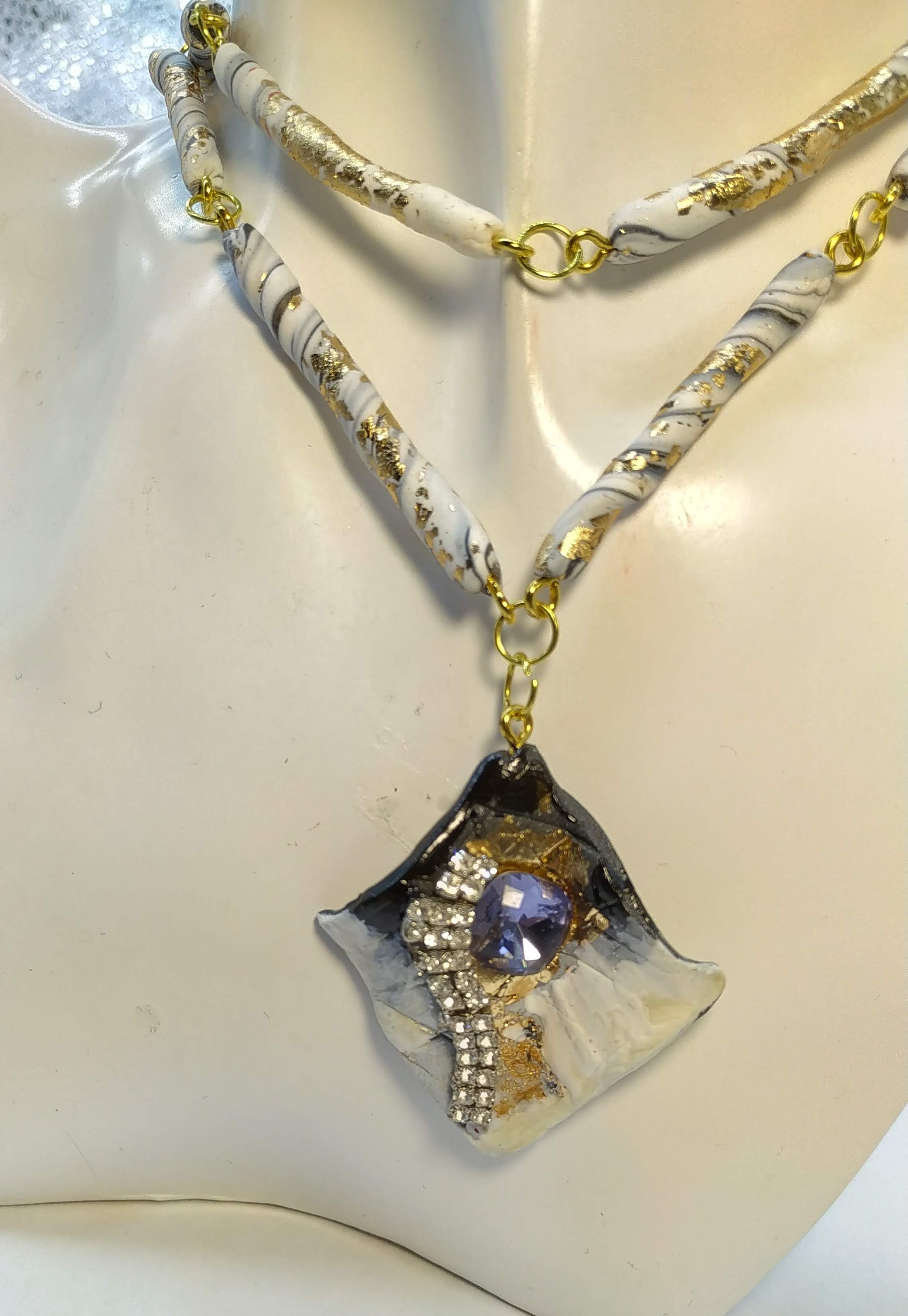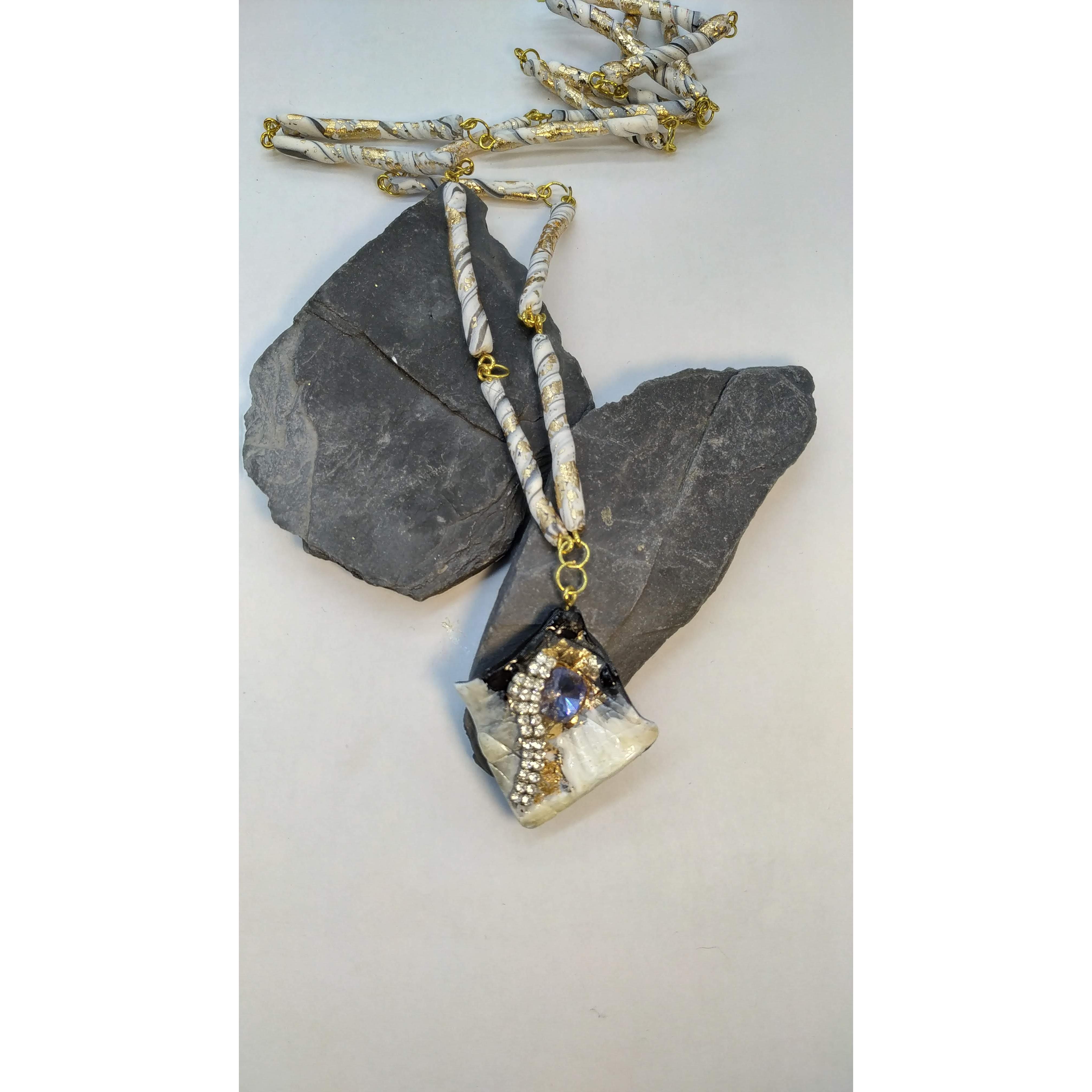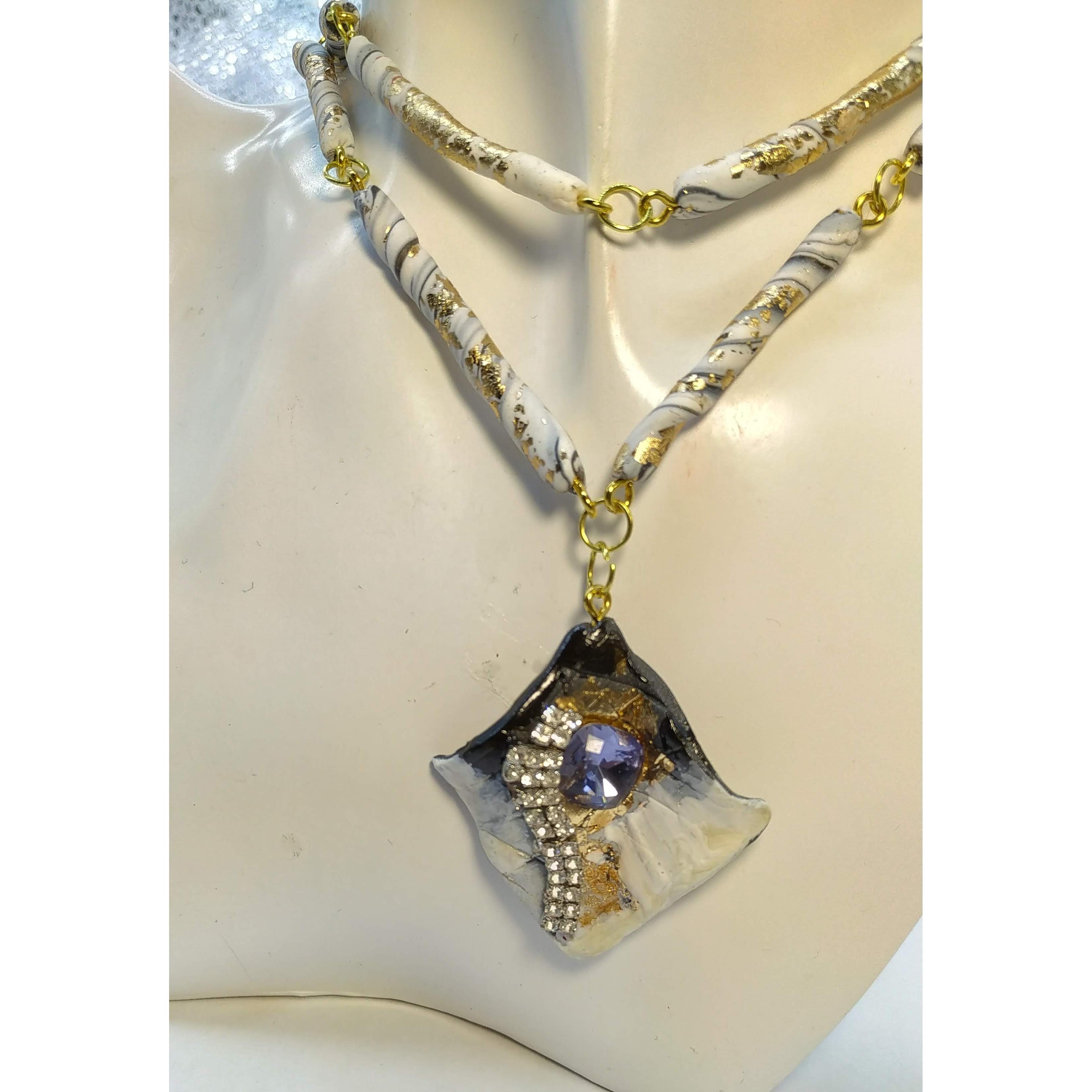 Gioielli artistici realizzati da una forma ispirati da un ispirazione del momento, da un talento creativo.Collana con una catenina innovativa e unica neò suo genere. Decorazioni con Tanzanite autentica a centro del ciondolo a forma di rombo, colori da nero al bianco.La foglia d'oro dona luninosita' al gioiello.Ogni pezzo e' unico, esclusivo e raro.La catenina e' lunga 60 cm.