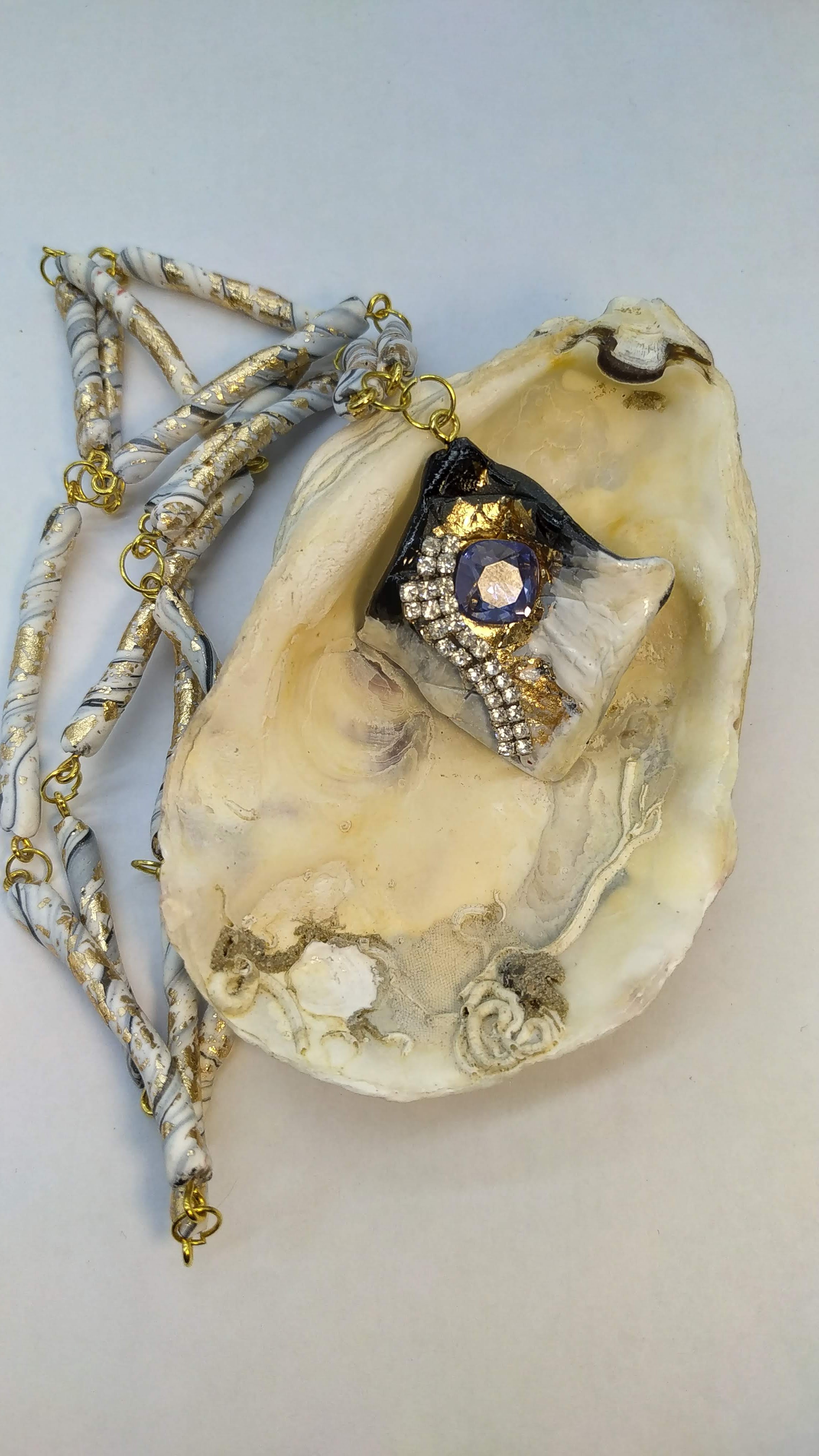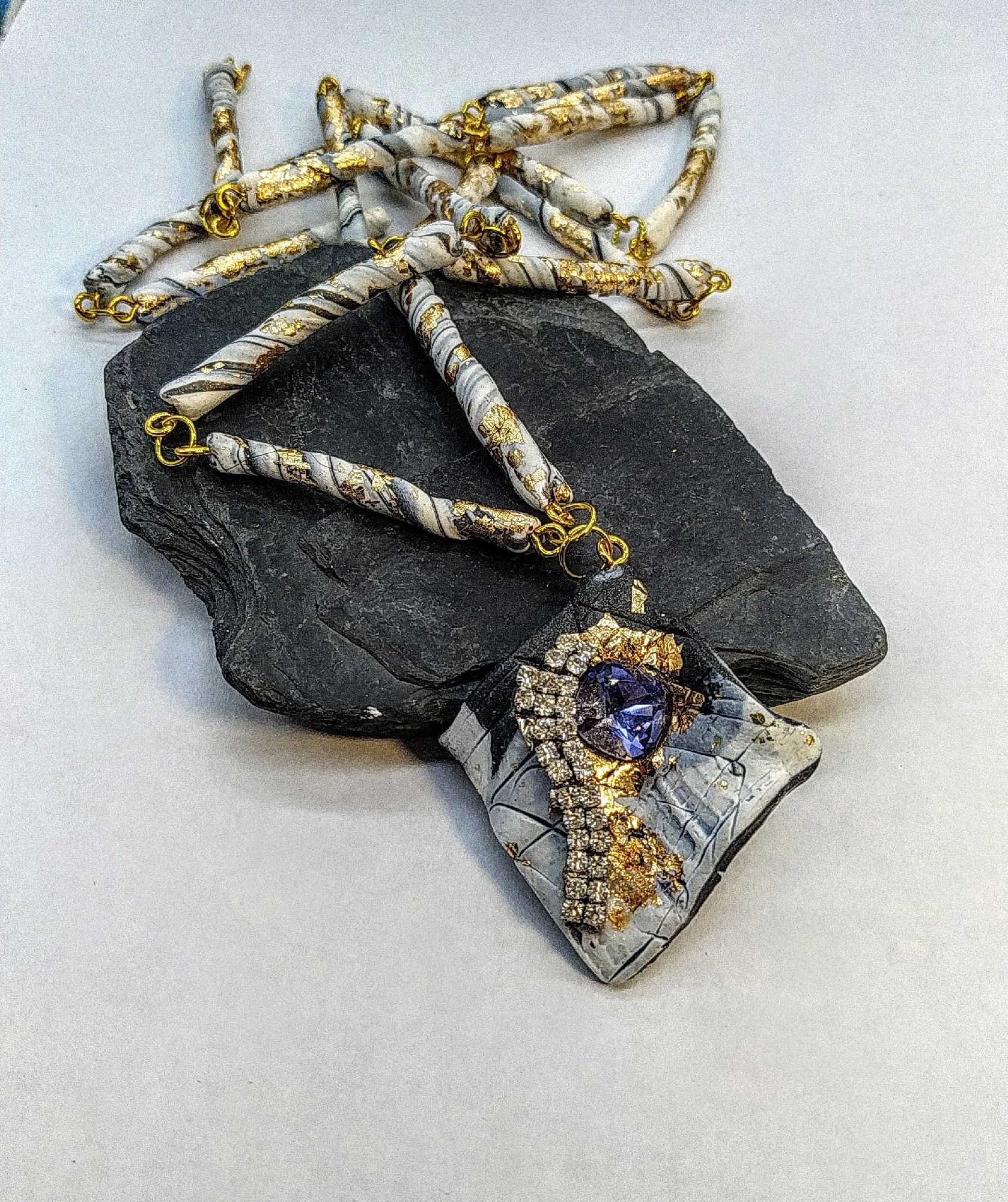 Alta bigiotteria realizzata a mano, Argilla polimerica, tanzanite, foglia d'oro 18K, 2022