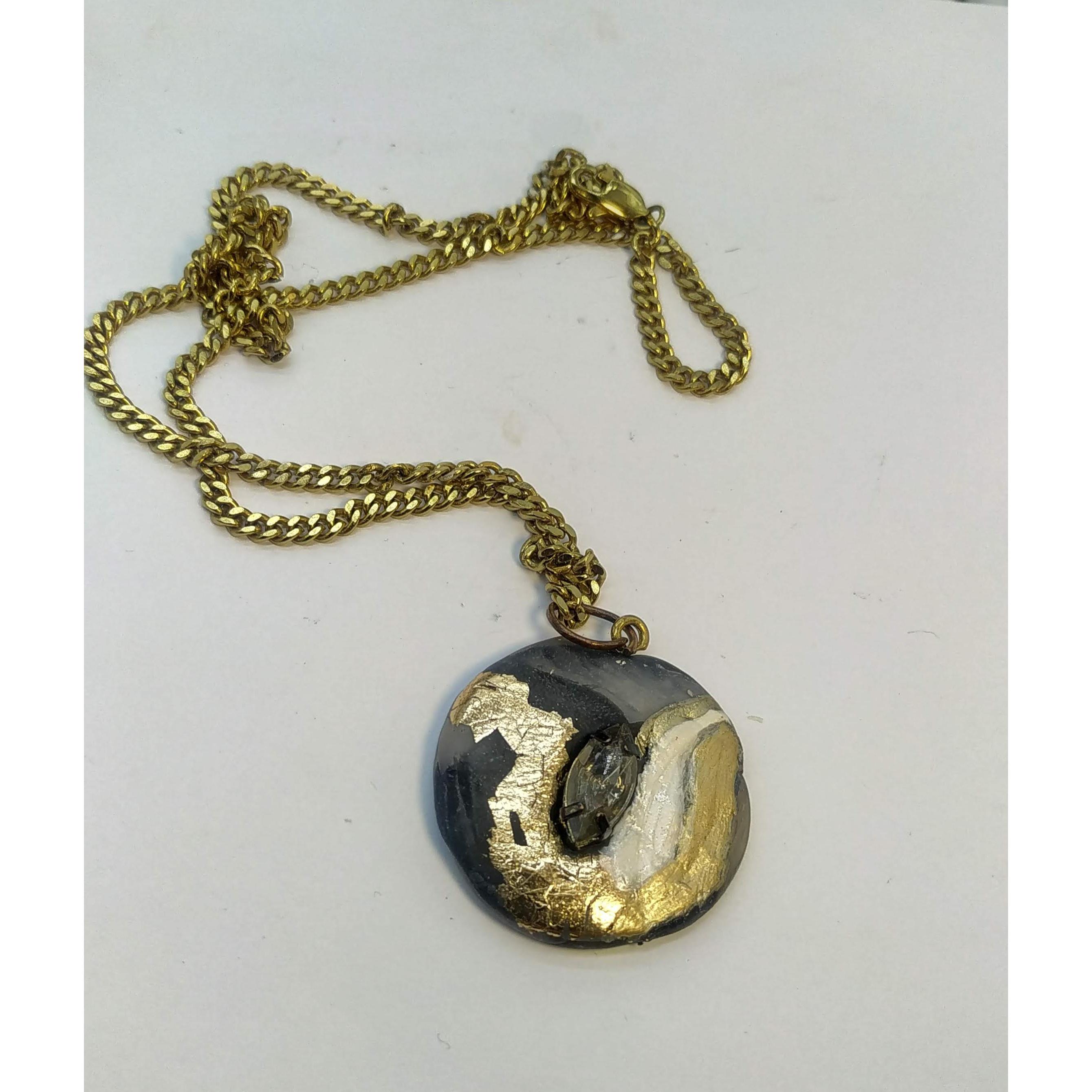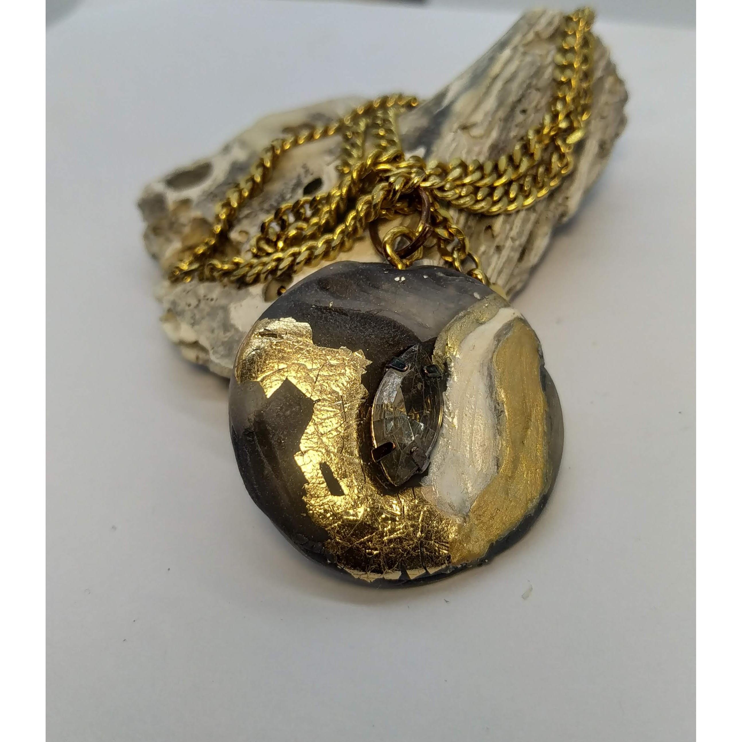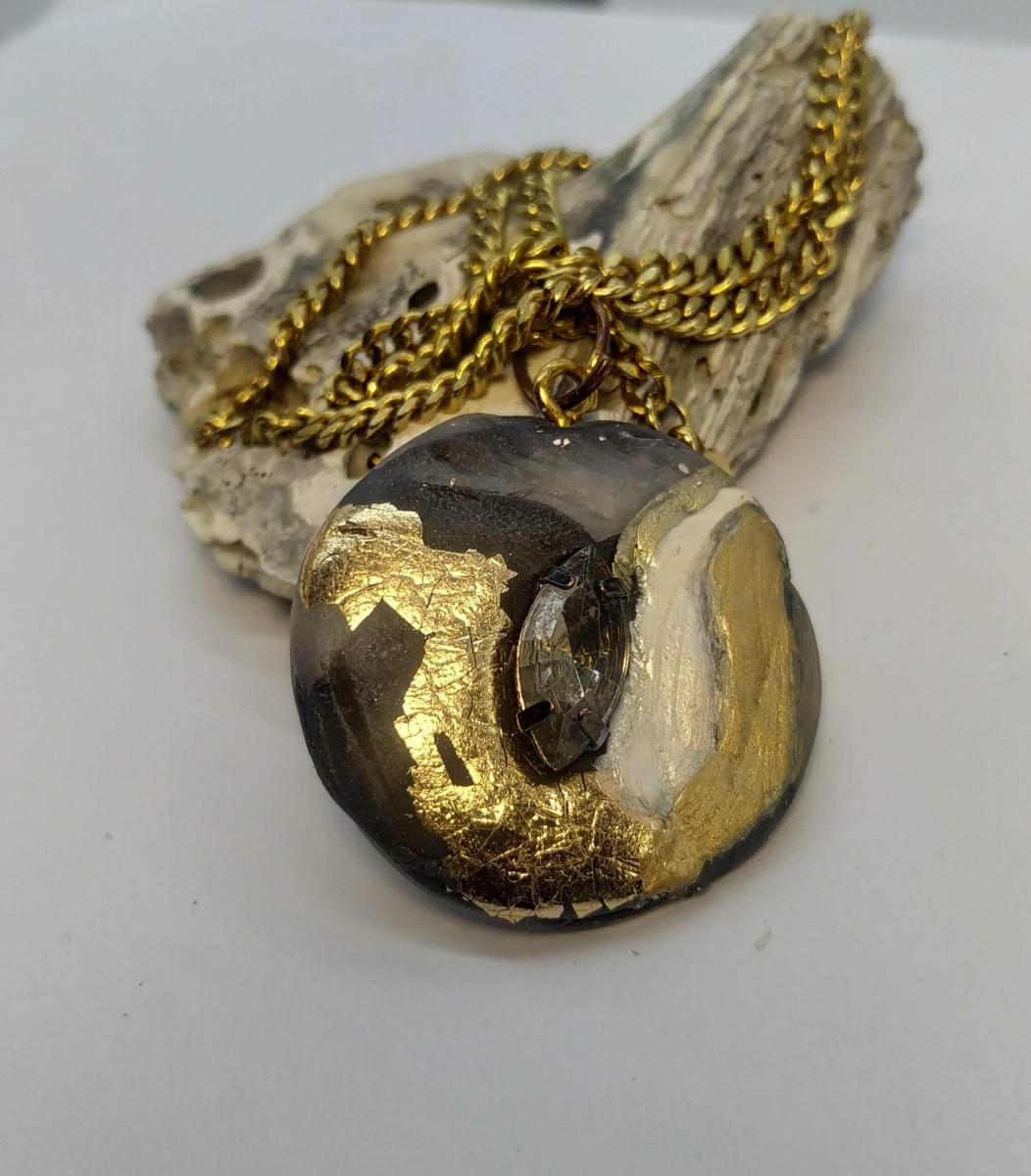 Un gioiello artistico particolare originale con un significato profondo: Luce e Tenebre.Strass Fume' al centro e intorno colori dal dorato al bianco e nero, come se la luce si trasformasse il tenebre e poi di nuovo luce.La foglia d'oro a 18k dona tutta la luce all'effetto chiaro scuro circostante, una creazione unica nata improvvisamente nella mia mente.Ha qualcosa di magico e un grande valore artistico, una bellezza esclusiva.Pezzo unico riproducibile ma sempre con piccole differenze.