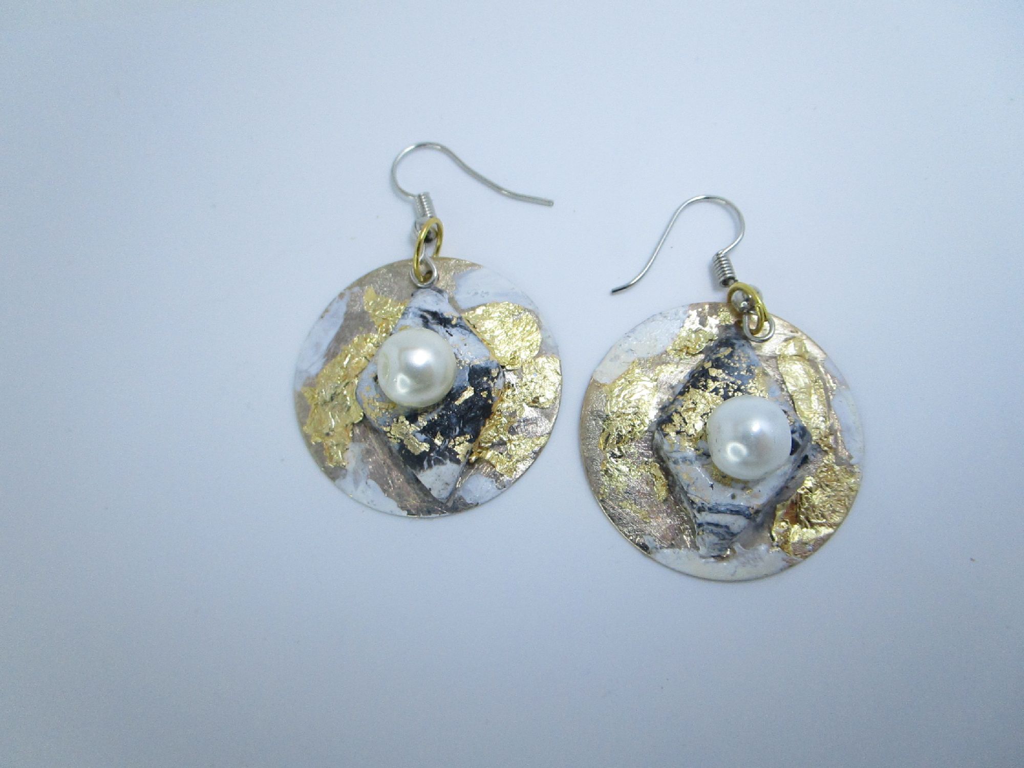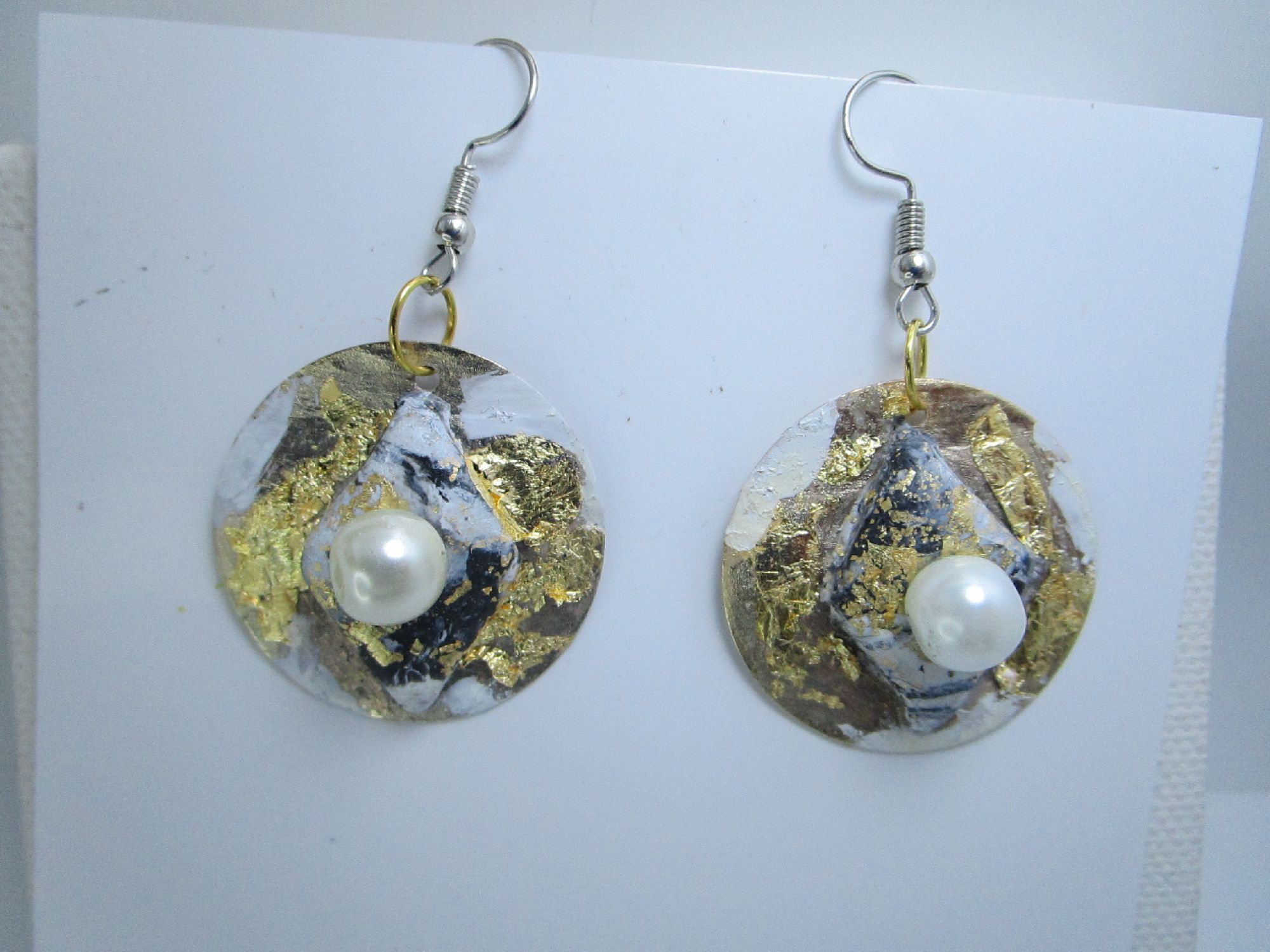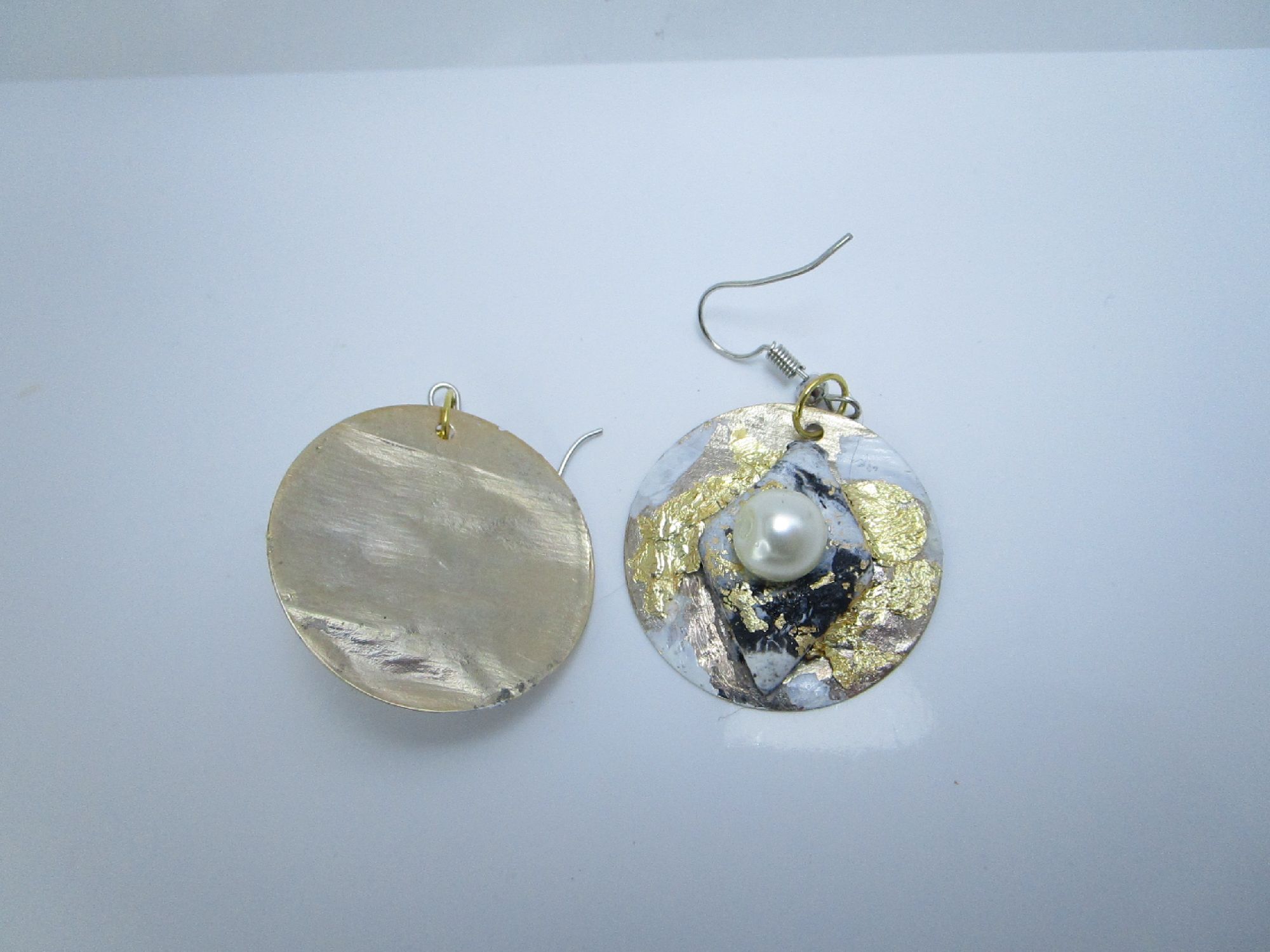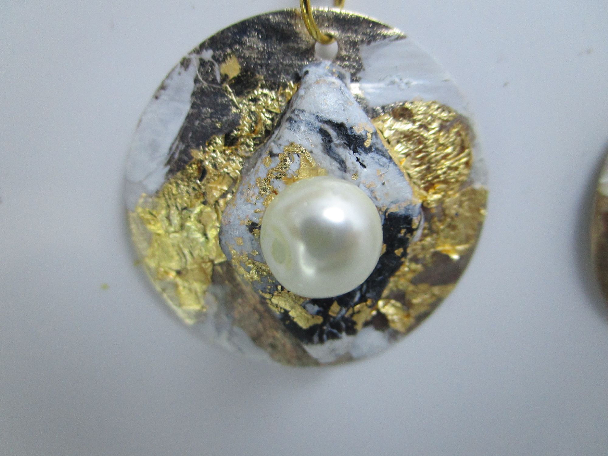 Un gioiello un'opera d'arte ispirata dall'estro del momento, orecchini tondi decorati con perla vera, foglia d'oro a 18 k.Sfumature di colore bianco e nero assimetriche come su un dipinto astratto. Pezzo unico ed esclusivo.