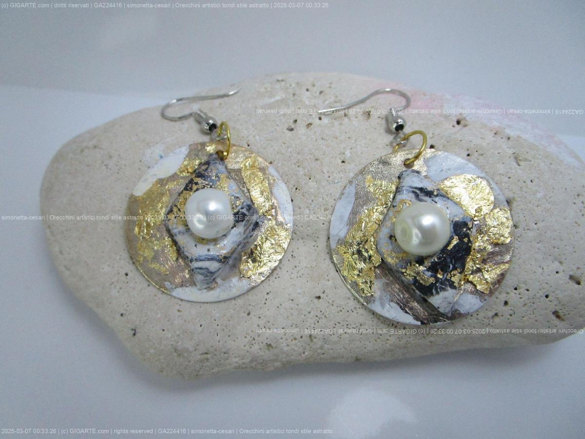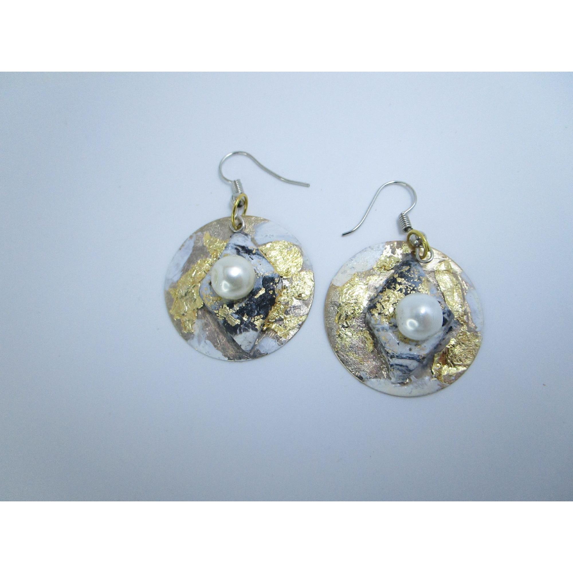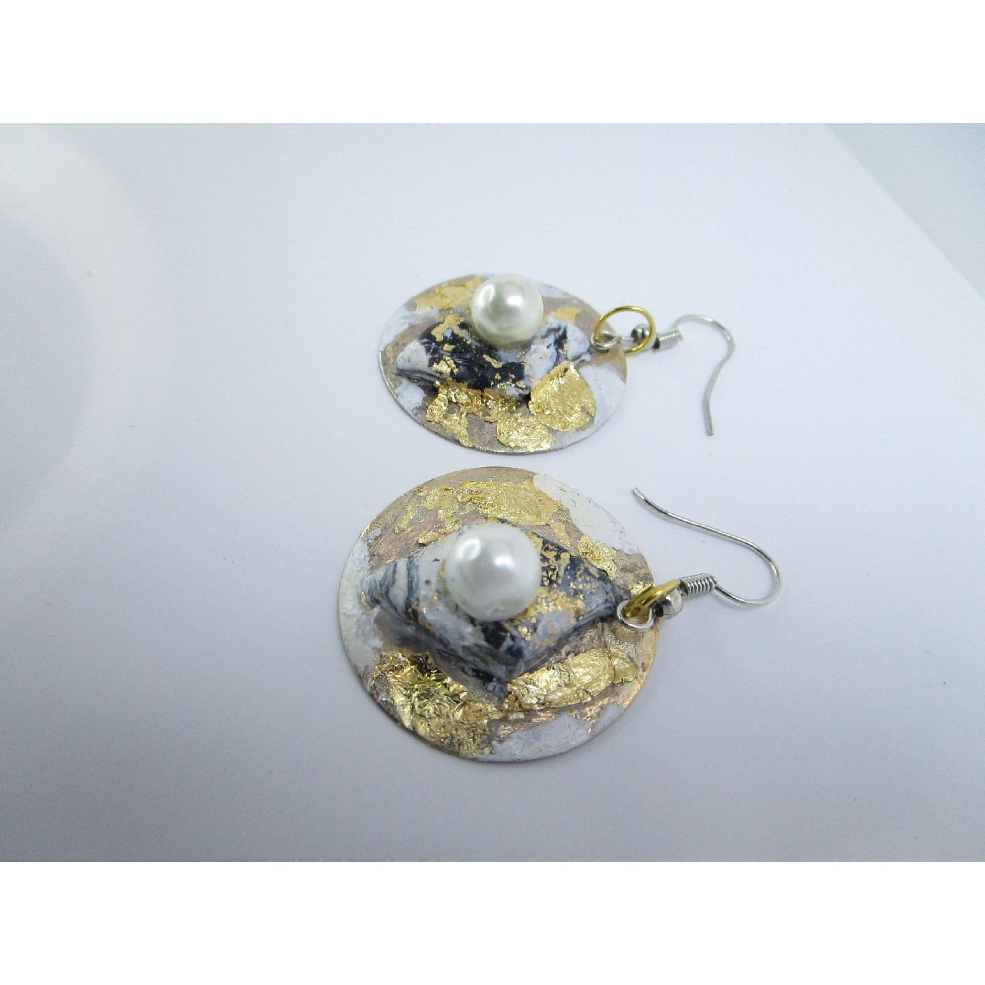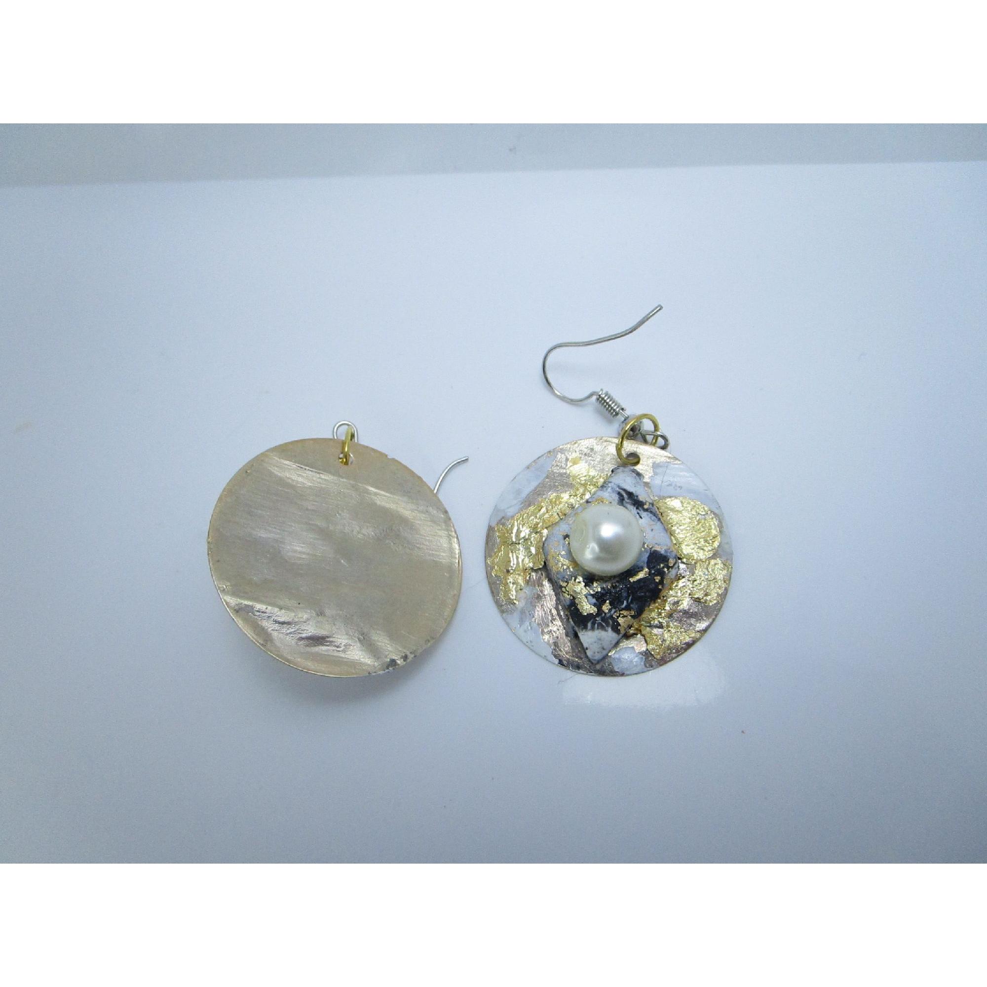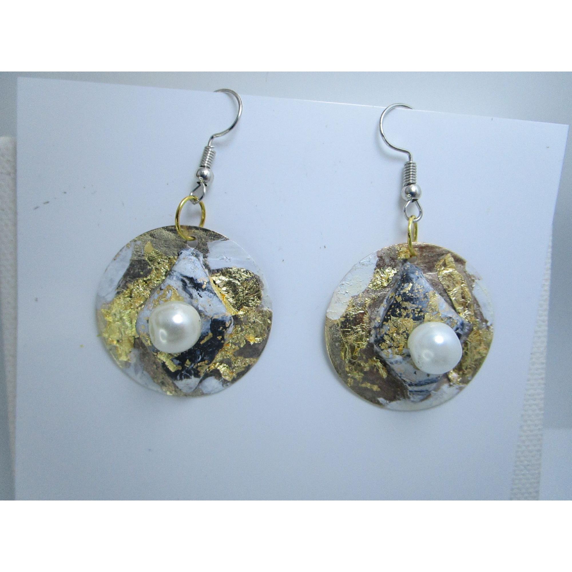 Un gioiello un'opera d'arte ispirata dall'estro del momento, orecchini tondi decorati con perla vera, foglia d'oro a 18 k.Sfumature di colore bianco e nero assimetriche come su un dipinto astratto. Pezzo unico ed esclusivo.