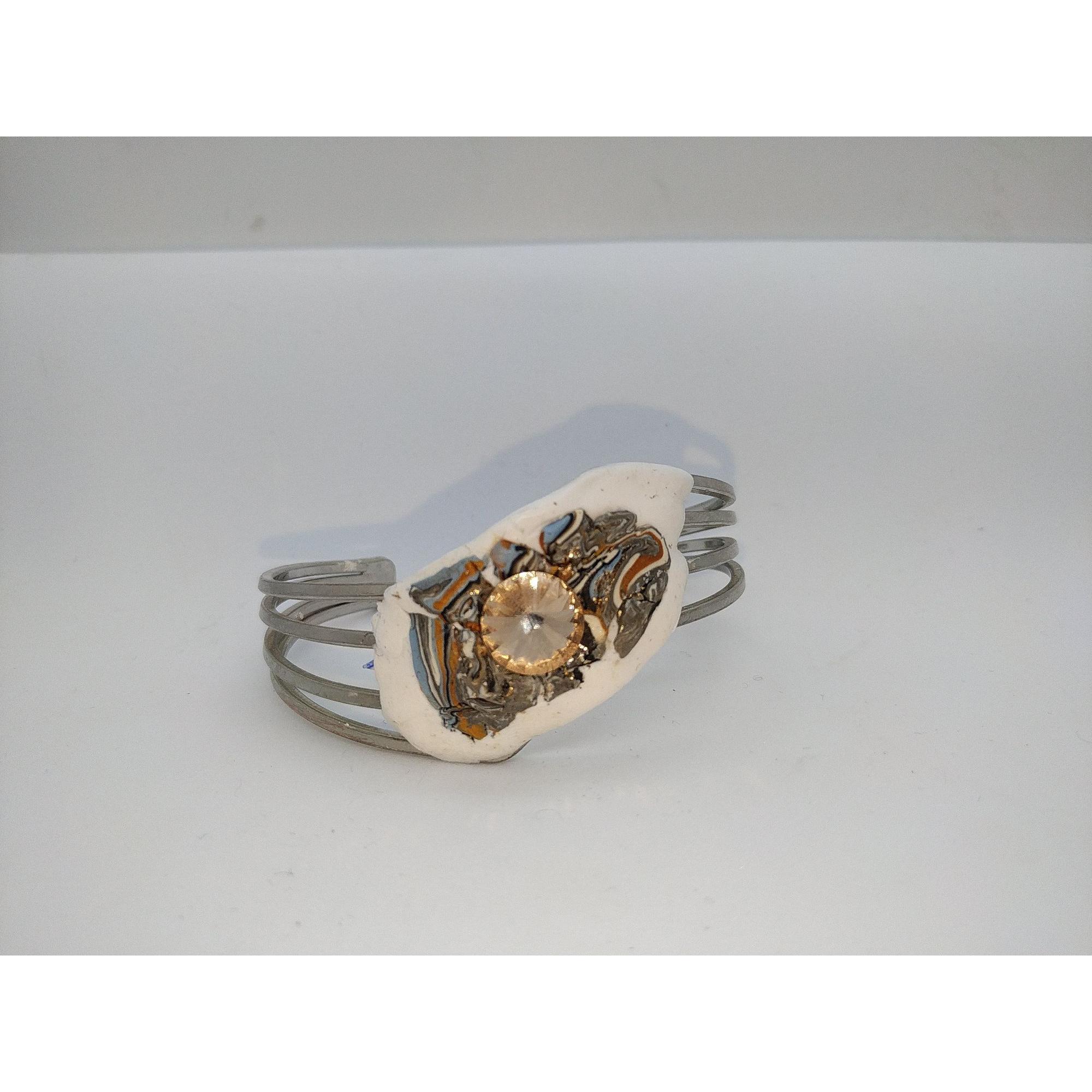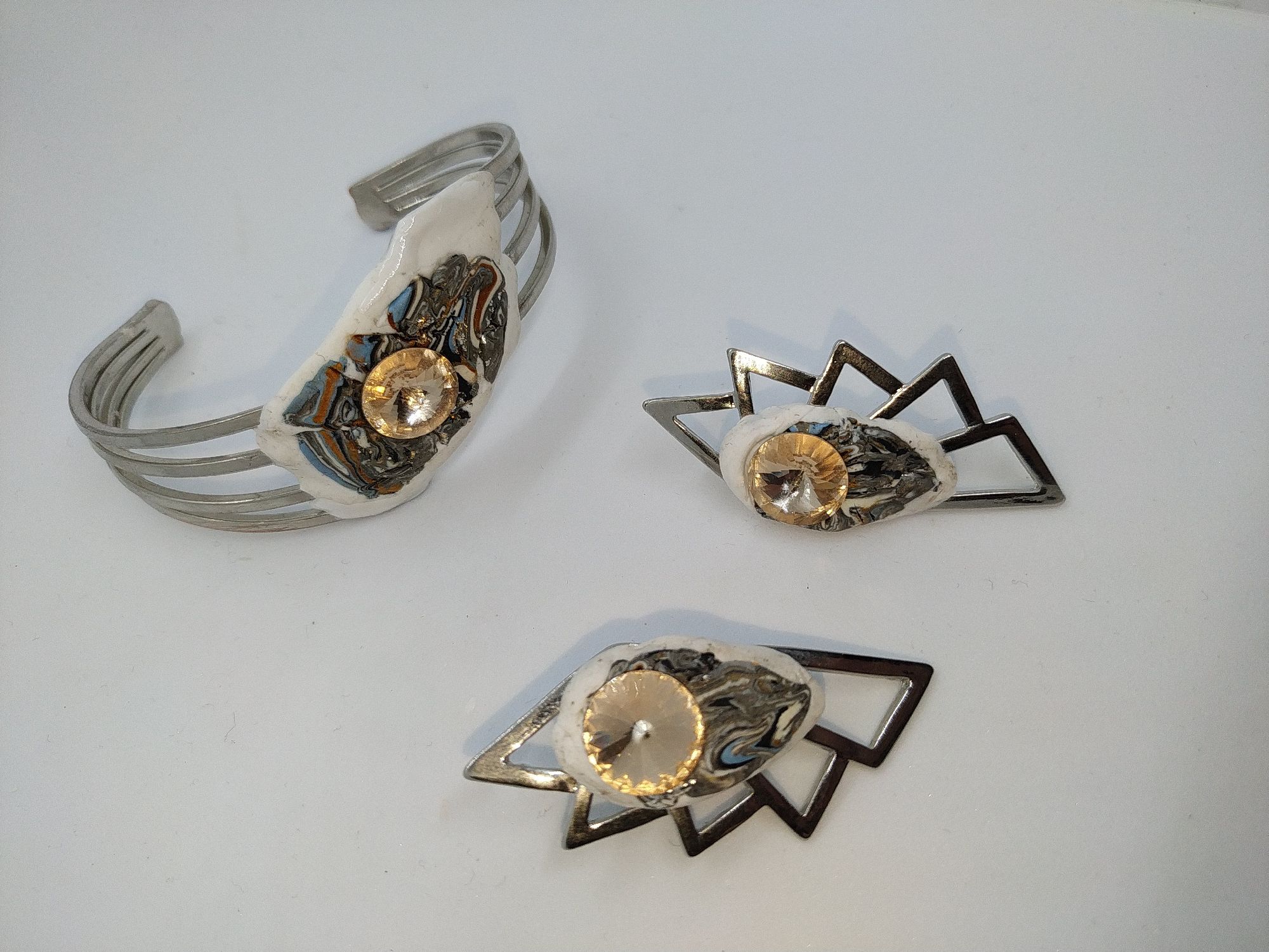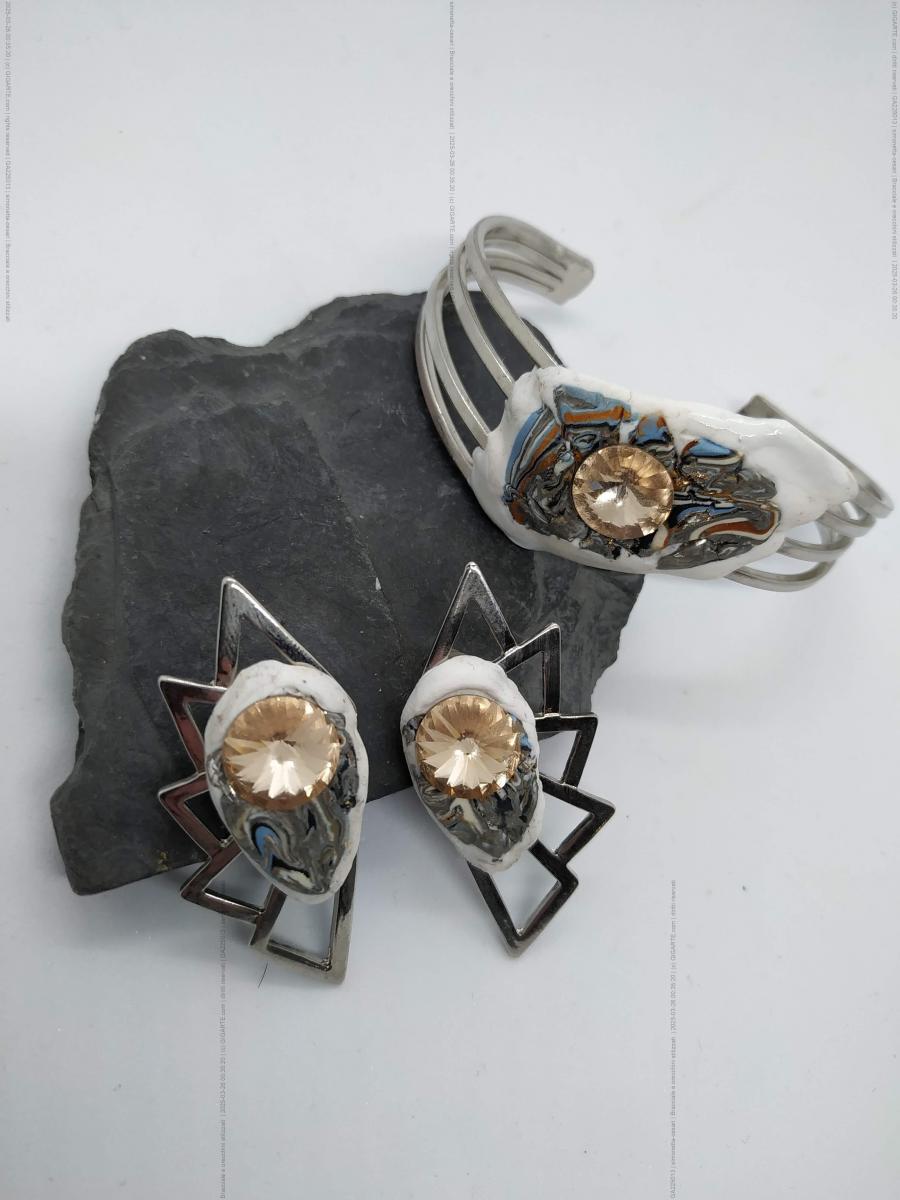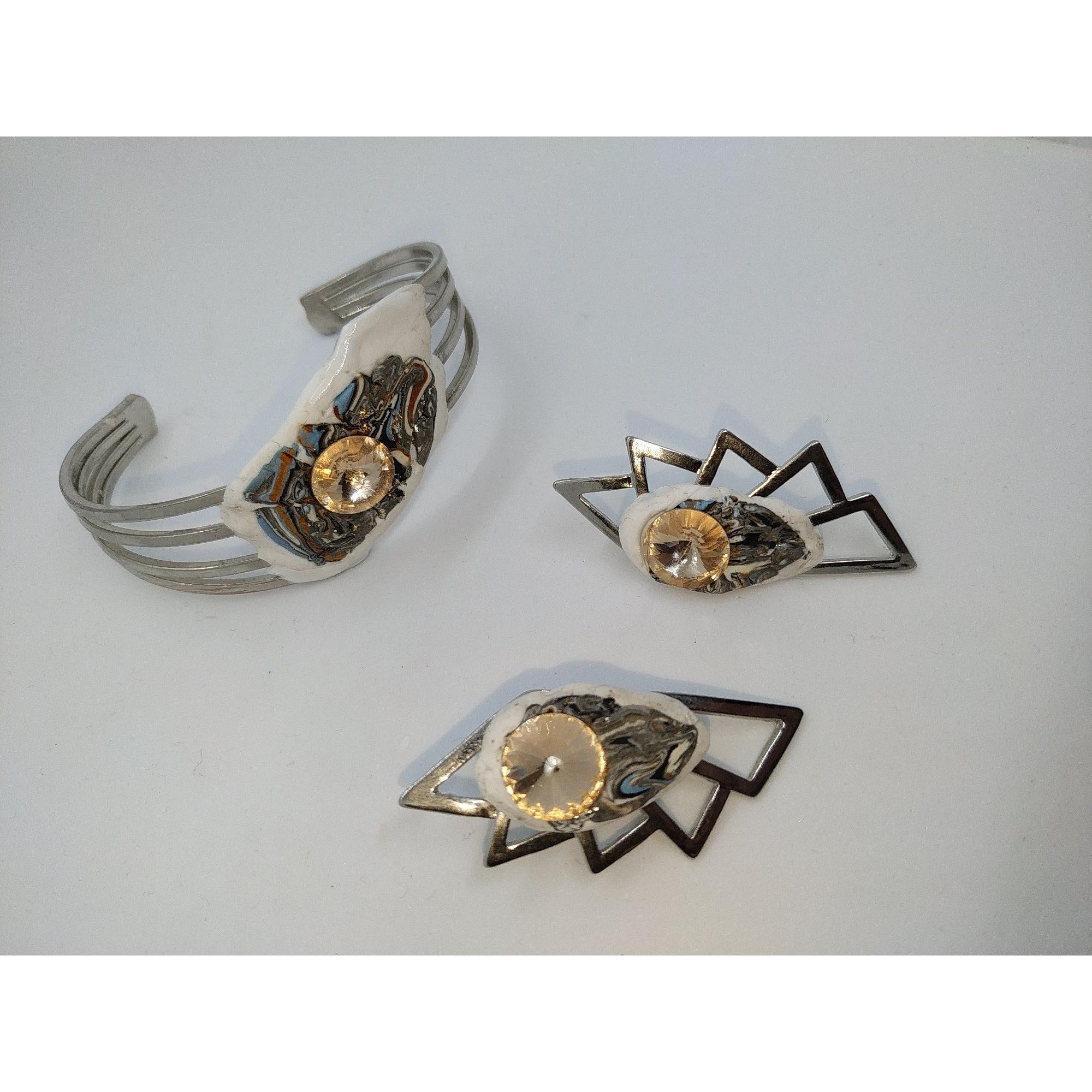 Bracciale di ottone con orecchini di stile astratto con strass Swaroski color topazio e applicazioni di argilla polimerica di vari colori.Questo completo e unico e creato a mano attraverso l' ispirazione del momento.Dimensioni del bracciale larghezza 19 cm altezza 5 cm, orecchini di dimensioni altezza 5,5 cm. larghezza 3 cm.La forma e lo stile rende questo completo moderno ed elegante.