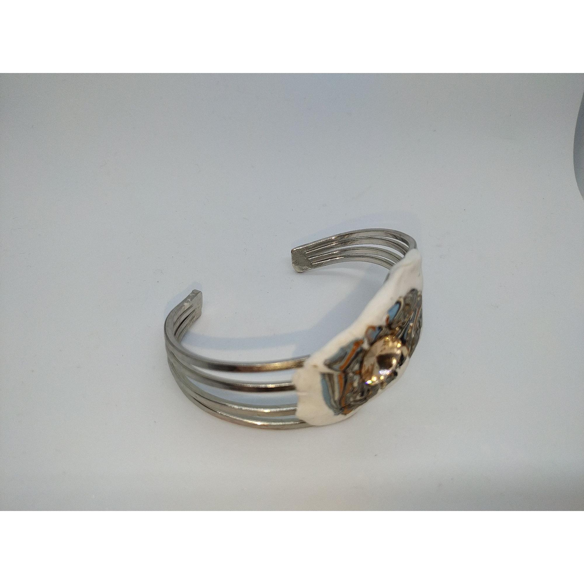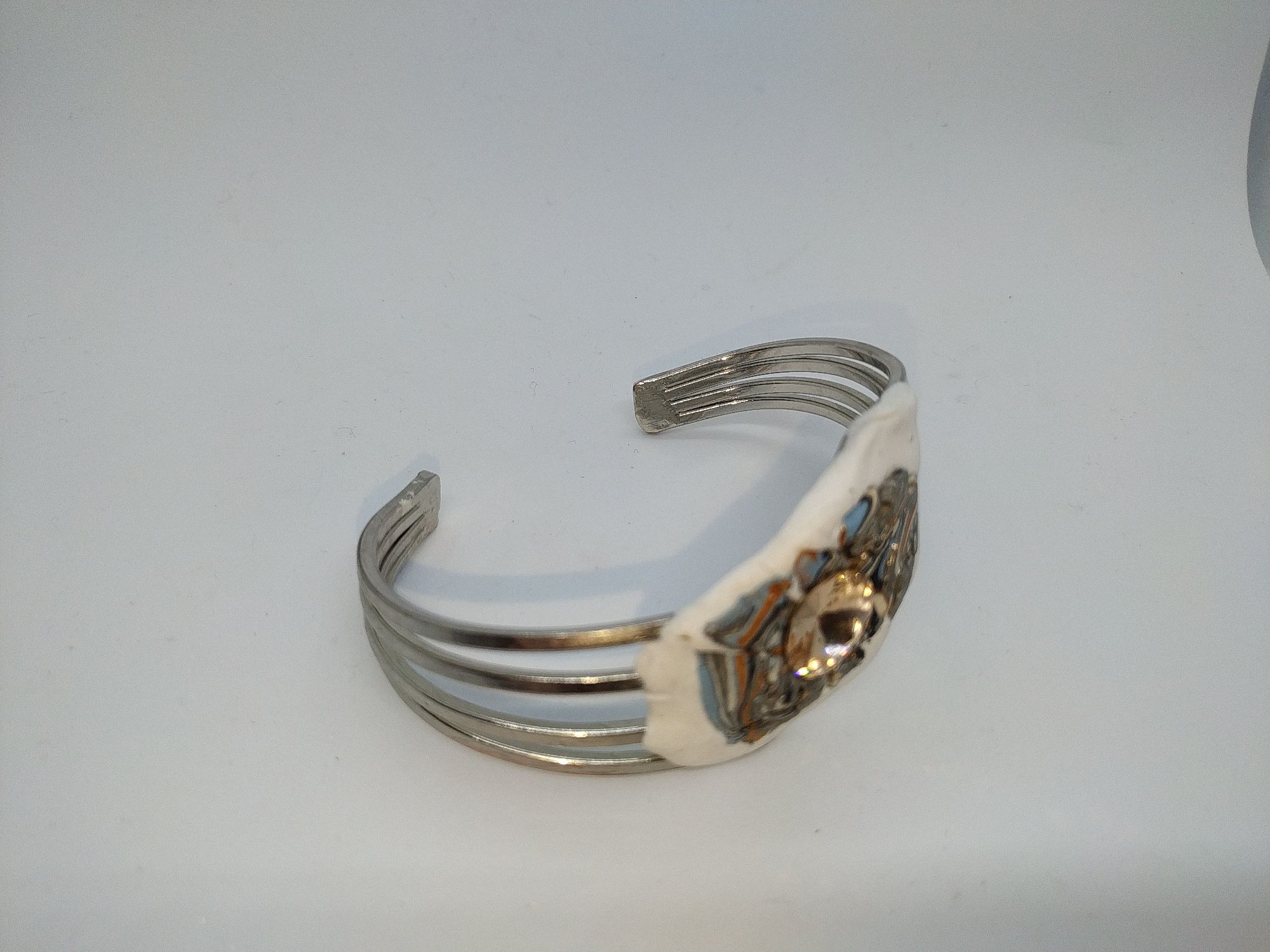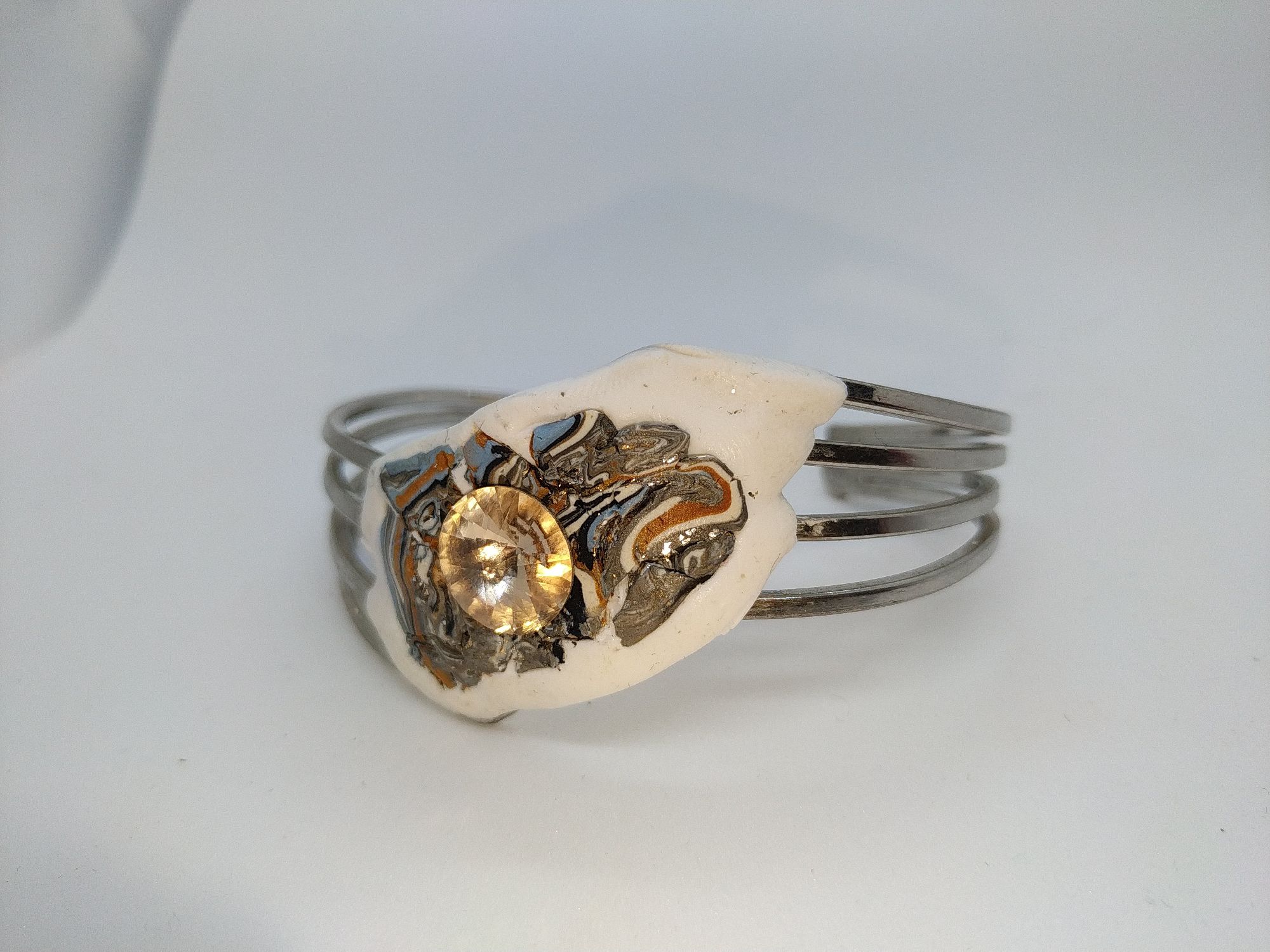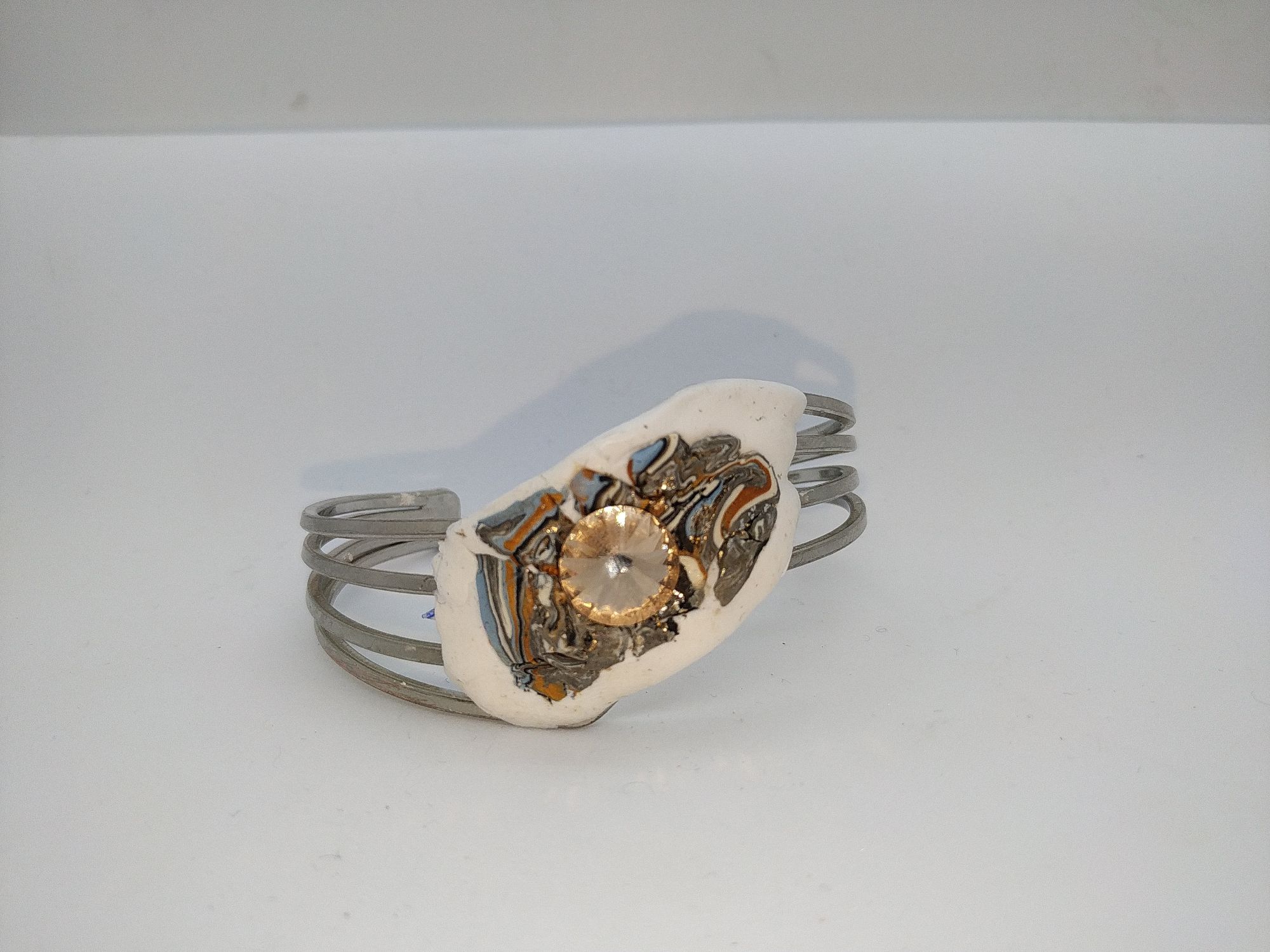 Bracciale di ottone con orecchini di stile astratto con strass Swaroski color topazio e applicazioni di argilla polimerica di vari colori.Questo completo e unico e creato a mano attraverso l' ispirazione del momento.Dimensioni del bracciale larghezza 19 cm altezza 5 cm, orecchini di dimensioni altezza 5,5 cm. larghezza 3 cm.La forma e lo stile rende questo completo moderno ed elegante.