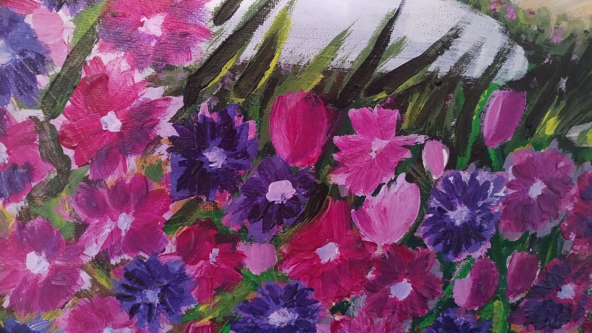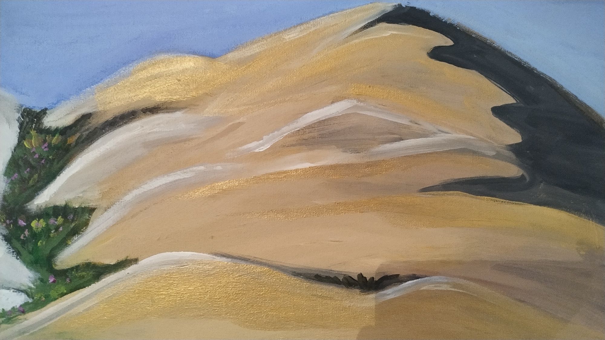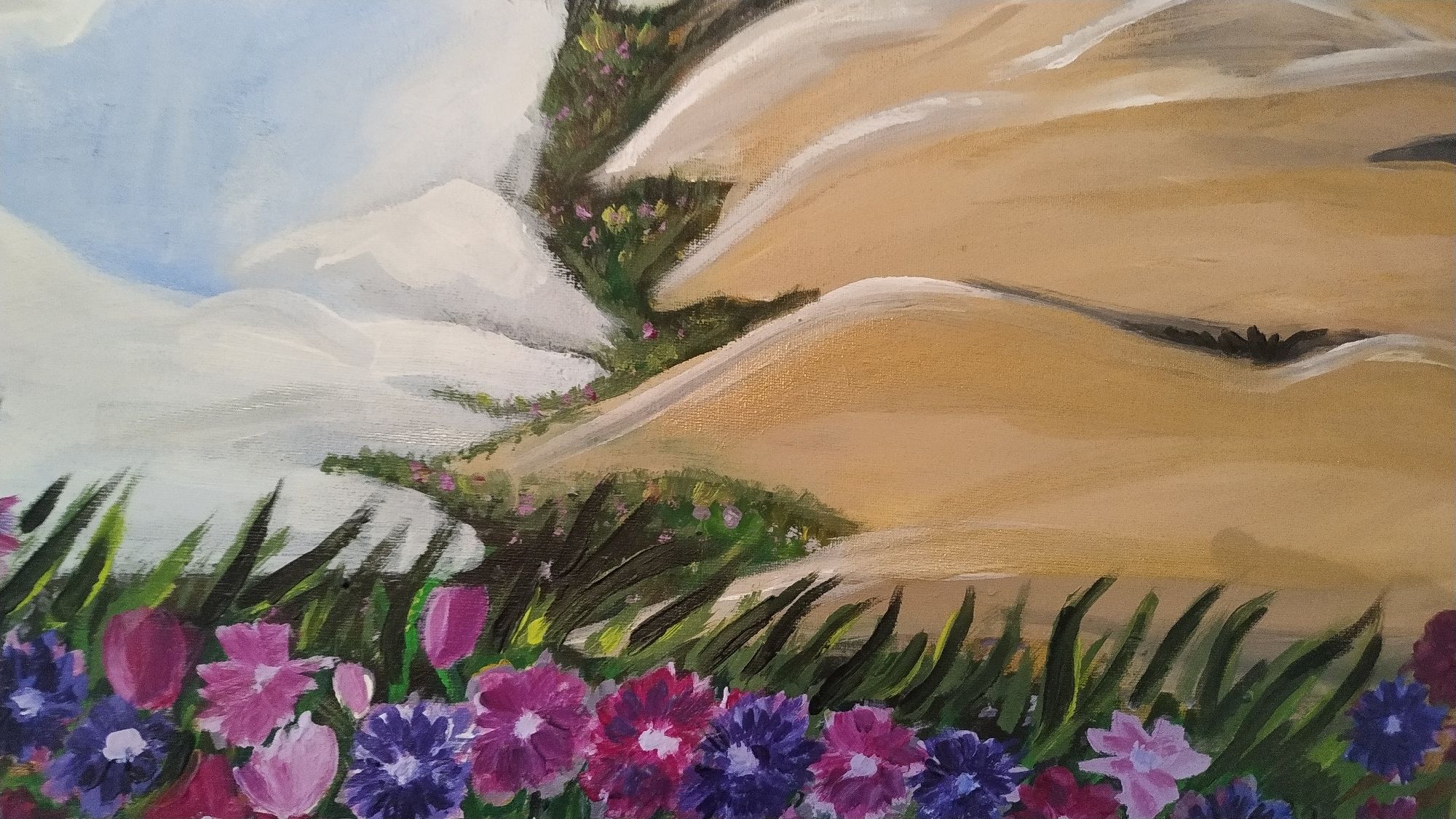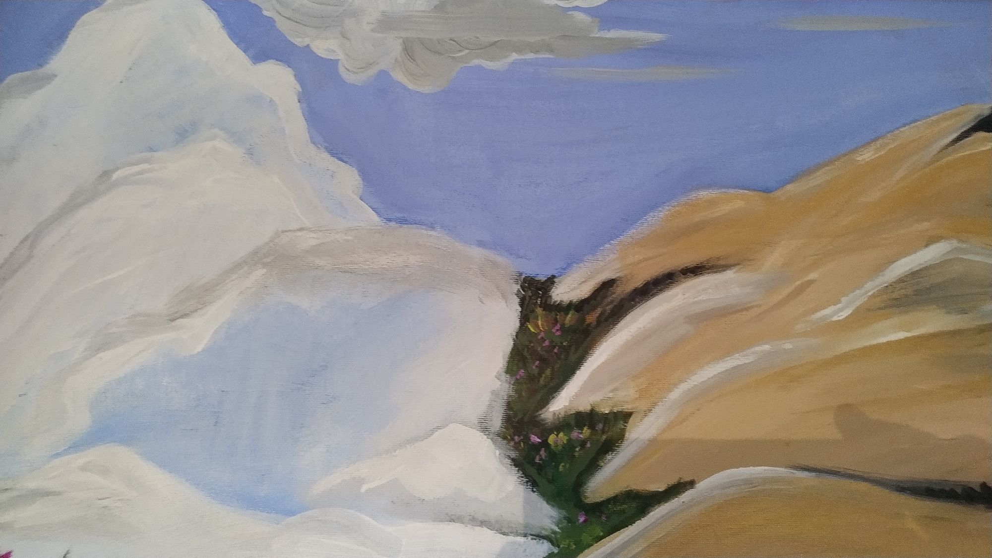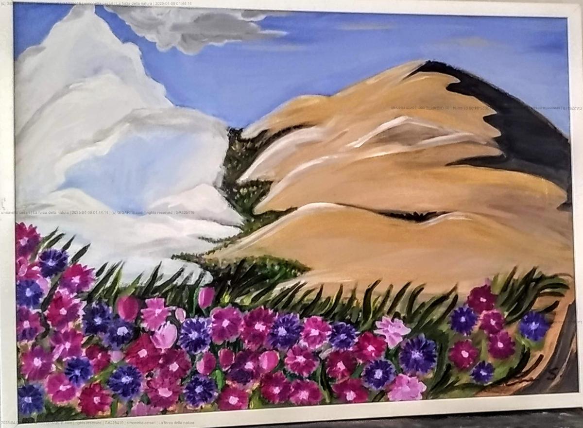 La forza della natura, il dipinto rappresenta la forza della vita e della natura nonostante il clima con temperature estreme.Un ghiacciaio a sinistra e le dune del deserto a destra, da ere glaciali a desertificazioni la vita nasce lo stesso attraverso fiori viola e fucsia. Niente puo' fermare la vita e la bellezza della natura attraverso la fioritura di fiori e piante.