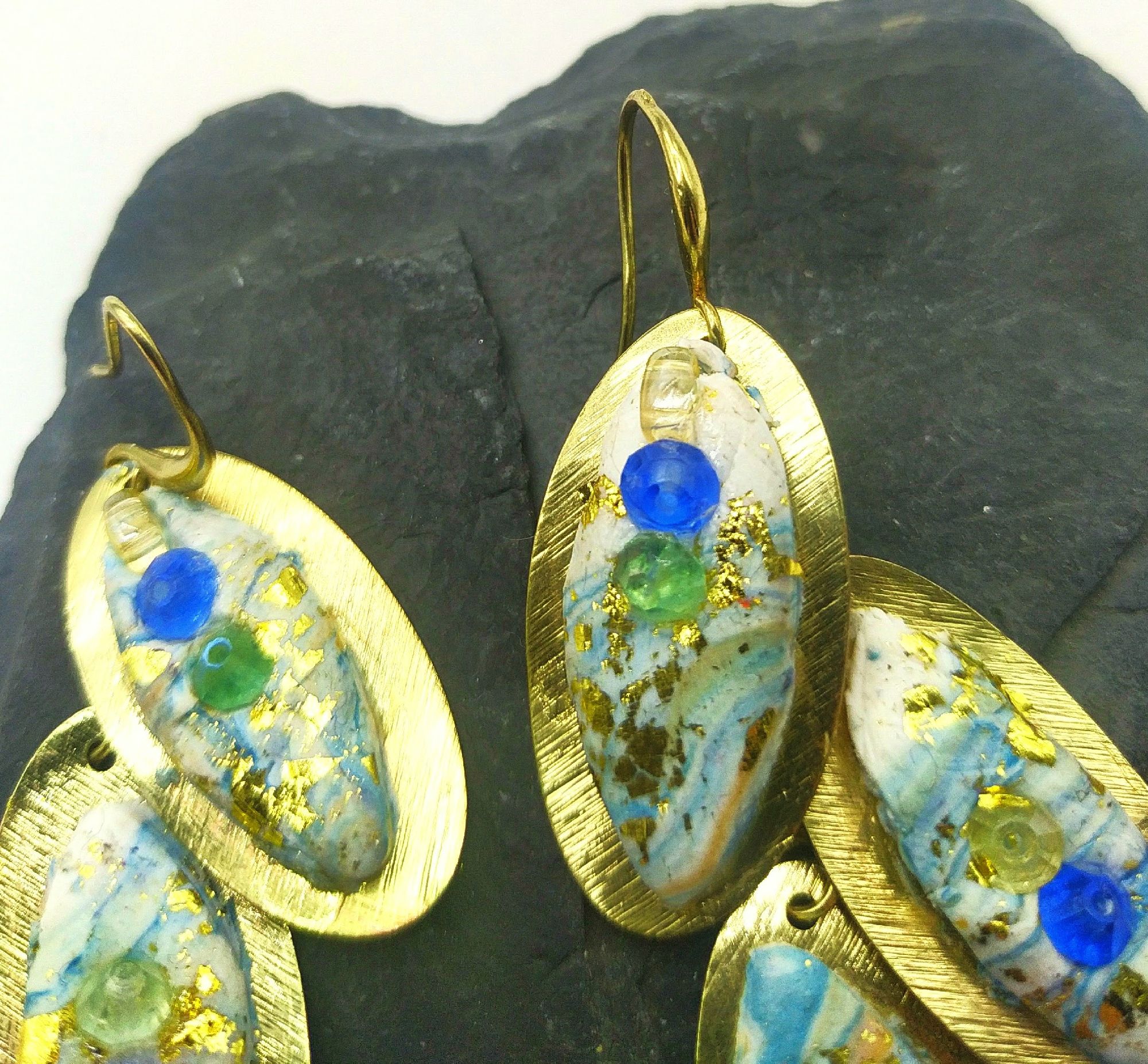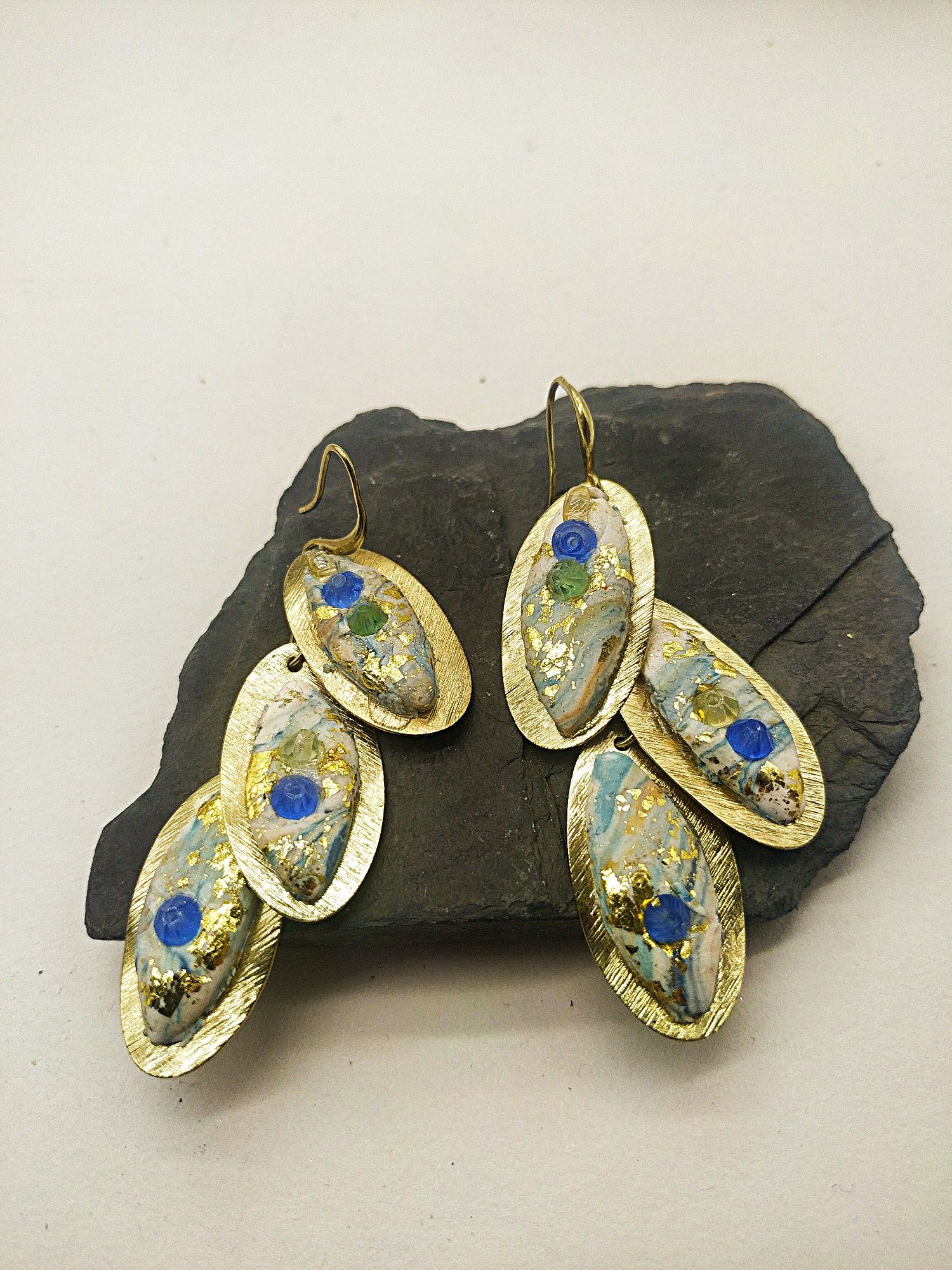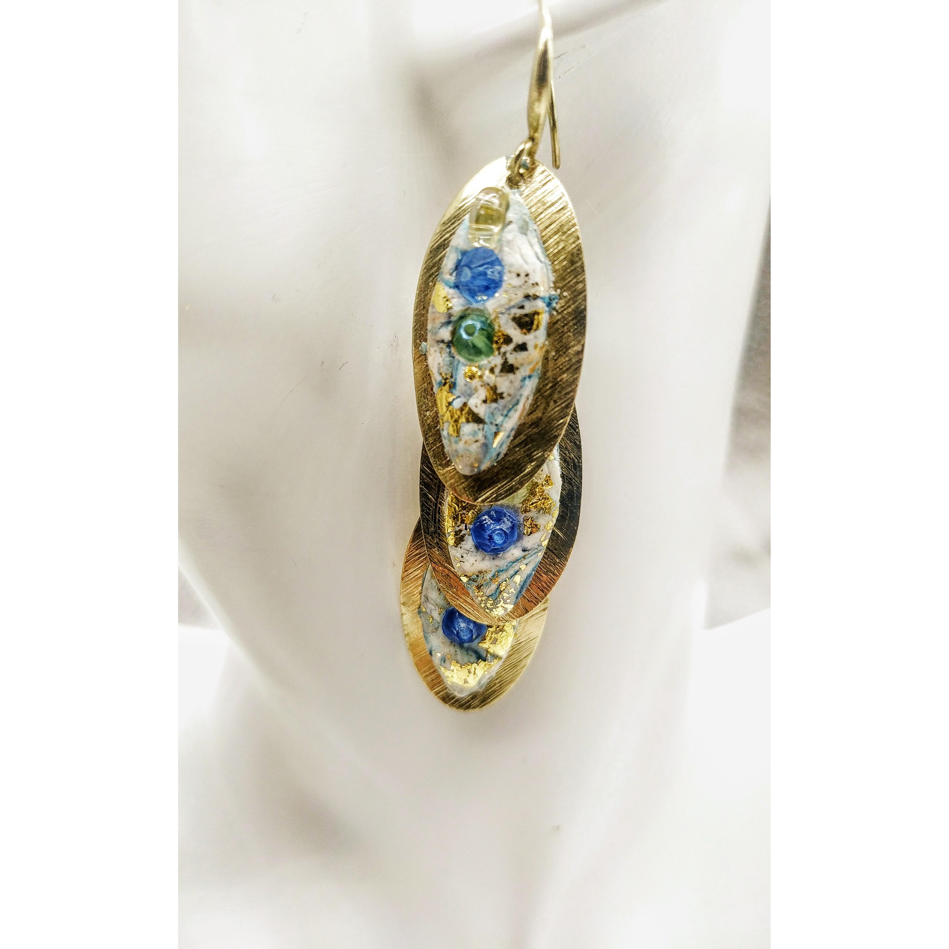 Orecchini pendenti Coda di Pavone, ispirati alla coda di un Pavone con i suoi splendidi colori, il color oro della base in ottone crea particolari contrasti con i cristalli azzurri,verdi e celesti. Una creazione degna di un opera d'arte, il pezzo e' unico, esclusivo, ripetibile con piccole differenze.Realizzati a mano sono orecchini eleganti, trasmettono armonia ed originale bellezza.