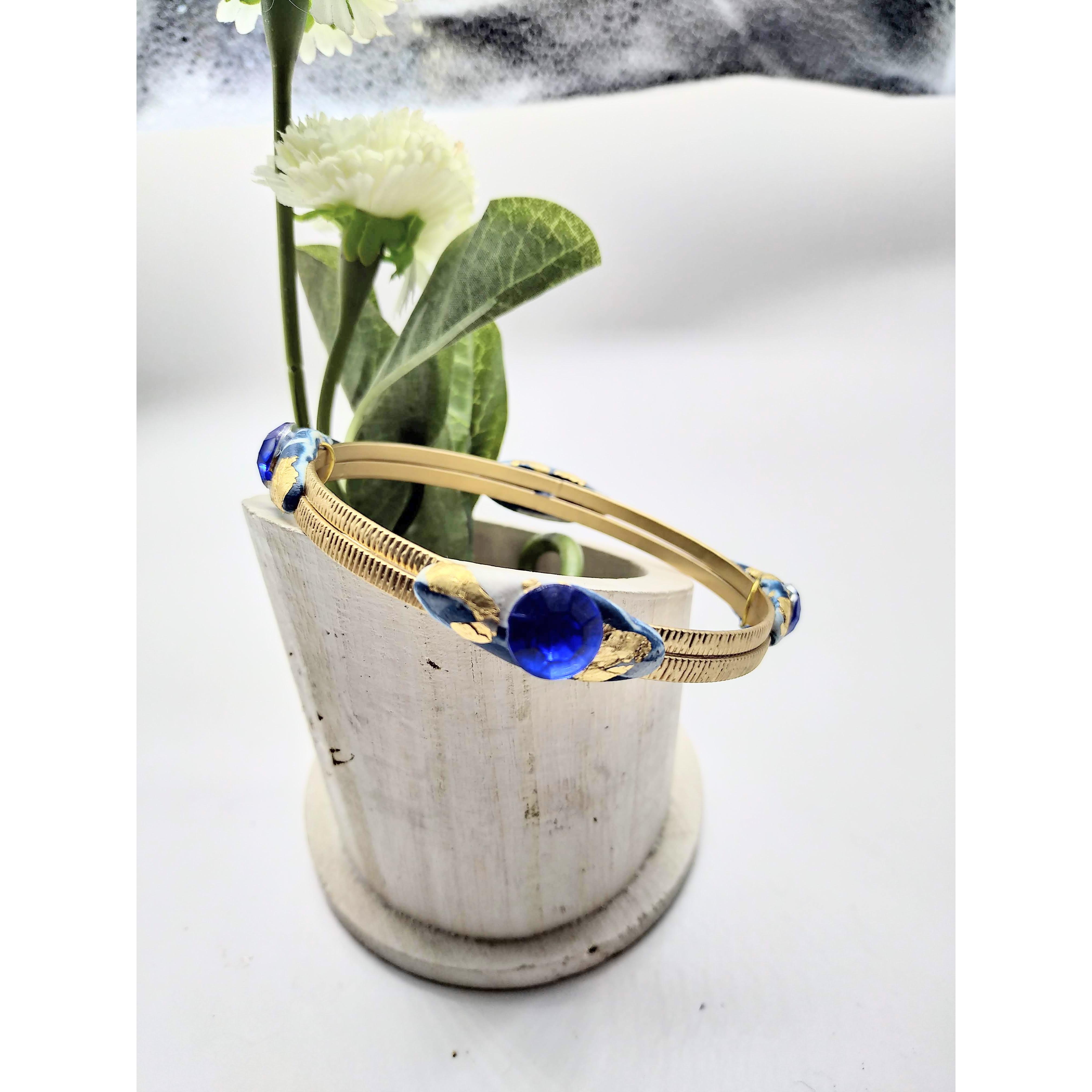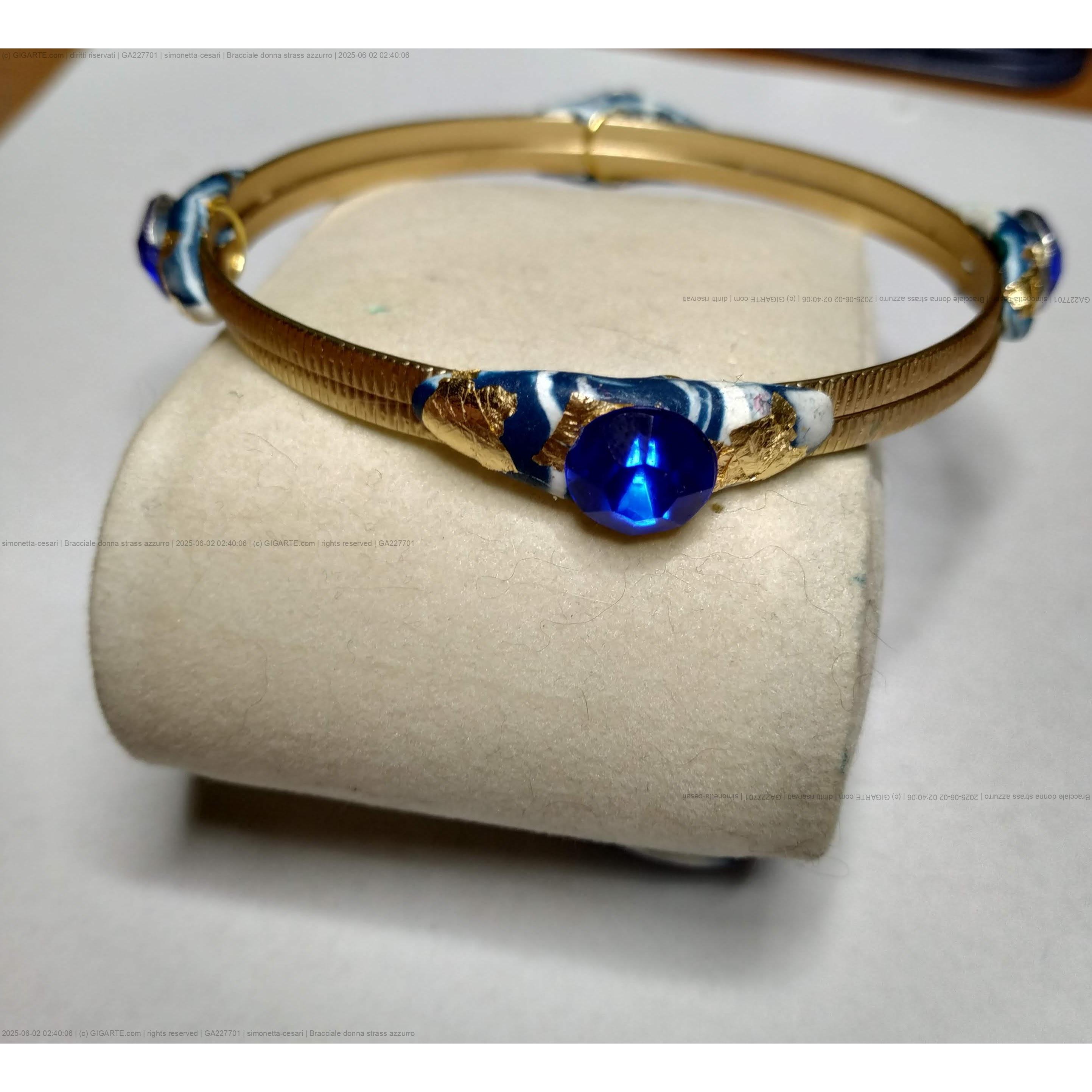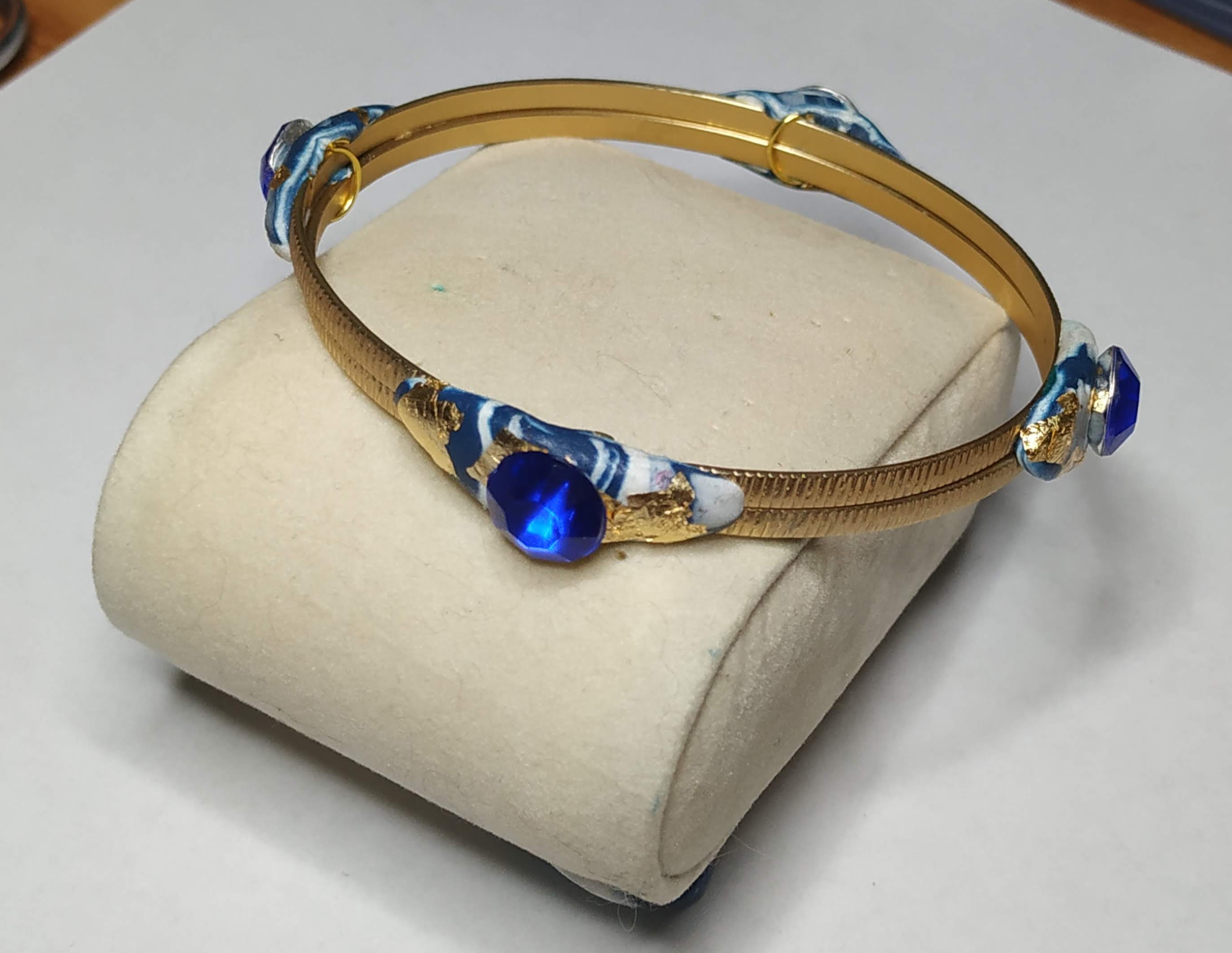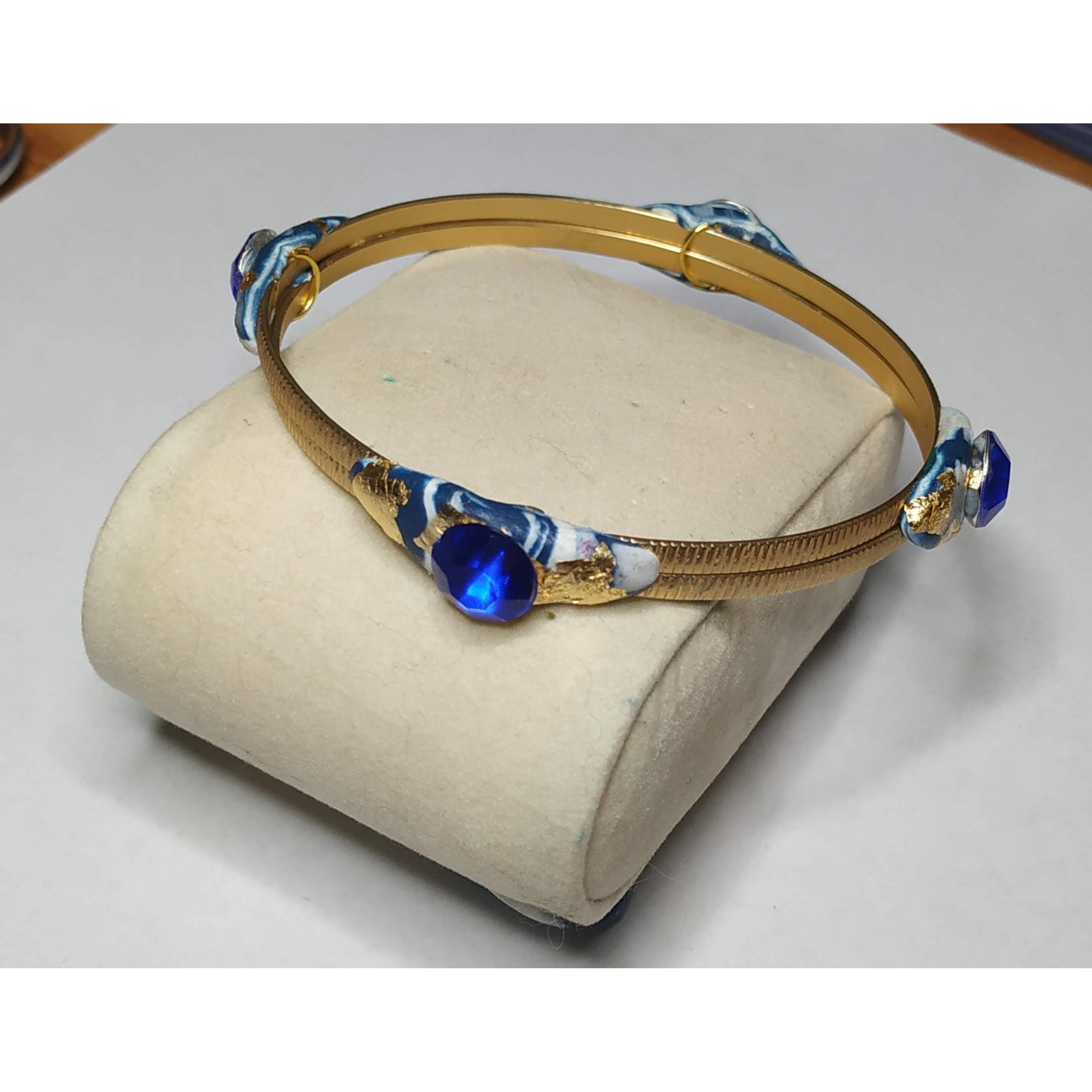 Bracciale di ottone lavorato di alta bigiotteria, con applicazioni di argilla polimerica bianca e azzurra, uno strass azzurro e piccole parti di foglia d'oro decorano il bracciale.Una creazione unica ed esclusiva nata dall'estro e la creativita' del momento. Nessun modello uguale esiste al mondo e' riproducibile con piccole differenze. La bellezza delle opere create a mano e' proprio quella di realizzare tutti pezzi unici e preziosi nella loro unicita'.