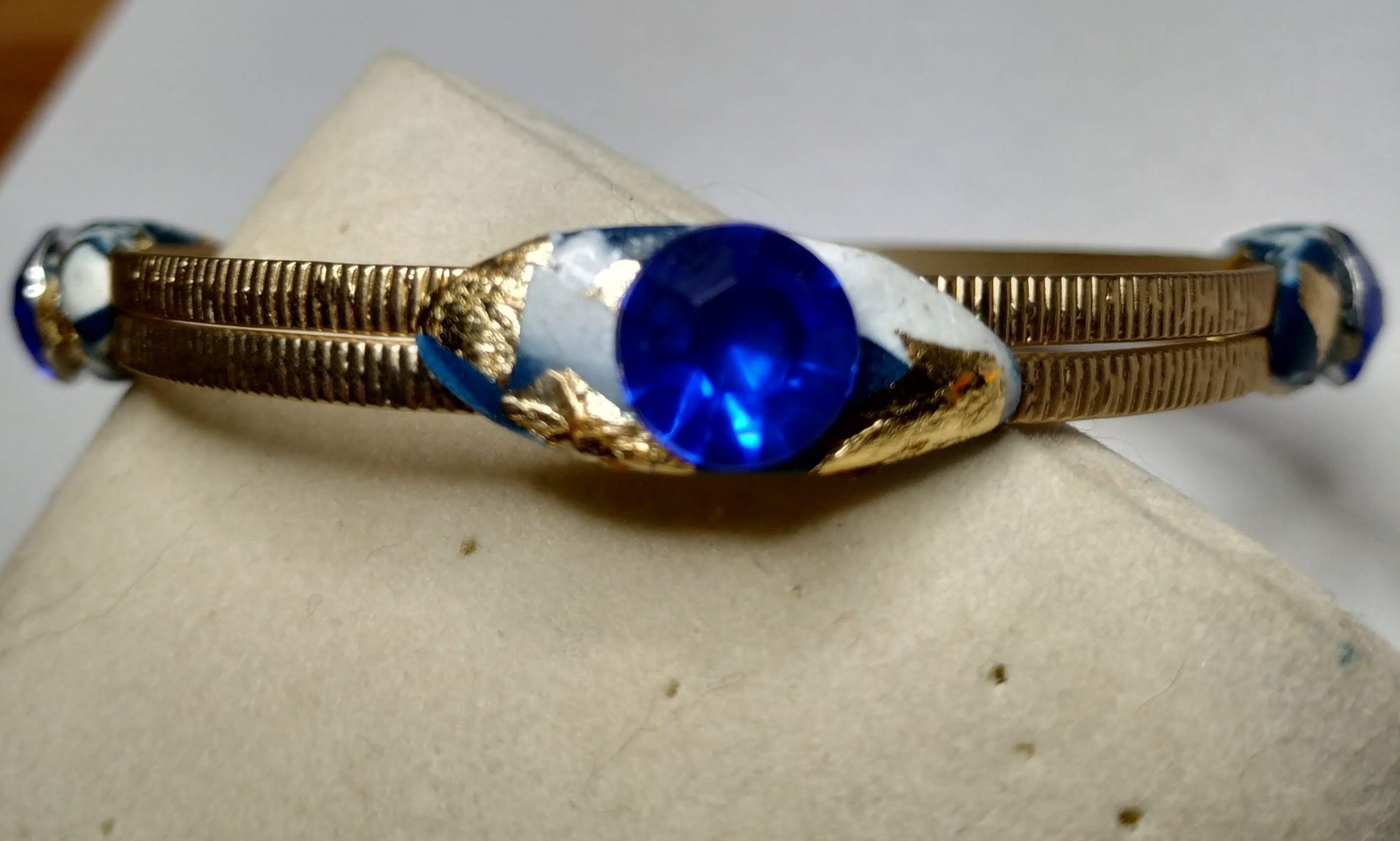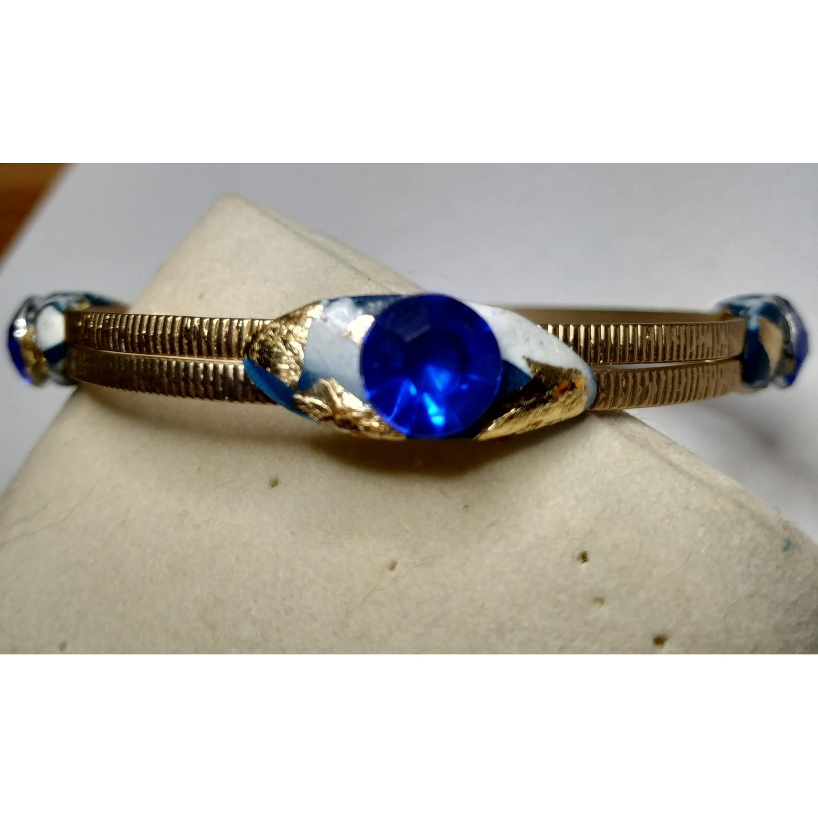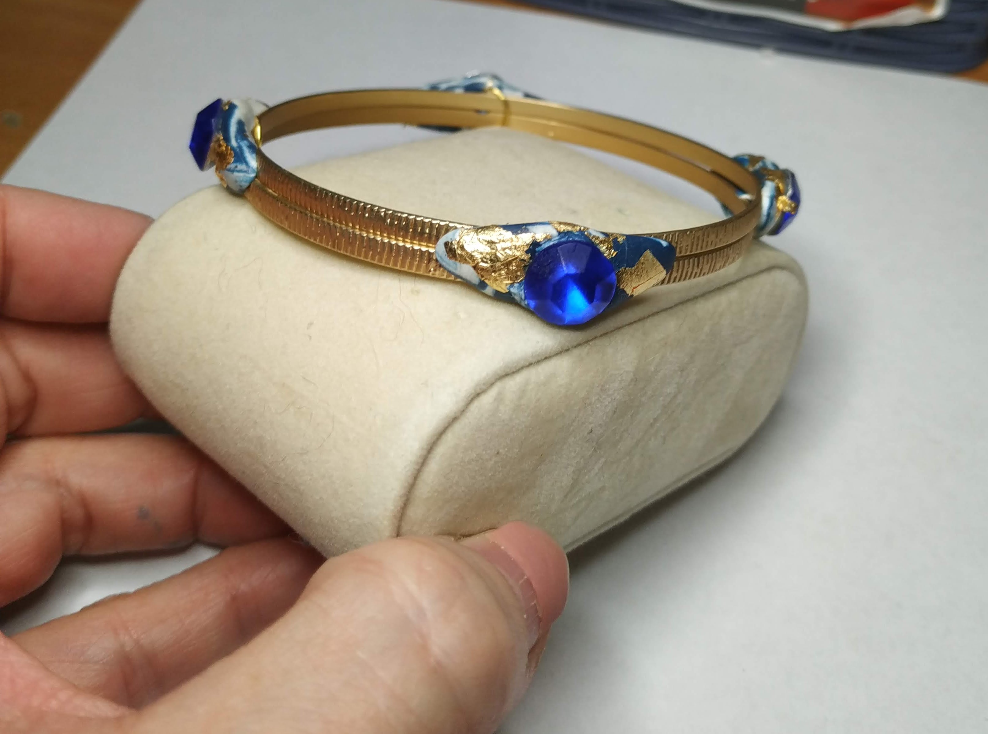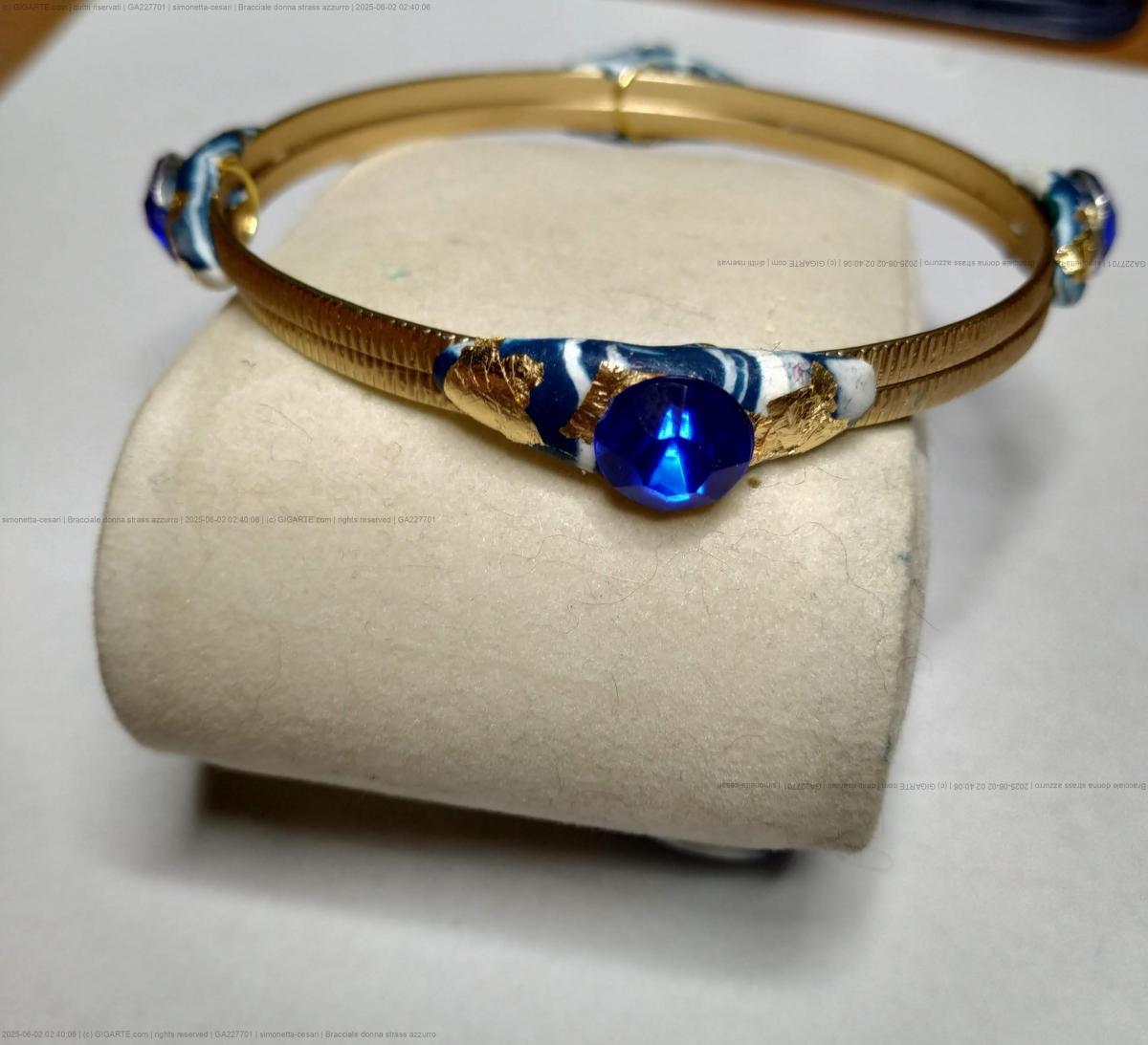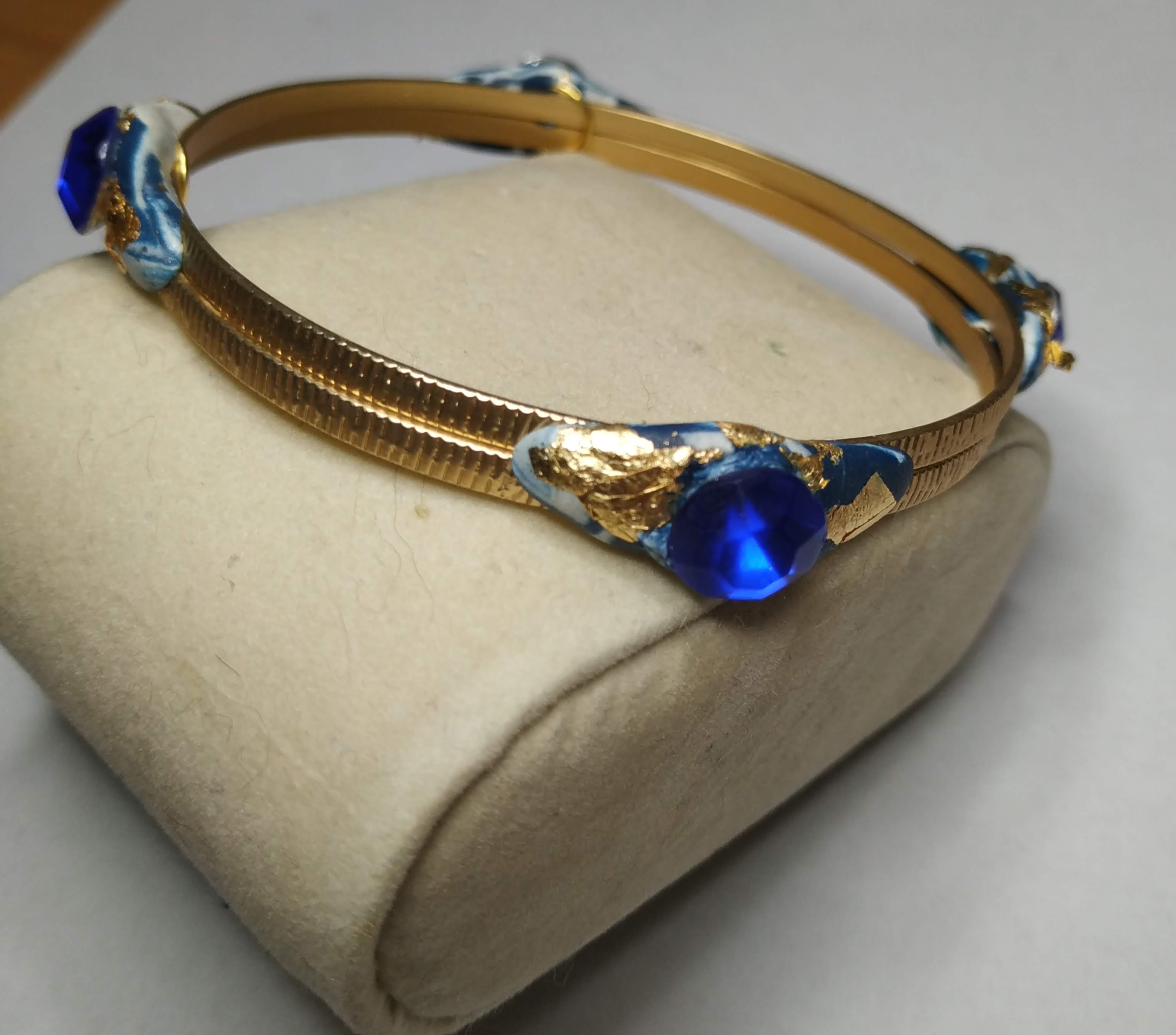 Bracciale di ottone lavorato di alta bigiotteria, con applicazioni di argilla polimerica bianca e azzurra, uno strass azzurro e piccole parti di foglia d'oro decorano il bracciale.Una creazione unica ed esclusiva nata dall'estro e la creativita' del momento. Nessun modello uguale esiste al mondo e' riproducibile con piccole differenze. La bellezza delle opere create a mano e' proprio quella di realizzare tutti pezzi unici e preziosi nella loro unicita'.