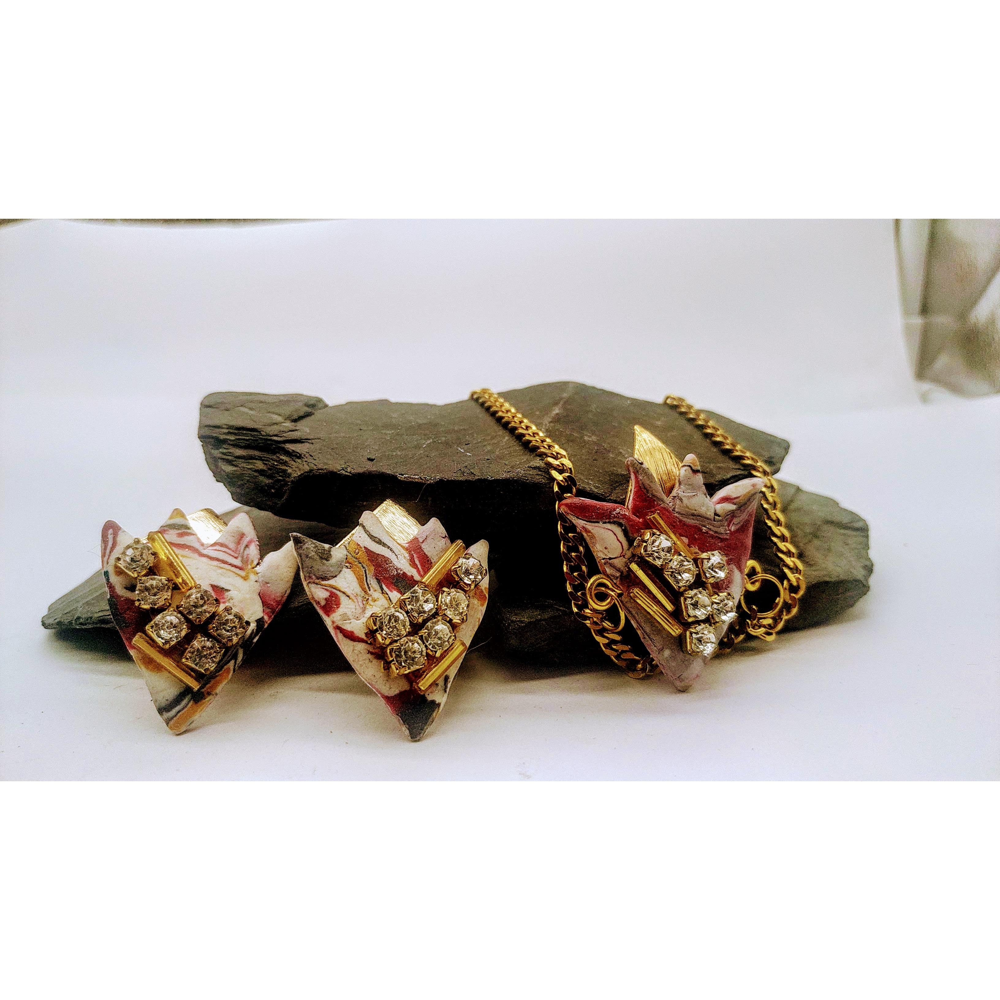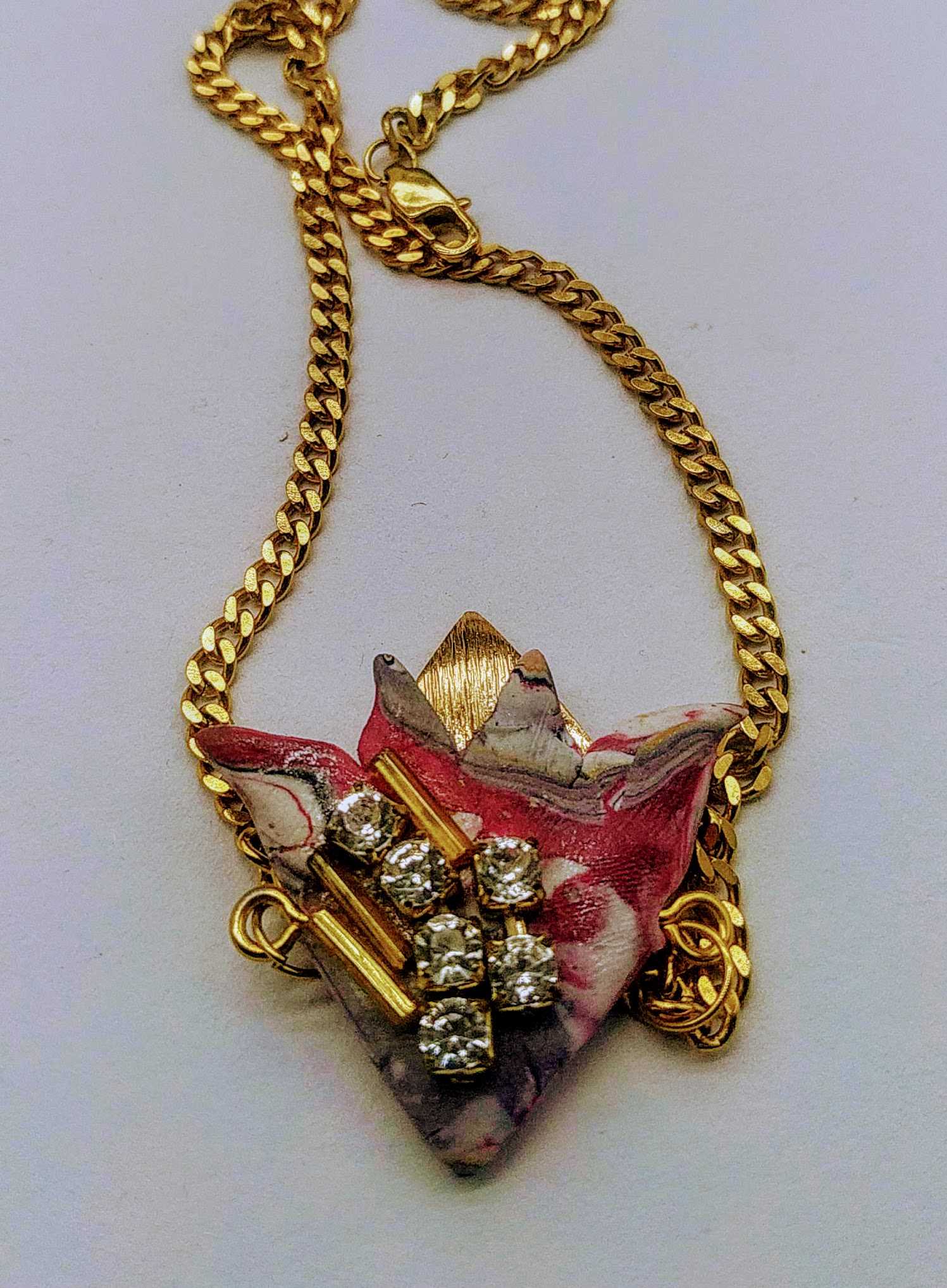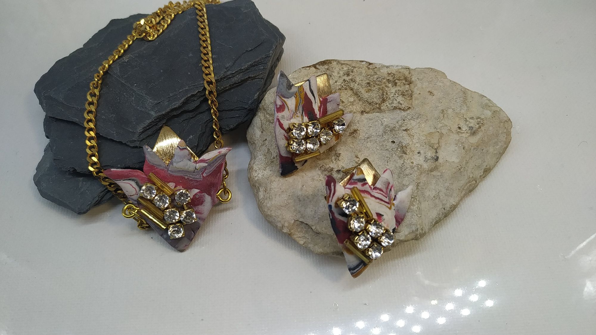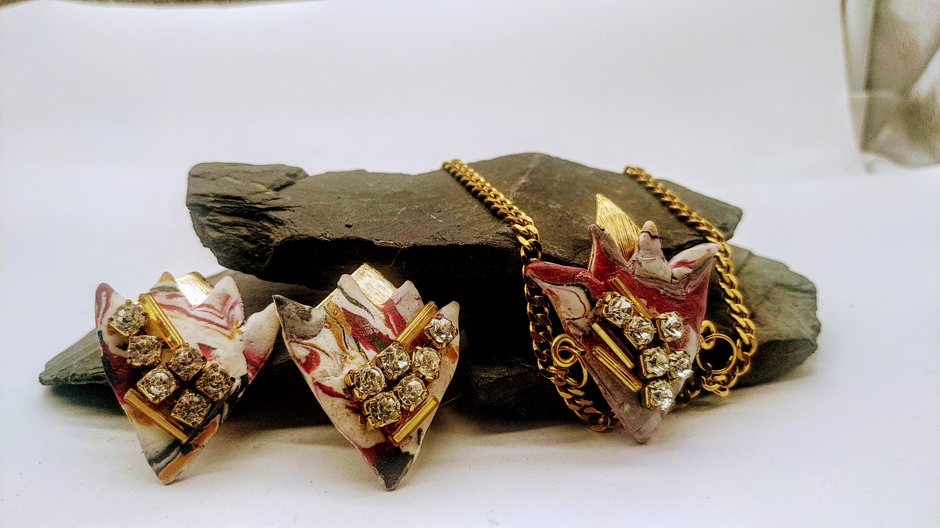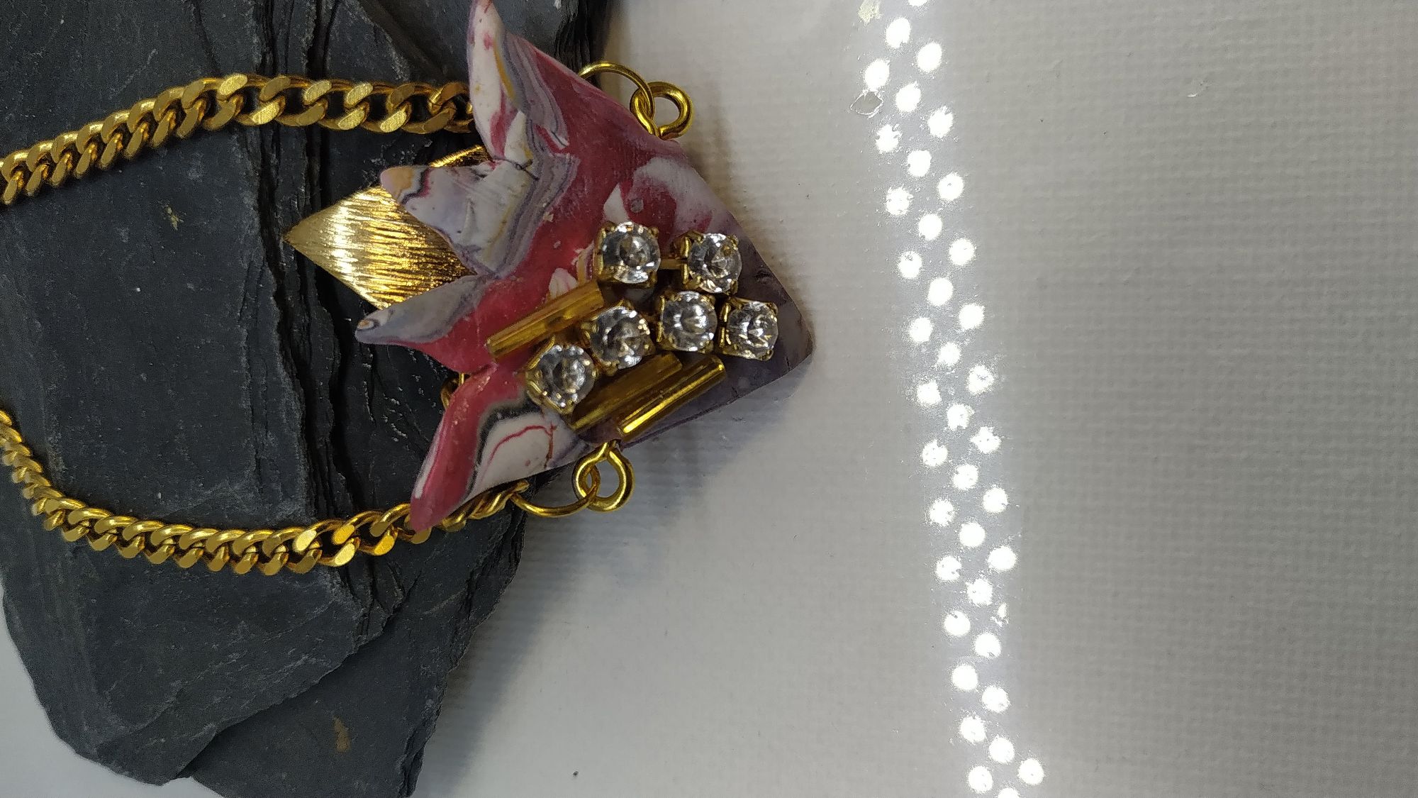 Alta bigiotteria realizzata a mano, Argilla polimerica, foglia d'oro, strass Swaroski, 2020