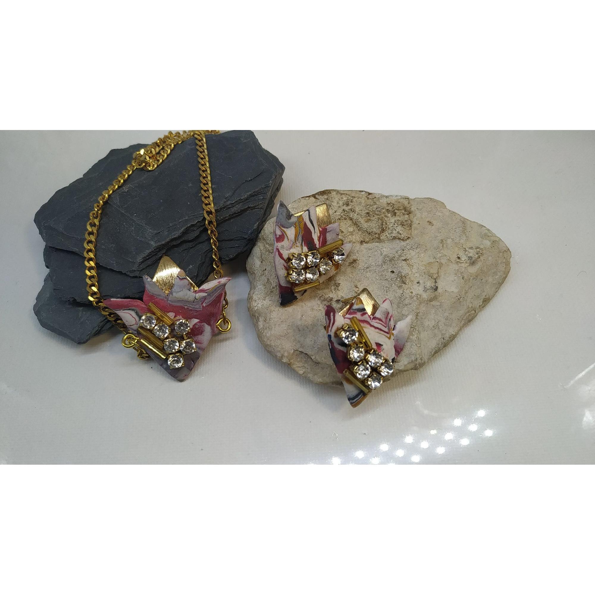 Completo tulipano, collana e orecchini multicolore a forma di tulipano il fiore dell0eleganza per eccellenza.Creato a mano ha una base placcata oro a 18 k. Decorato con Strass Swaroski bianchi, foglia d'oro e perline tubolari di vetro.Elegante, ricercato e' esclusivo e d e' un pezzo unico.