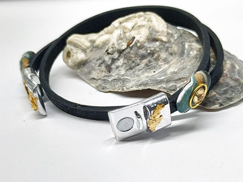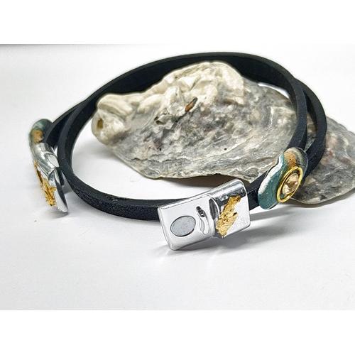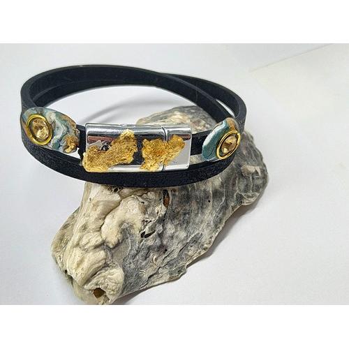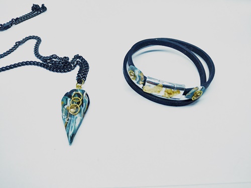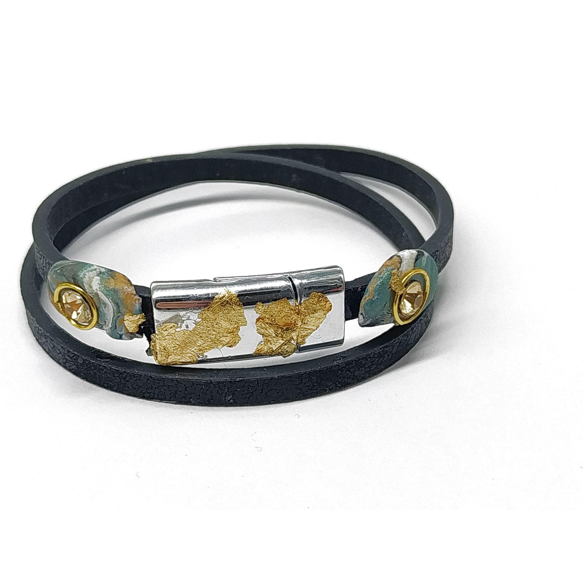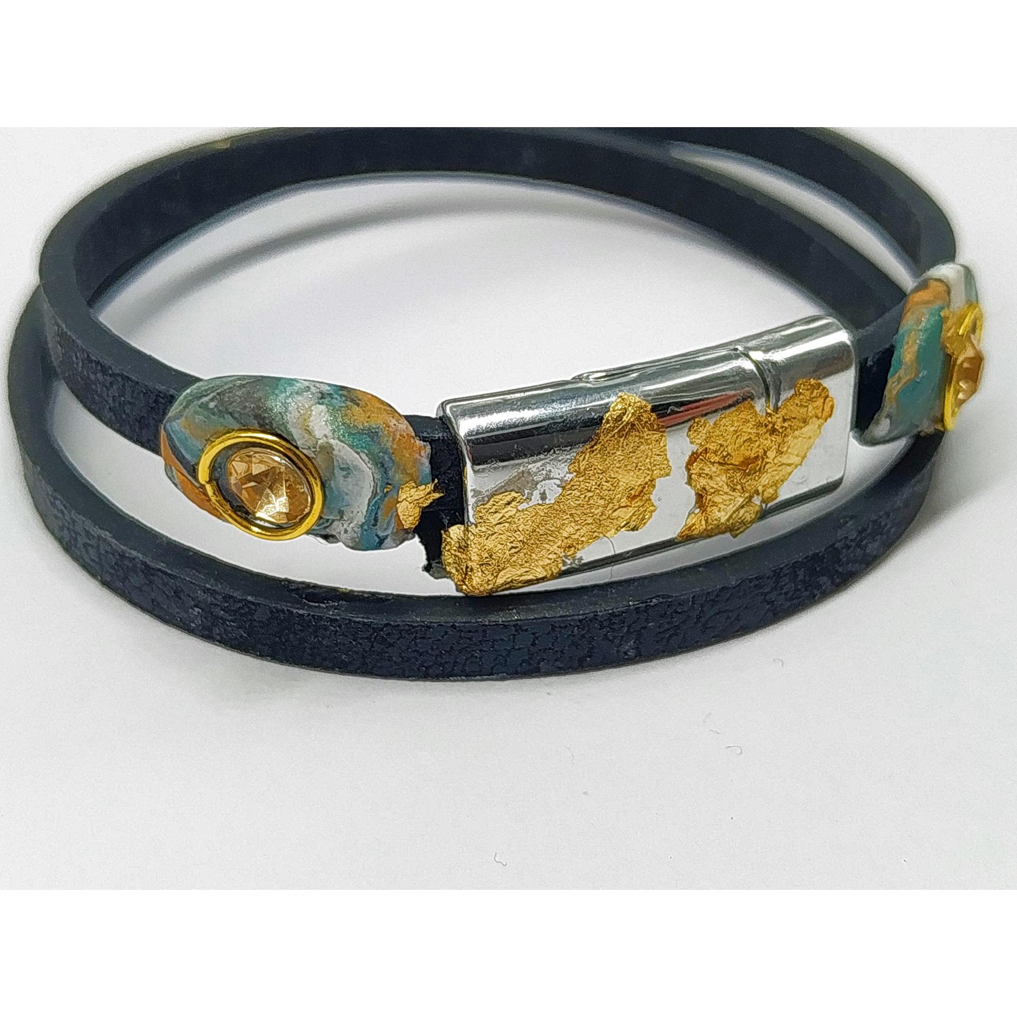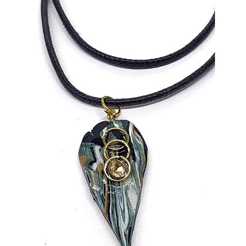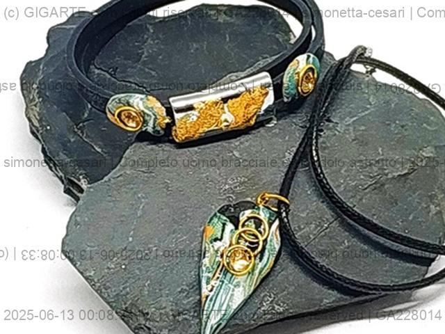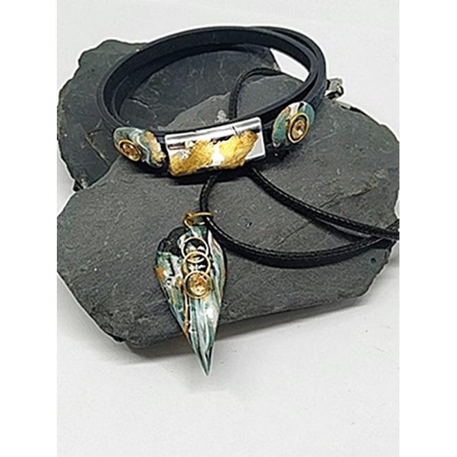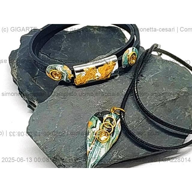 Un completo uomo bracciale e collana con ciondolo, creati a mano con sfumature di color verde e bianco.Arricchito con strass e decorazioni geometriche e foglia d'oro. Il bracciale in cuoio nero con chiusura magnetica, con applicazioni di argilla polimerica e strass. Un completo innovativo, elegante e ricercato.