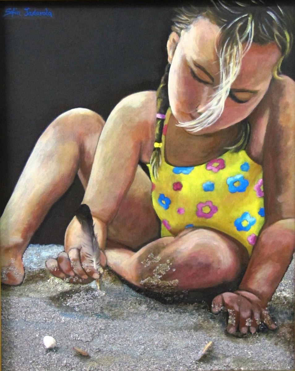 Interessante l'accostamento fra le quinte materiche e la pittura figurativa curata nei dettagli. Curioso ed intrigante l'inserimento di una vera collana che eleva sensibilità femminile.