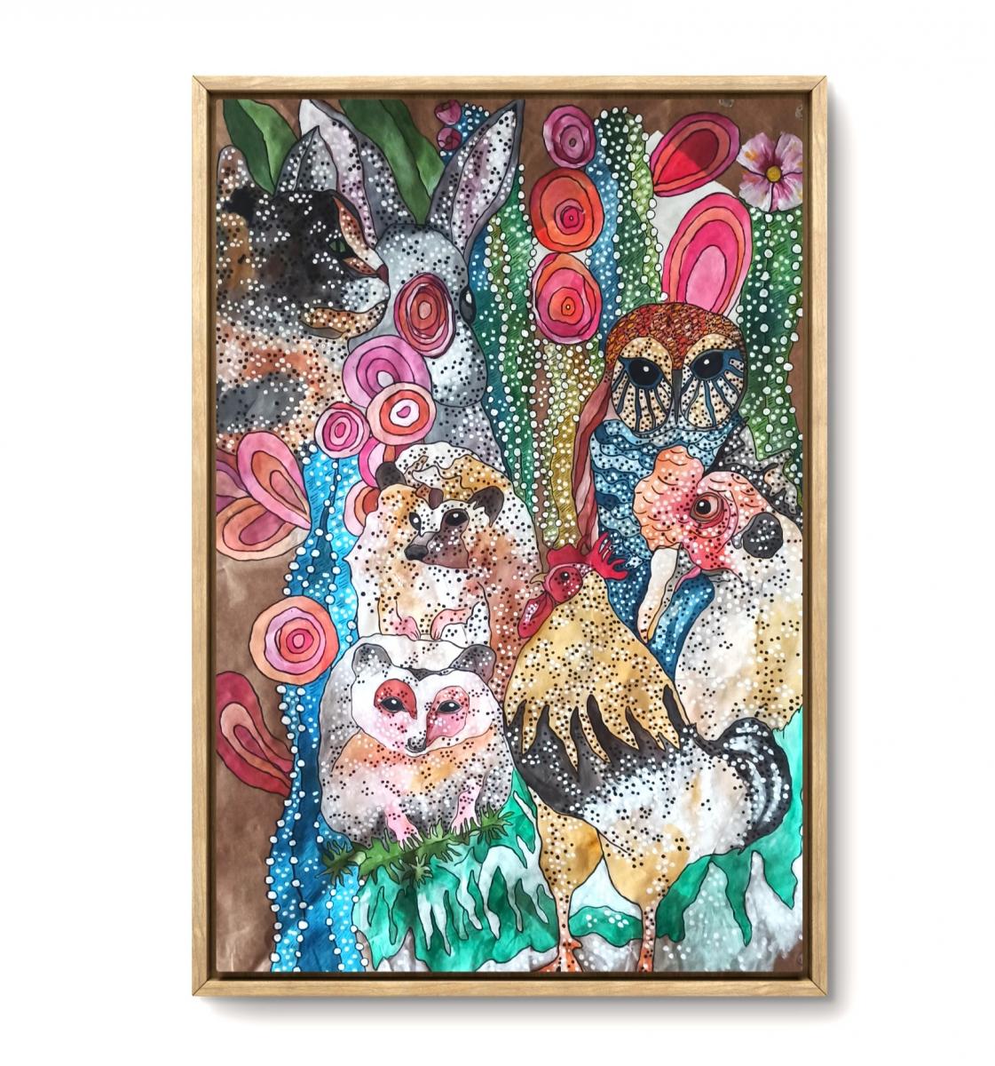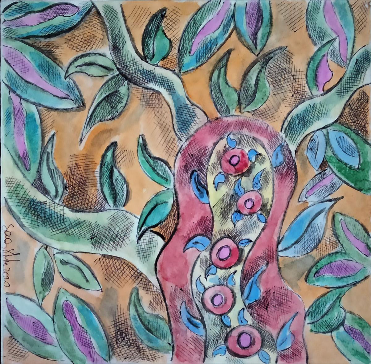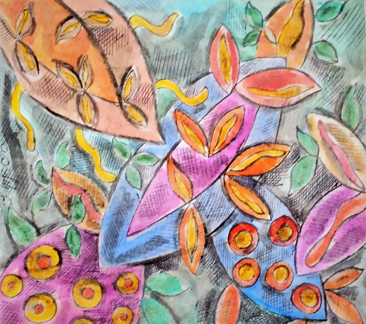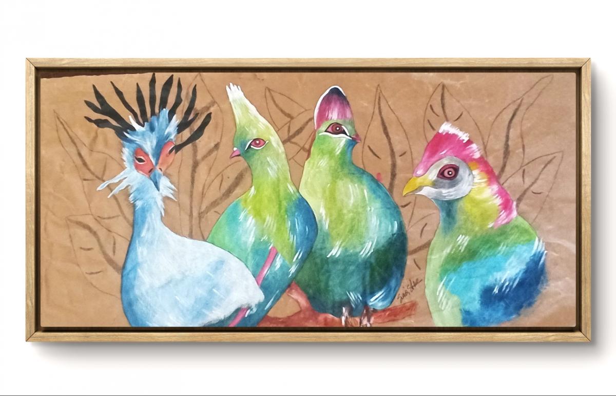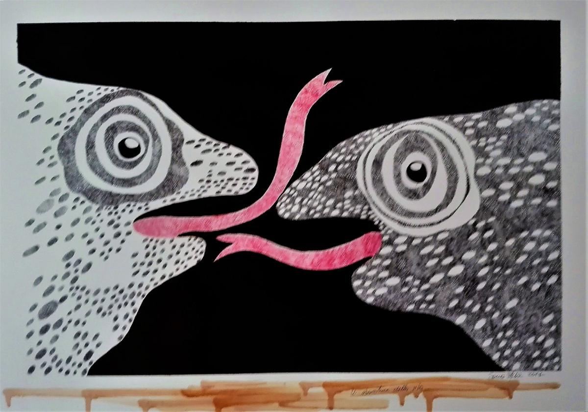 Sono tutte opere realizzate su carta di cotone , ho utilizzzato varie tecniche, acquarello, penna, colore acrilico, vernici. La misura dei fogli è sempre 50x70 , è stato un lavoro che ho portato avanti per circa un anno, il colore è ridotto al minimo, le forme sono minimali, eleganti e stilizzate, sono rappresentati dei paesaggi e i camaleonti