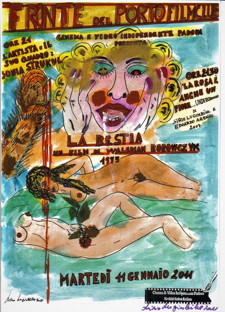 Bellissima locandina disegnata da Sirio Luginbhul , che curava la rassegna di cinema indipendente, al Fronte del Porto Film Club . Presentava un ' artista e un suo quadro a cui abbinava un film,questa fu la serata dedicata a me.
