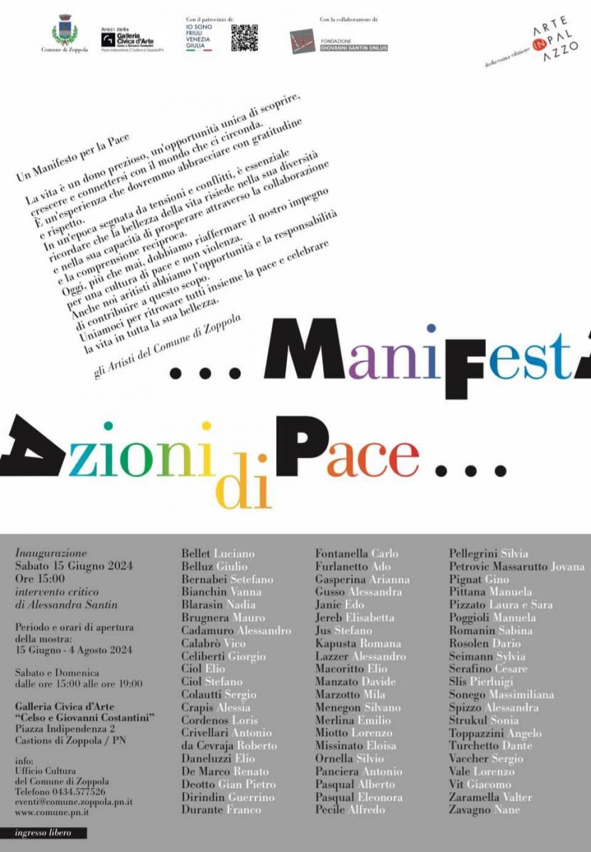 Un Manifesto per la Pace La vita è un dono prezioso, un'opportunità unica di scoprire, crescere e connettersi con il mondo che ci circonda. È un'esperienza che dovremmo abbracciare con gratitudine e rispetto.In un'epoca segnata da tensioni e conflitti, è essenziale ricordare che la bellezza della vita risiede nella sua diversità e nella sua capacità di prosperare attraverso la collaborazionee la comprensione reciproca. Oggi, più che mai, dobbiamo riaffermare il nostroimpegno per una cultura di pace e non violenza. Anche noi aritisti abbiamo l’opportunità e la responsabilità di contribuire a questo scopo.Uniamoci per ritrovare tutti insieme la pace e celebrare la vita in tutta la sua bellezza.Gli Artisti del Comune di Zoppola.