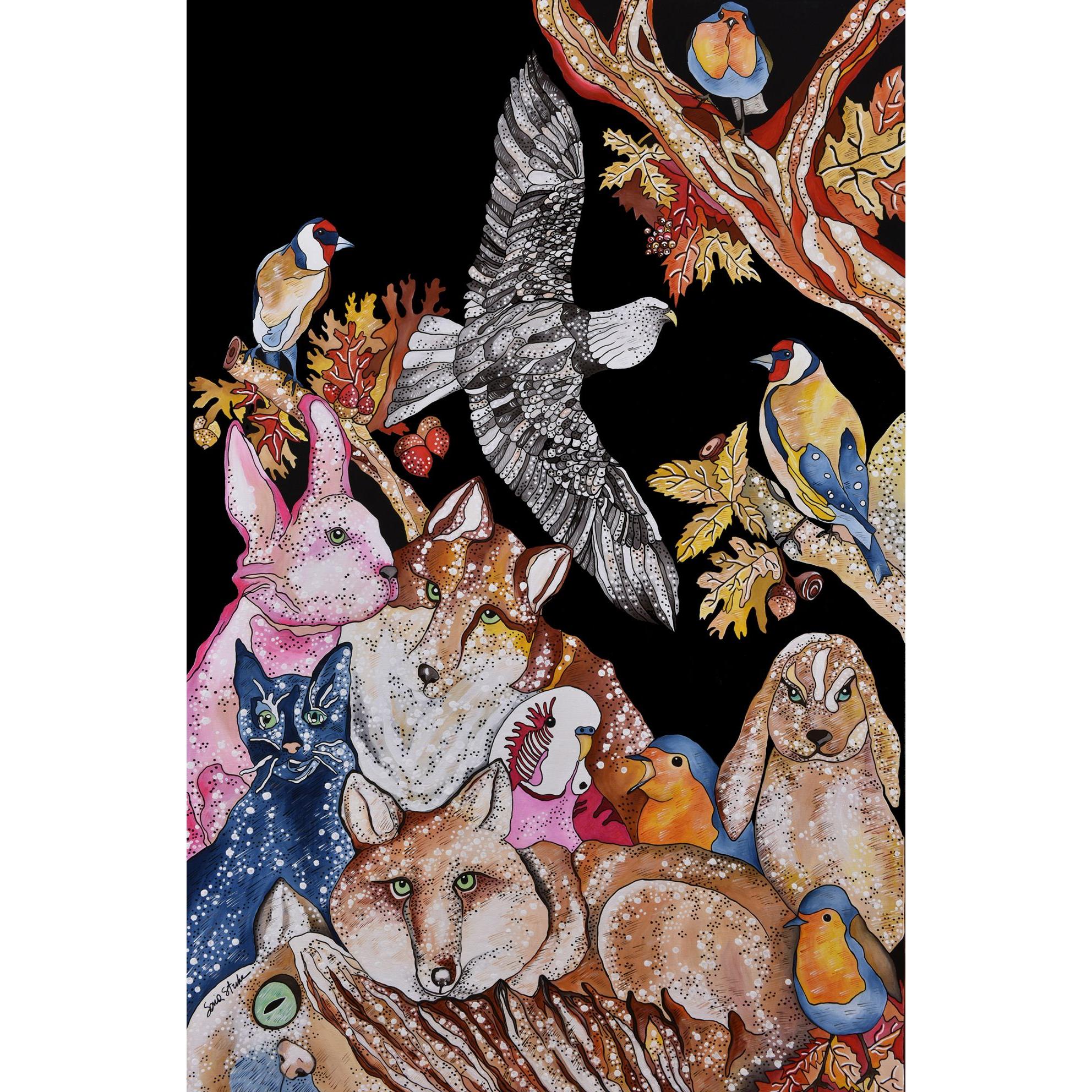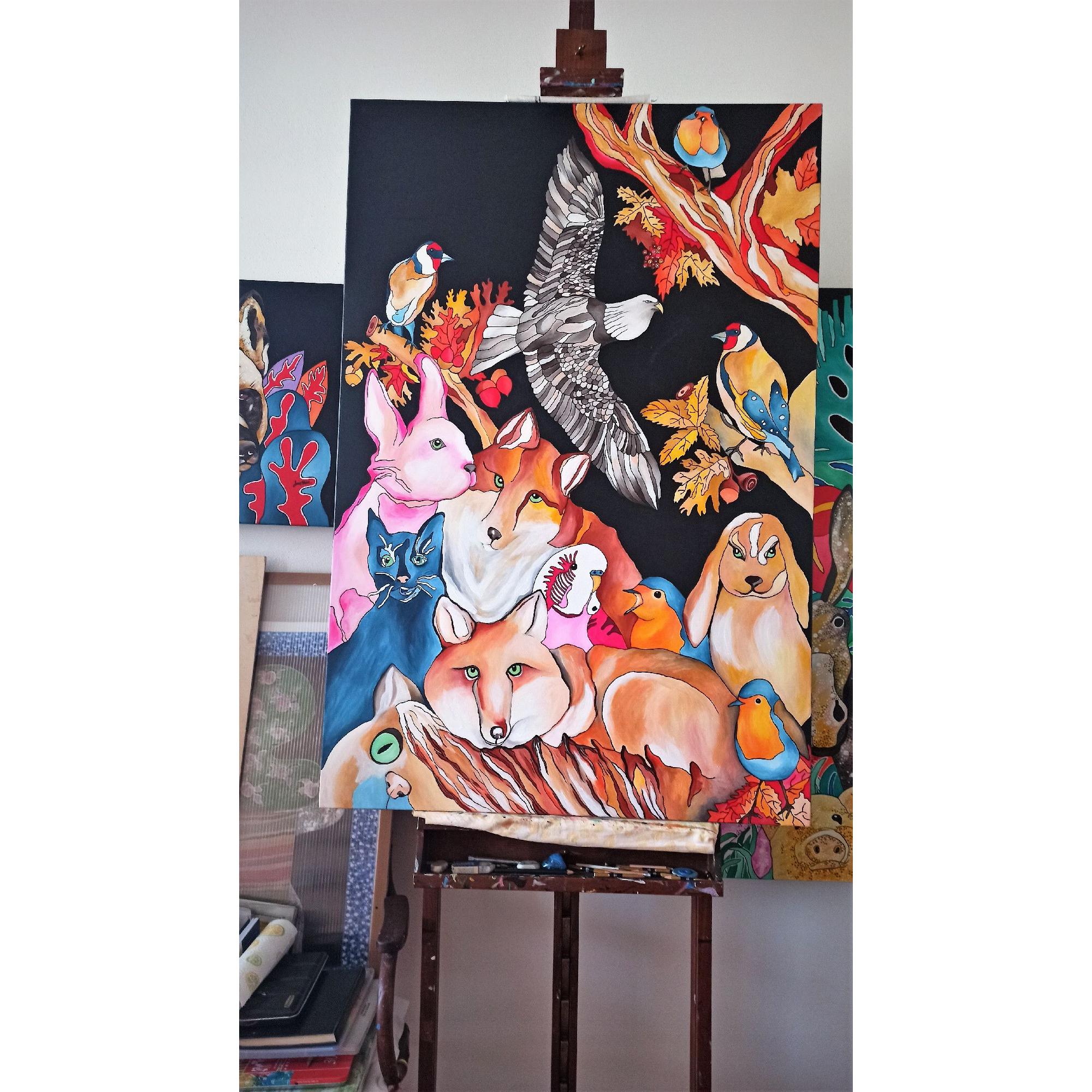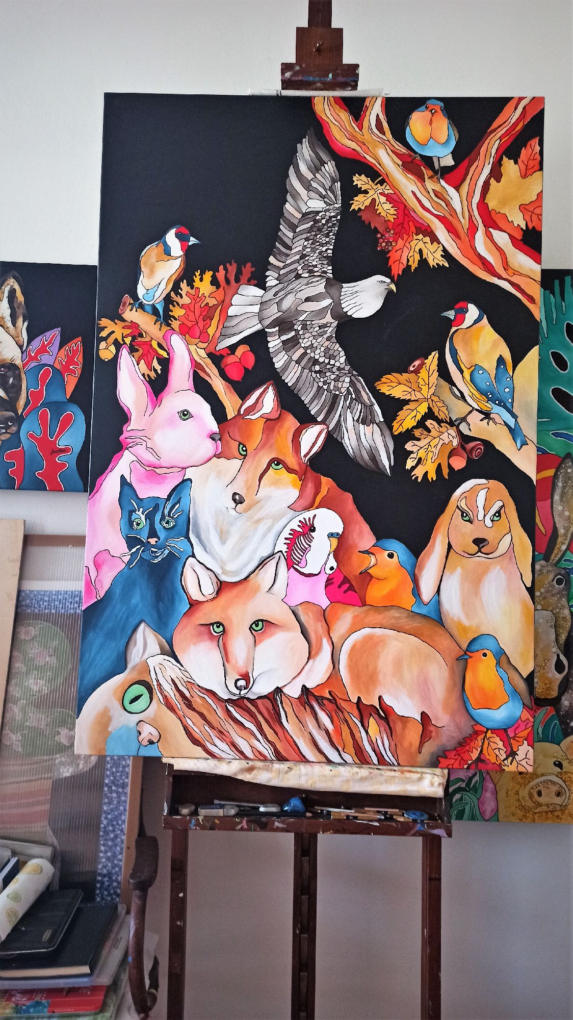 Questa opera fa parte della mia ultima produzione, che sono appunto dei gruppi di animali che in natura non possono coesistere, ma nei miei quadri tutto è possibile è una sorta di Eden in cui non esiste la soppraffazione , dove regna l' armonia, il tanto agnognato Paradiso perduto e qui idealmente ritrovato.I colori sono caldi e avvolgenti i differenti regni animali convivono