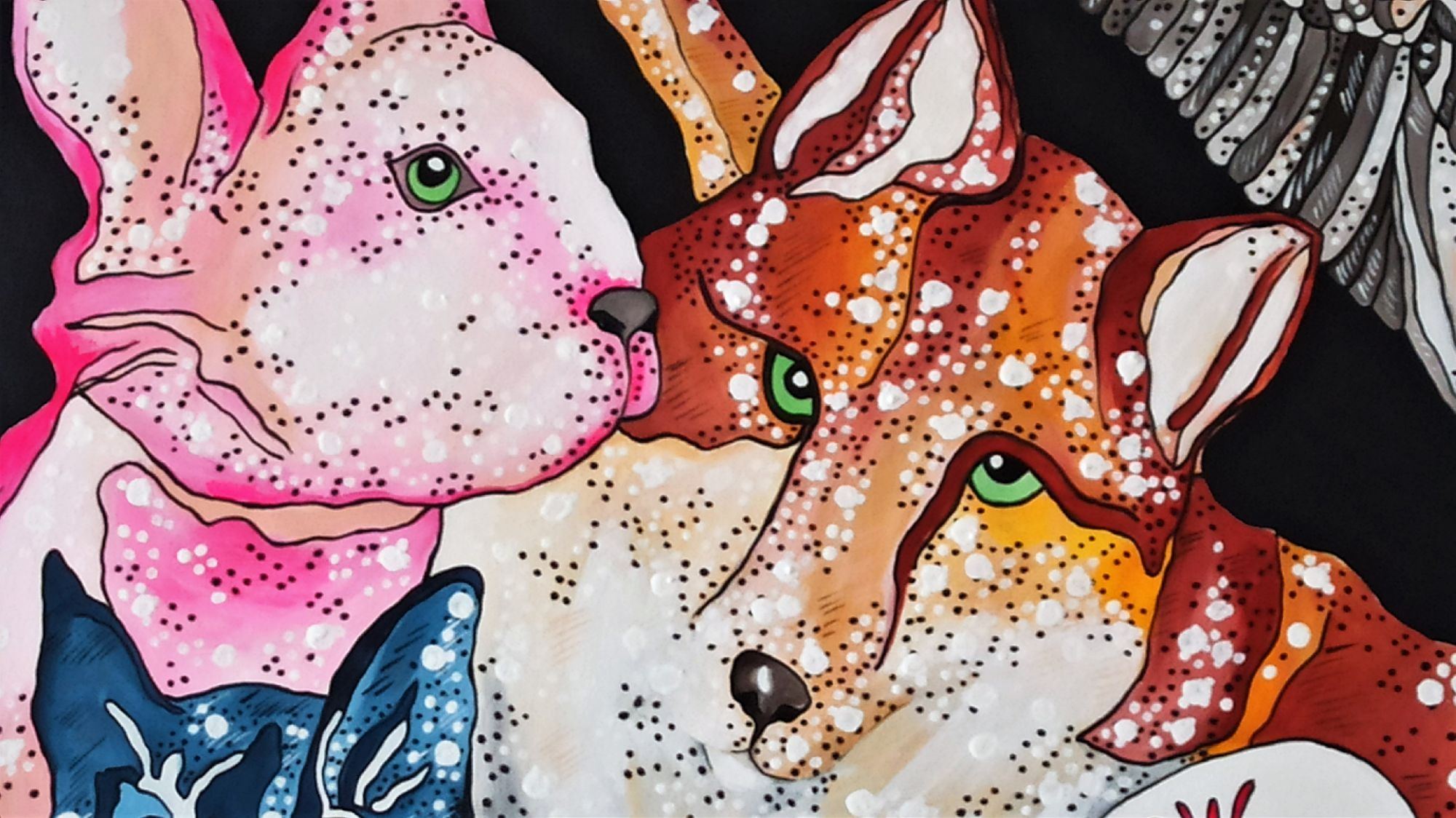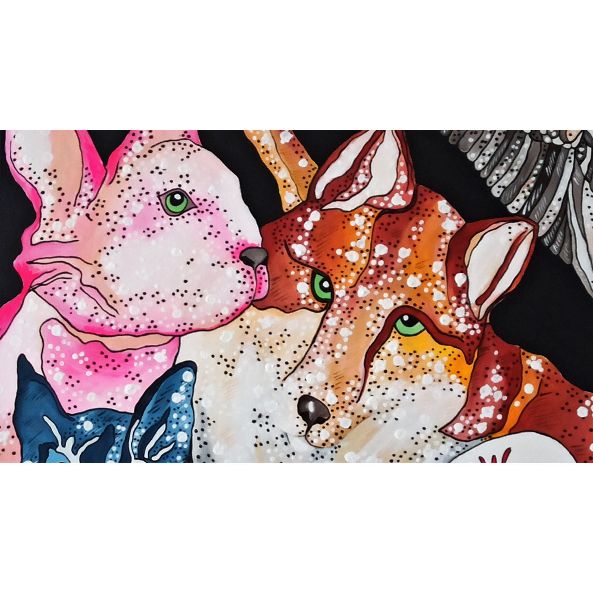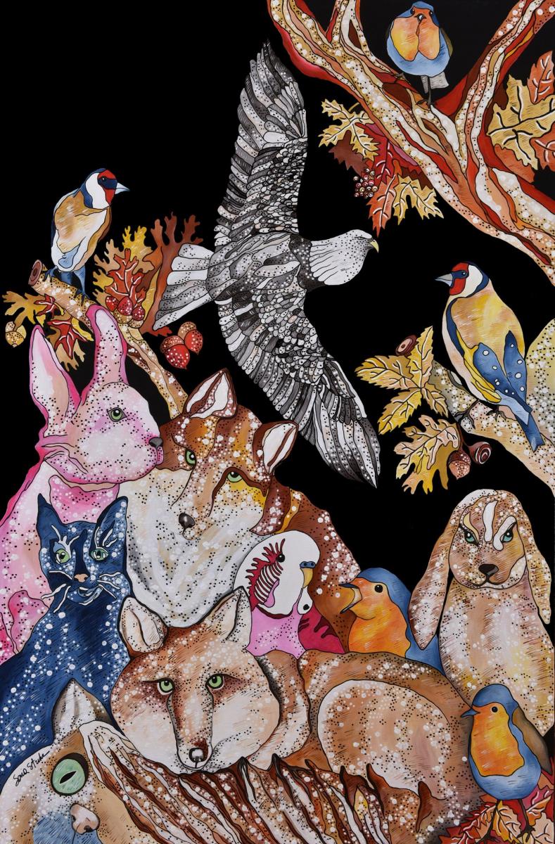 Questa opera fa parte della mia ultima produzione, che sono appunto dei gruppi di animali che in natura non possono coesistere, ma nei miei quadri tutto è possibile è una sorta di Eden in cui non esiste la soppraffazione , dove regna l' armonia, il tanto agnognato Paradiso perduto e qui idealmente ritrovato.I colori sono caldi e avvolgenti i differenti regni animali convivono