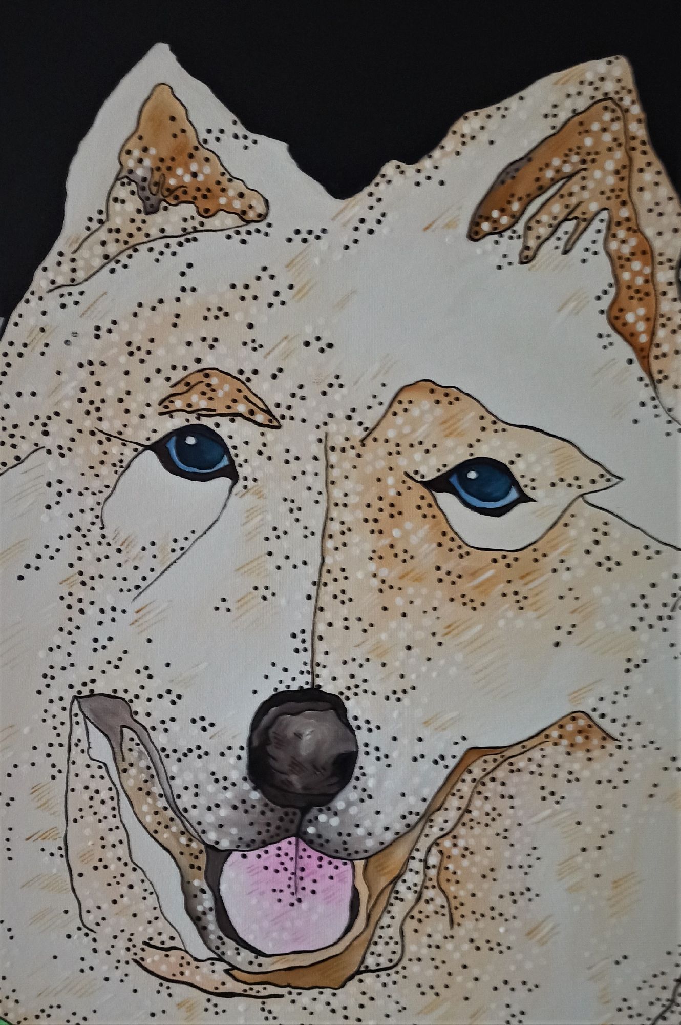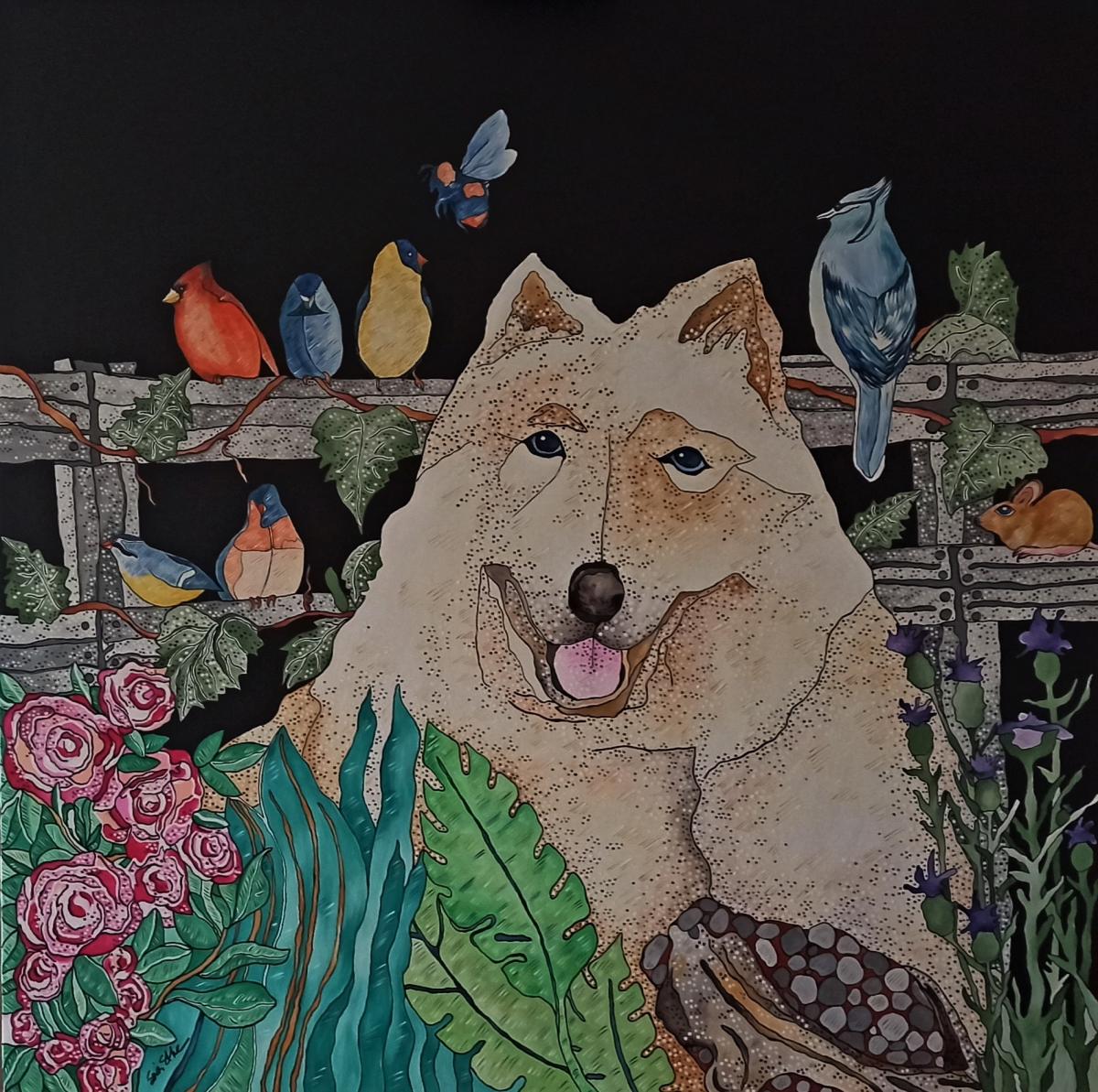 Questo quadro è una commissione ritrae un samoiedo immerso in un contesto di natura con uccellini e altri piccoli animali