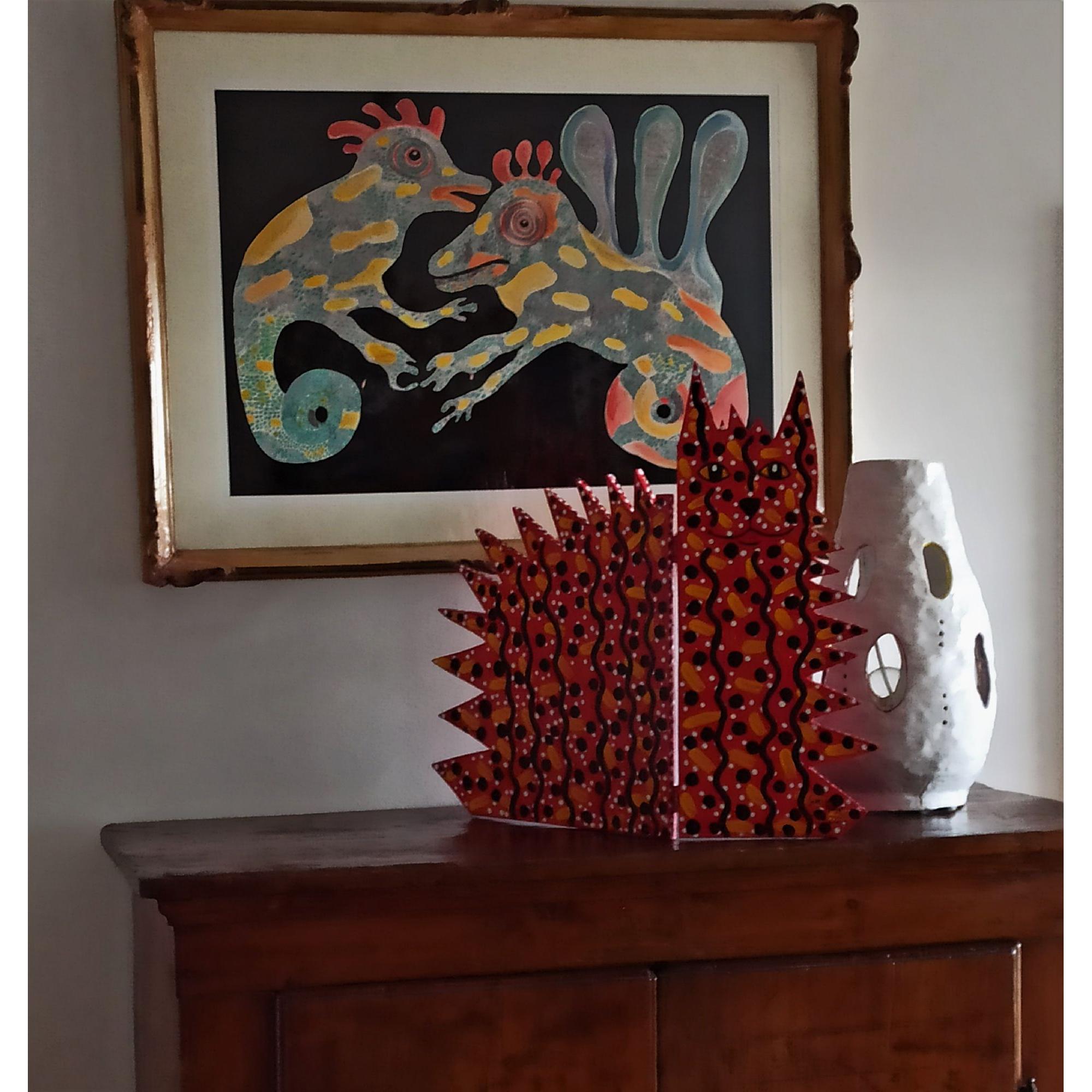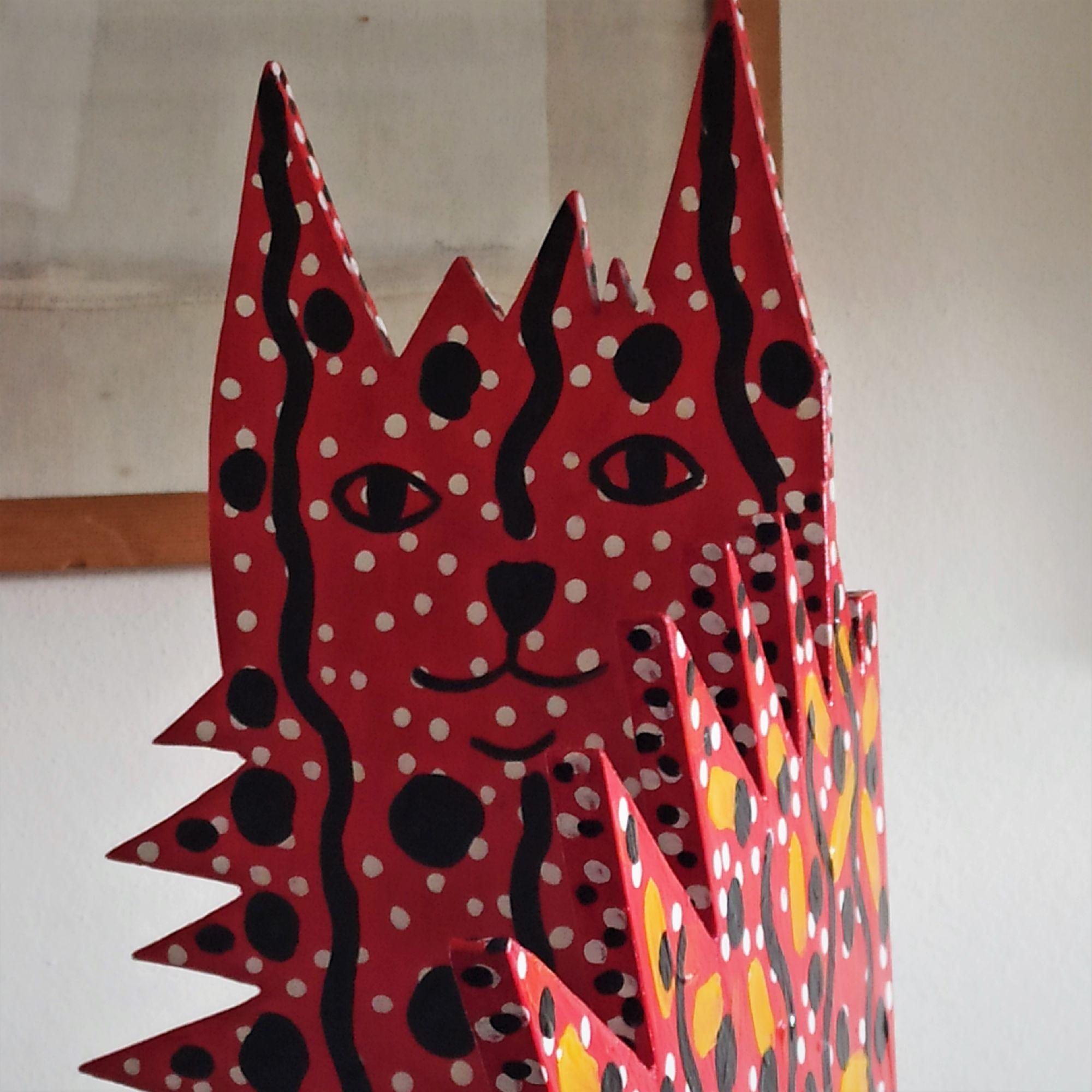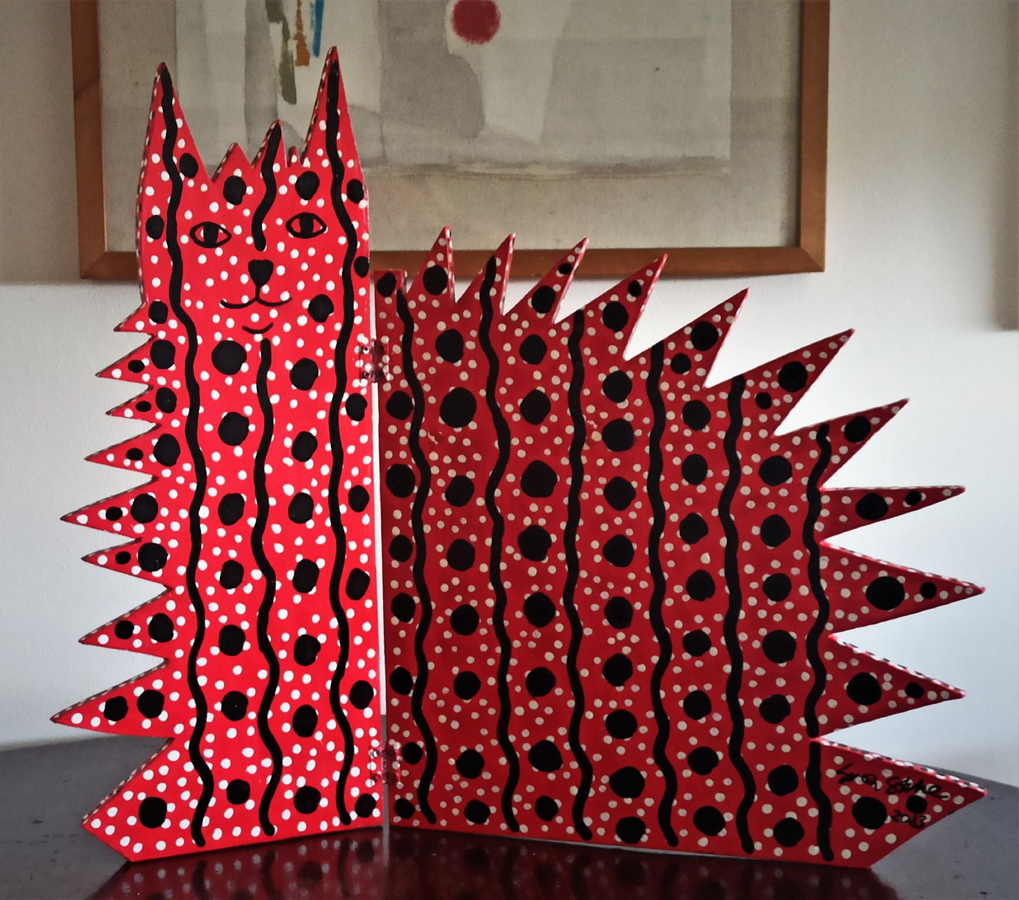 Questo piccolo paravento è stato realizzato sul modello di un' altro paravento gatto da me realizzato nel 1987 molto più grande. In questo caso diventa un oggetto d' arredamento nel senso che può essere appoggiato su un mobile pur mantenendo le stesse caratteristiche del fratello di grandi dimensioni. In oltre è dipinto su entrambi i lati da qui il titolo "Gatto Doppio"