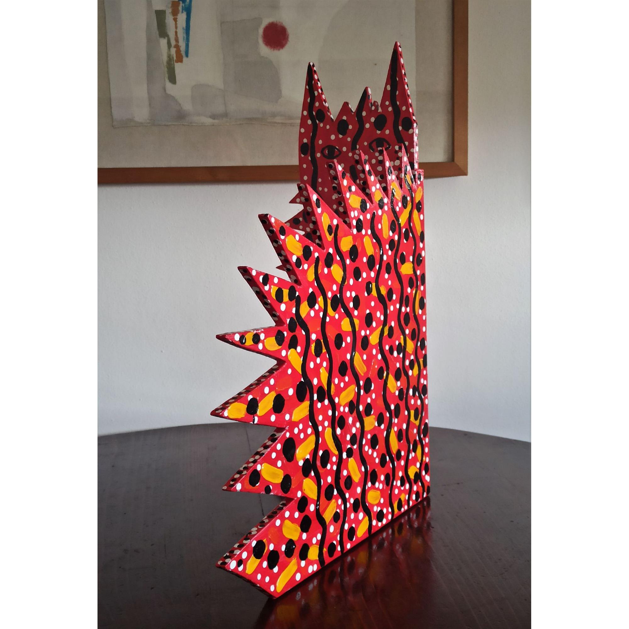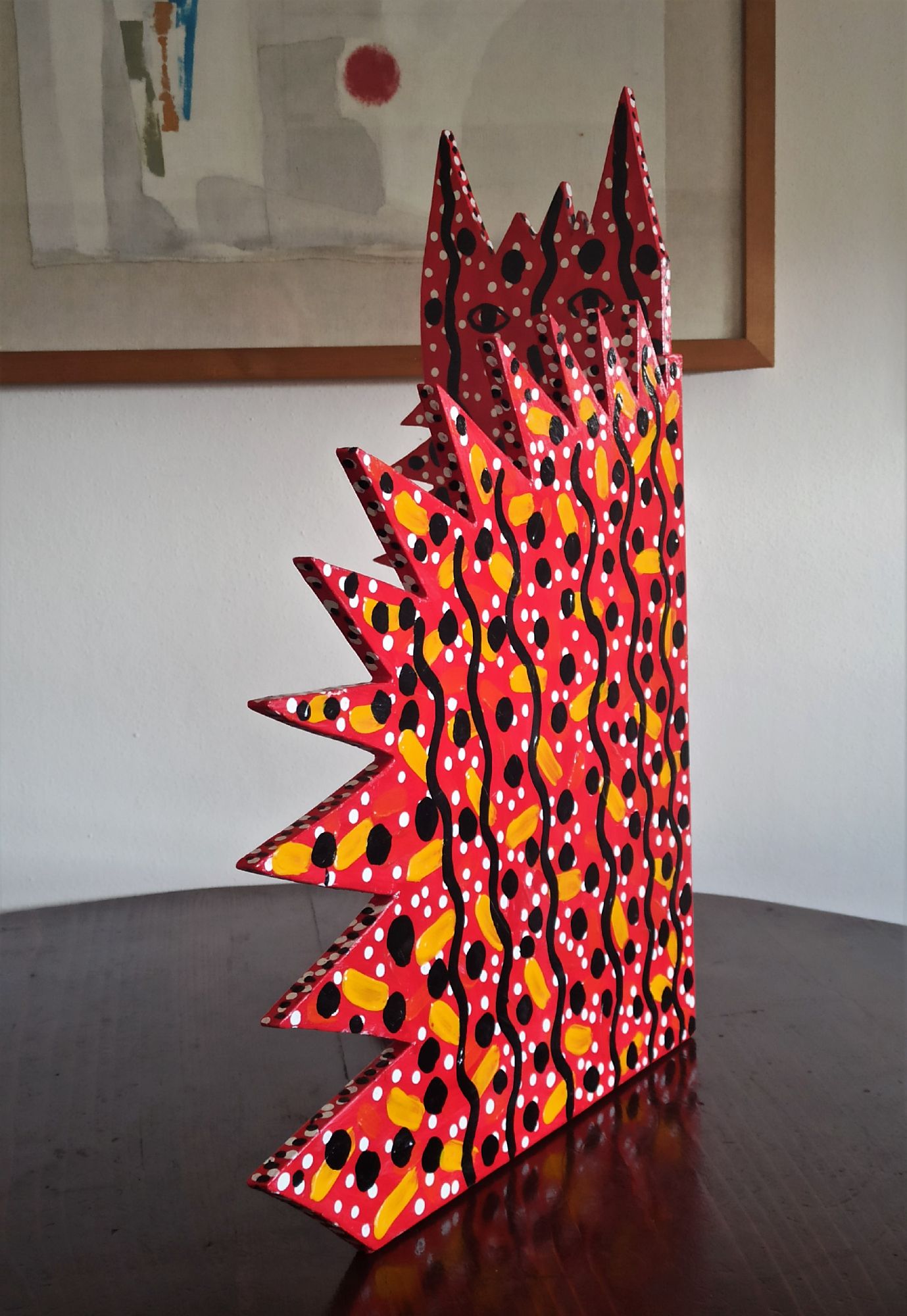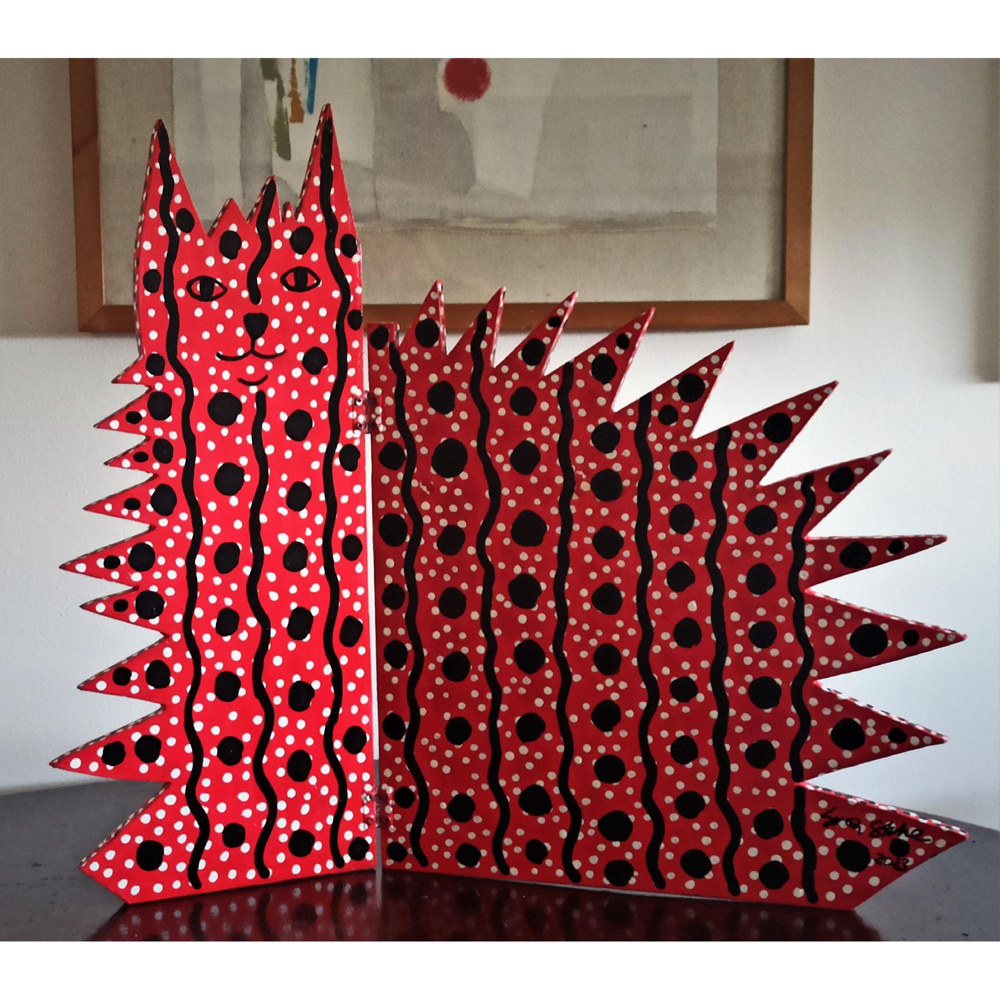 Questo piccolo paravento è stato realizzato sul modello di un' altro paravento gatto da me realizzato nel 1987 molto più grande. In questo caso diventa un oggetto d' arredamento nel senso che può essere appoggiato su un mobile pur mantenendo le stesse caratteristiche del fratello di grandi dimensioni. In oltre è dipinto su entrambi i lati da qui il titolo "Gatto Doppio"