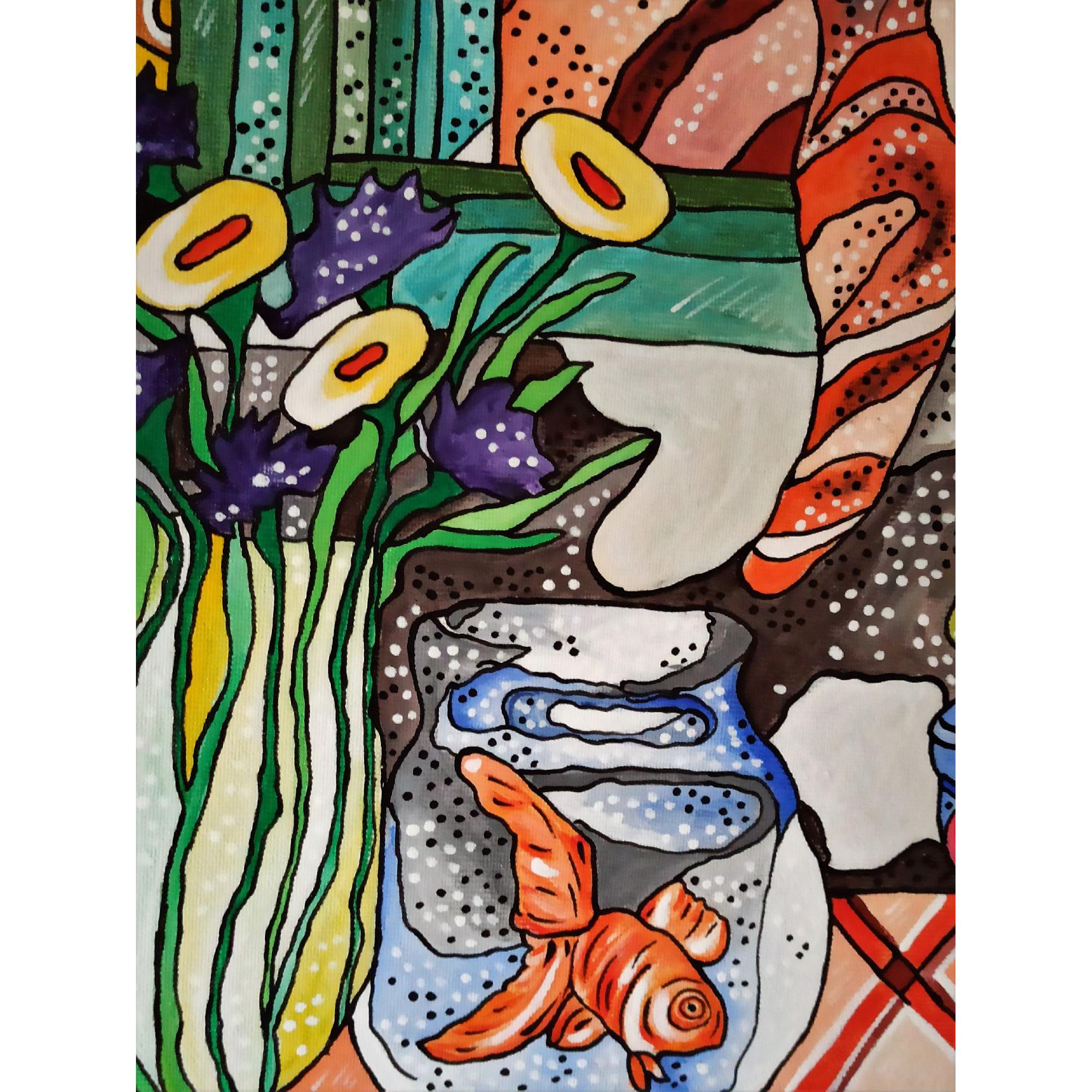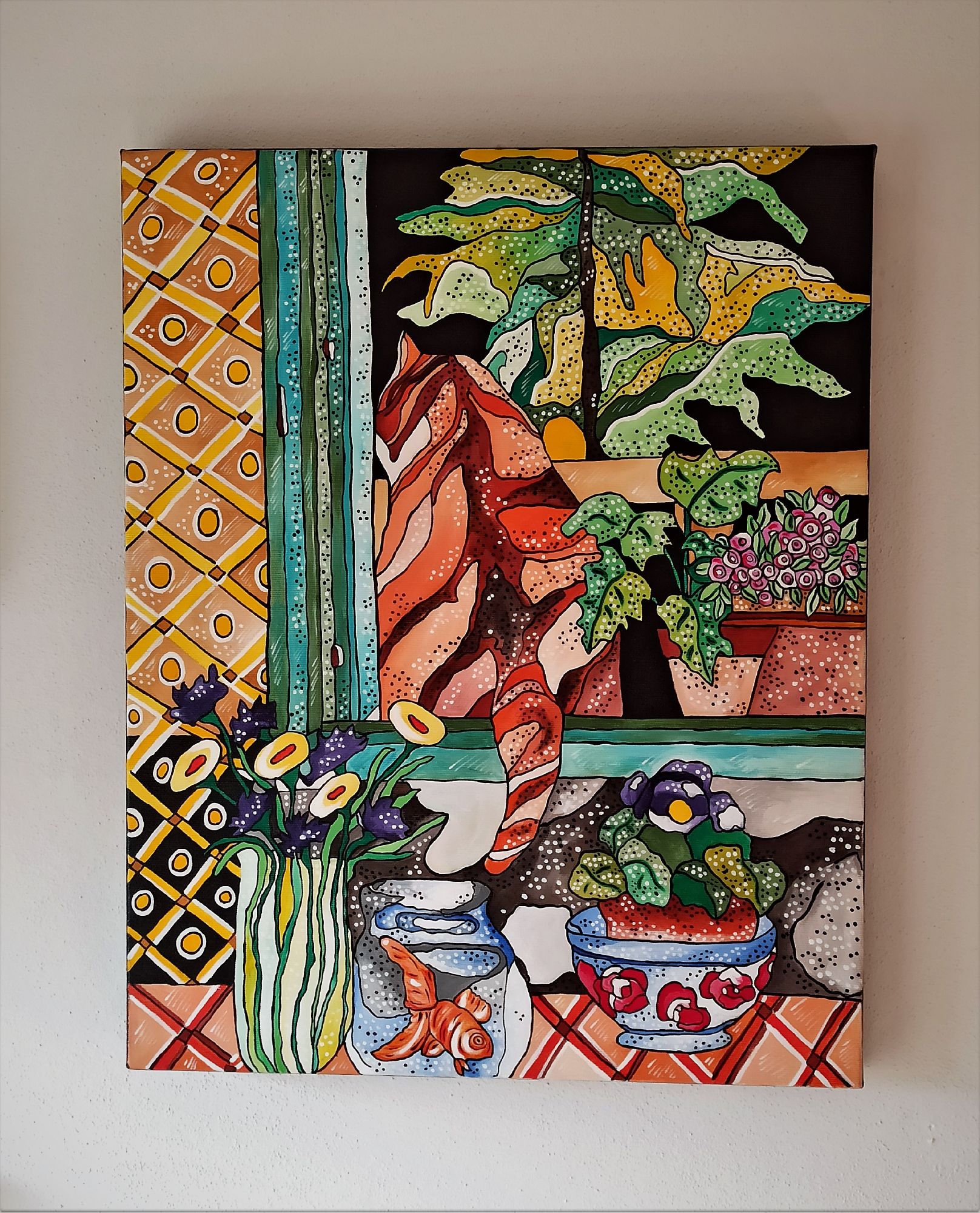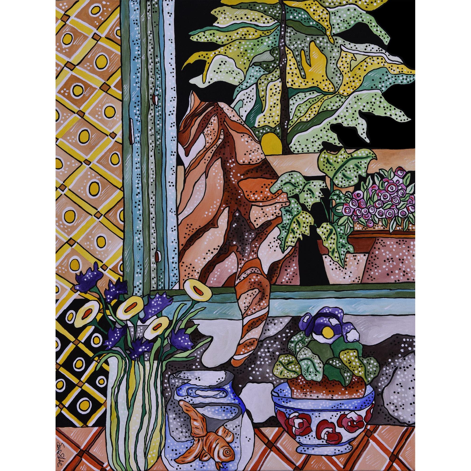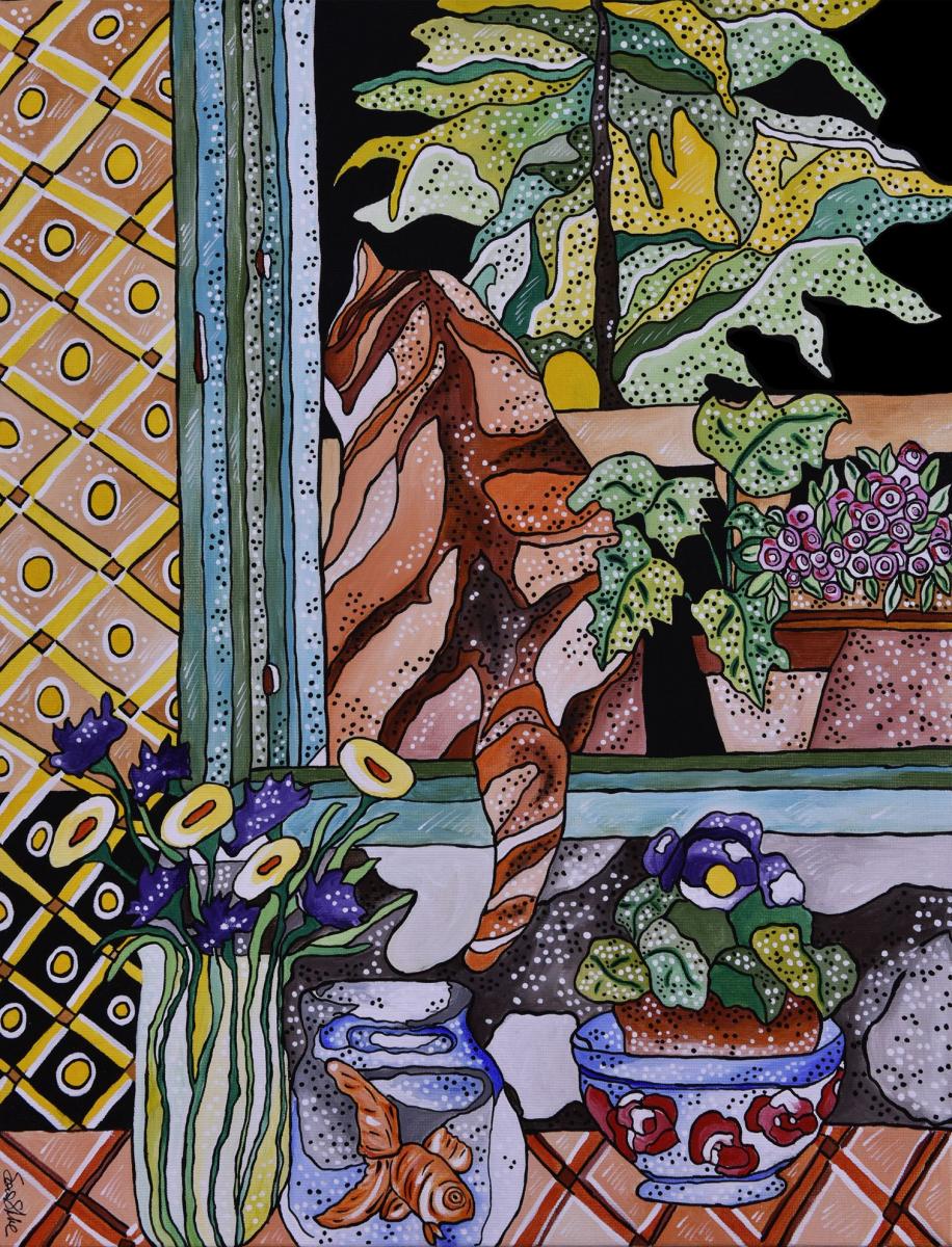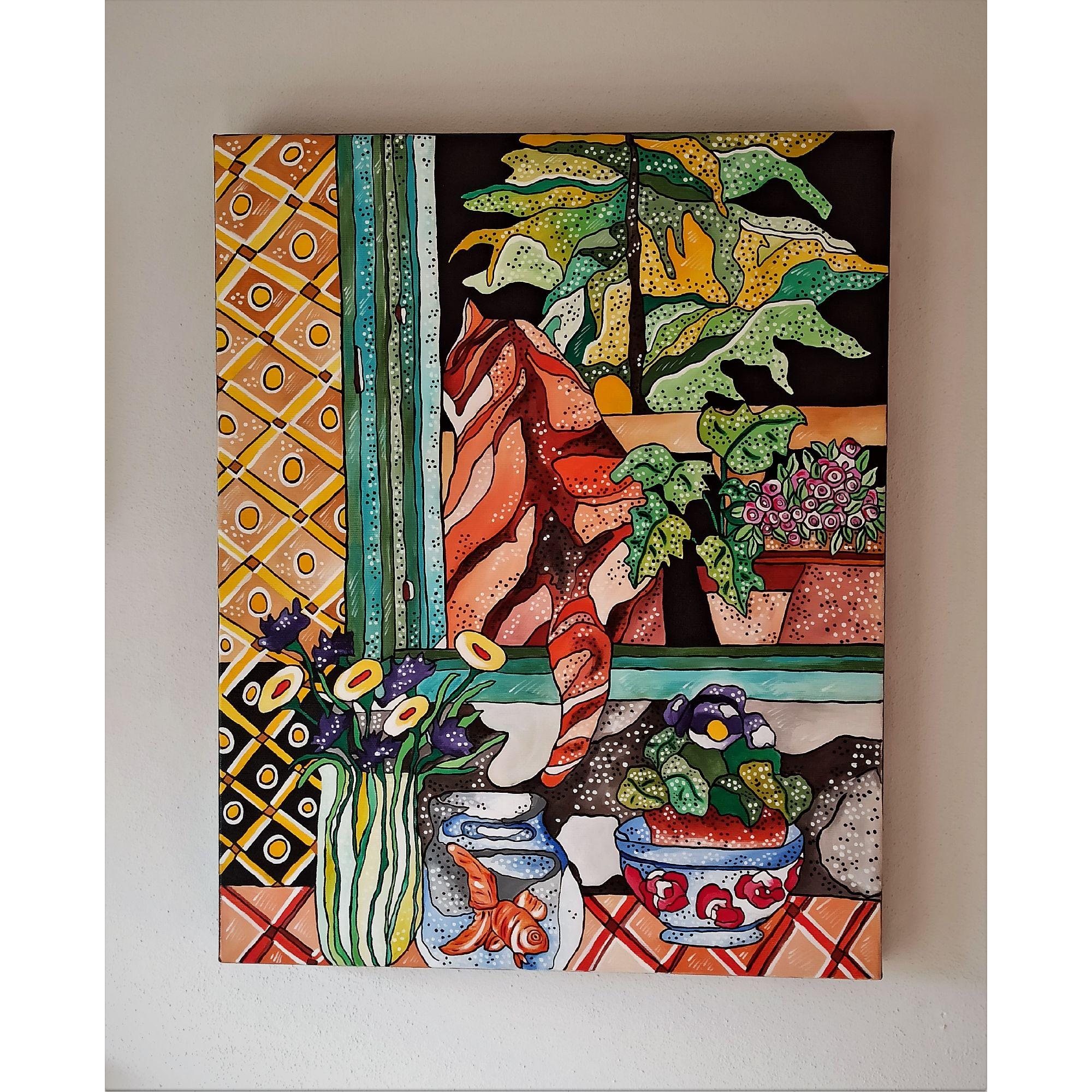 Questo quadro è un esplicito omaggio l pittore Henri Matisse, a cui l' artista a sempre guardato per l' eleganza compositiva e la tavolozza cromatica. E' rappresentato un ambiente domestico, una scena quotidiana a dimostrare che l' arte può trasformare in straordinario l' ordinario.