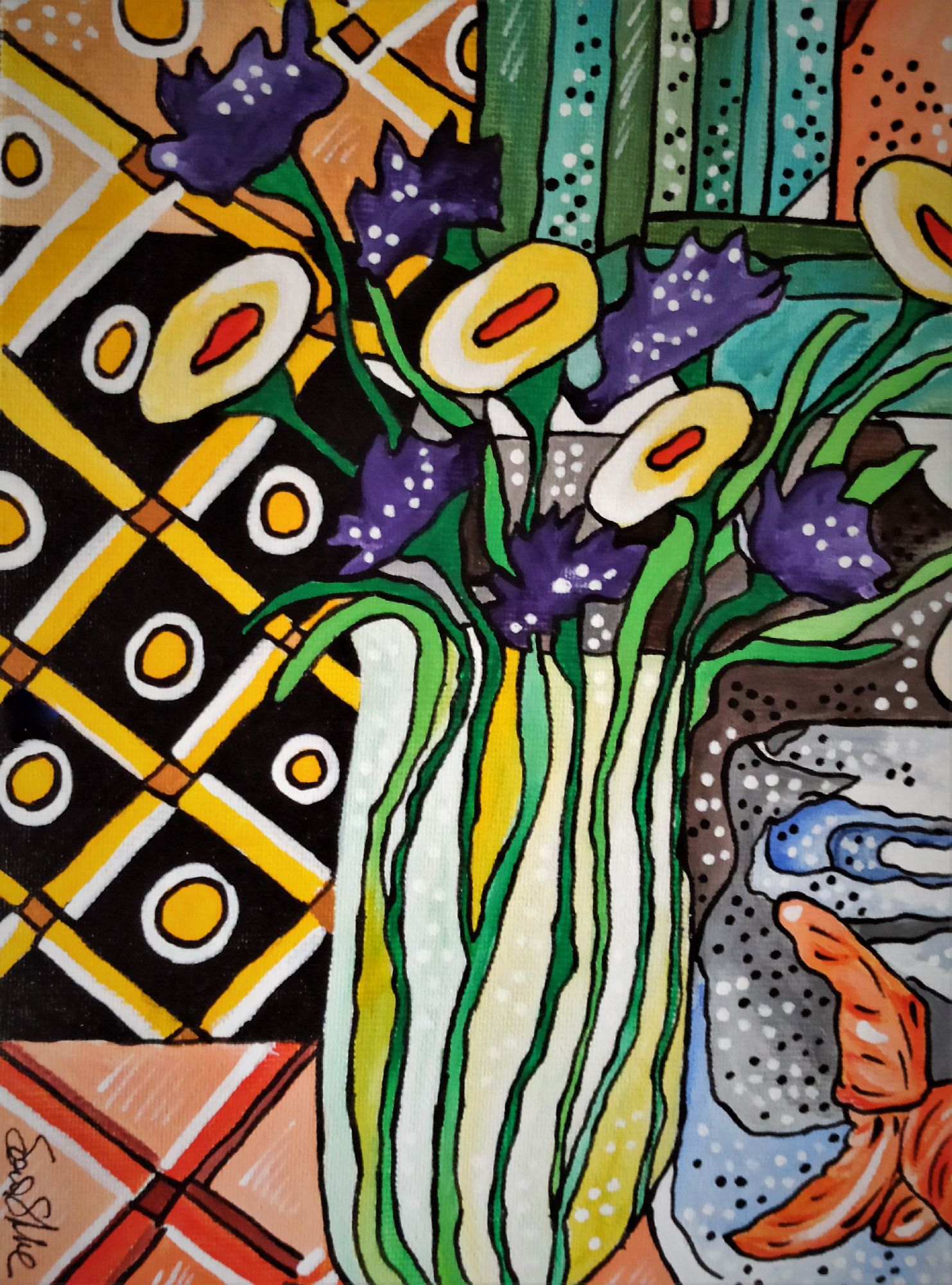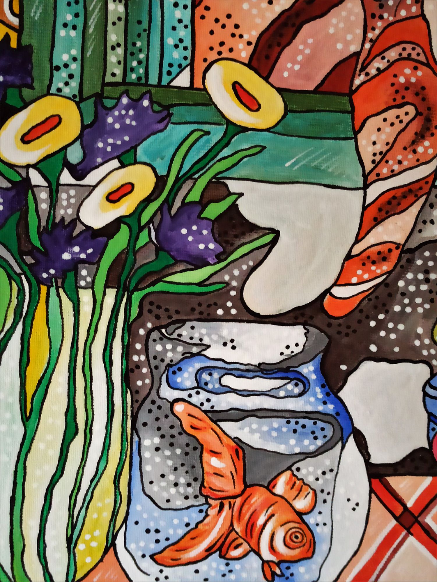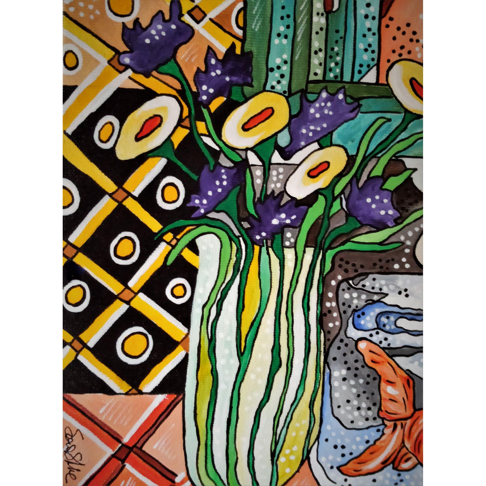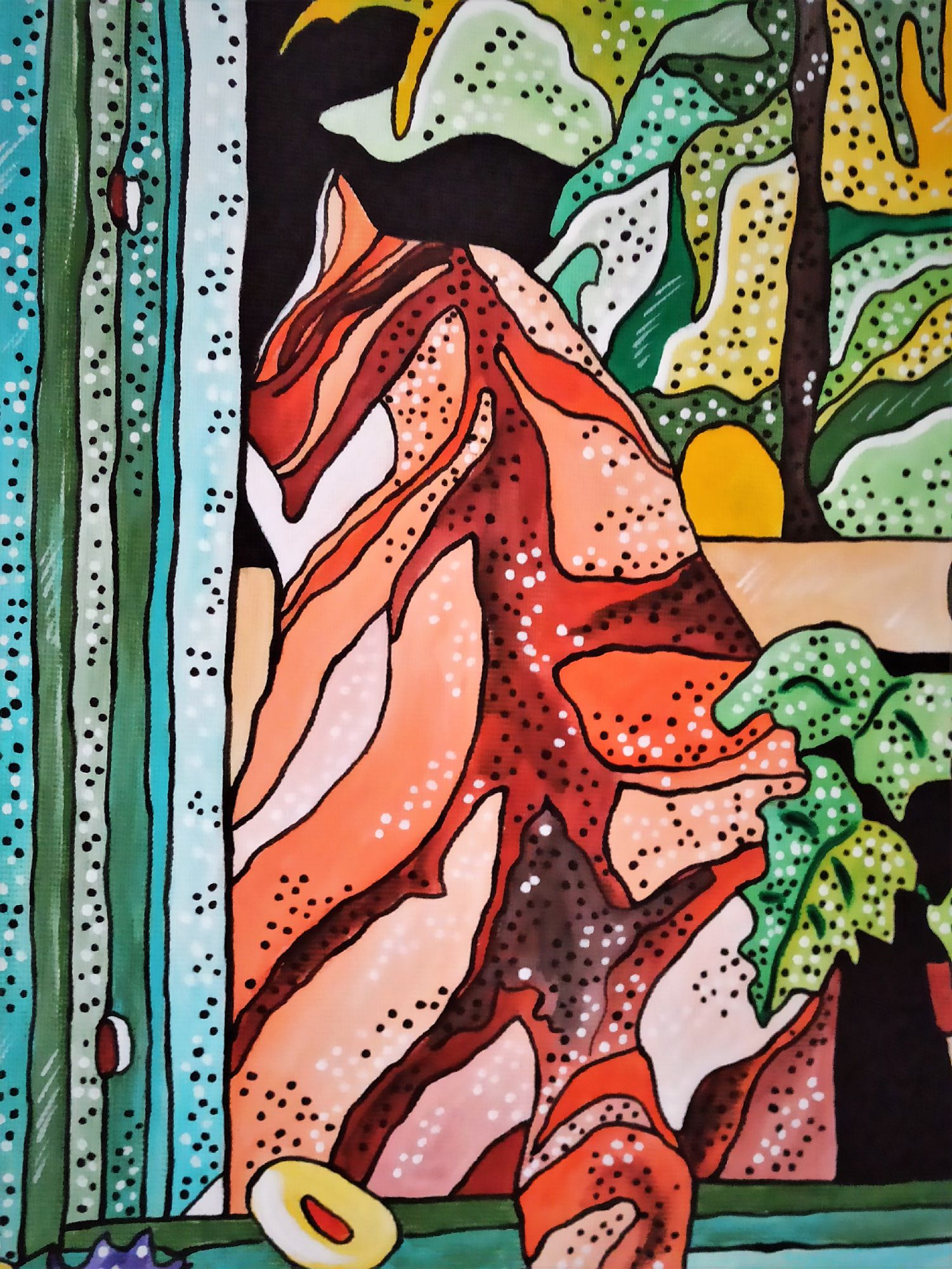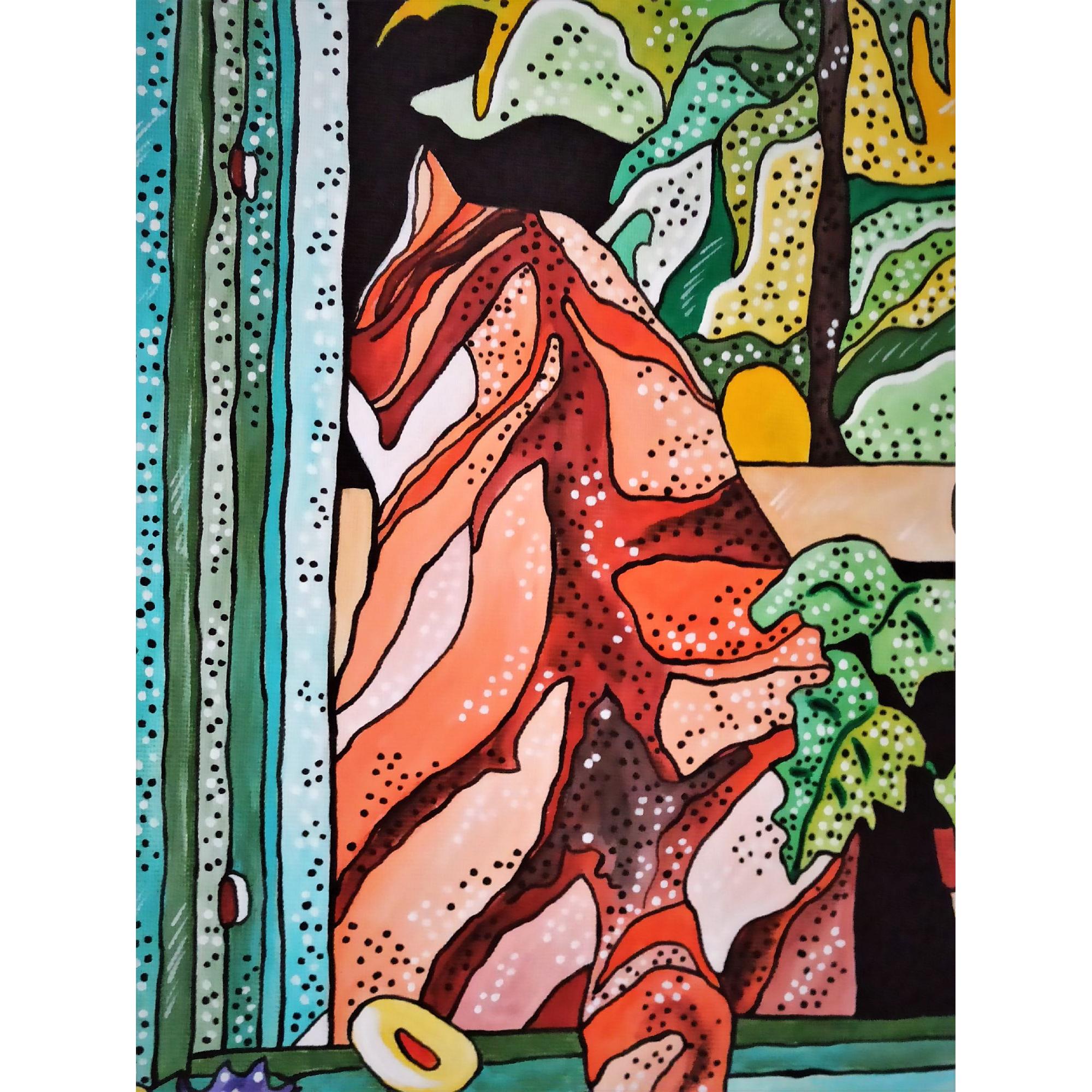 Questo quadro è un esplicito omaggio l pittore Henri Matisse, a cui l' artista a sempre guardato per l' eleganza compositiva e la tavolozza cromatica. E' rappresentato un ambiente domestico, una scena quotidiana a dimostrare che l' arte può trasformare in straordinario l' ordinario.