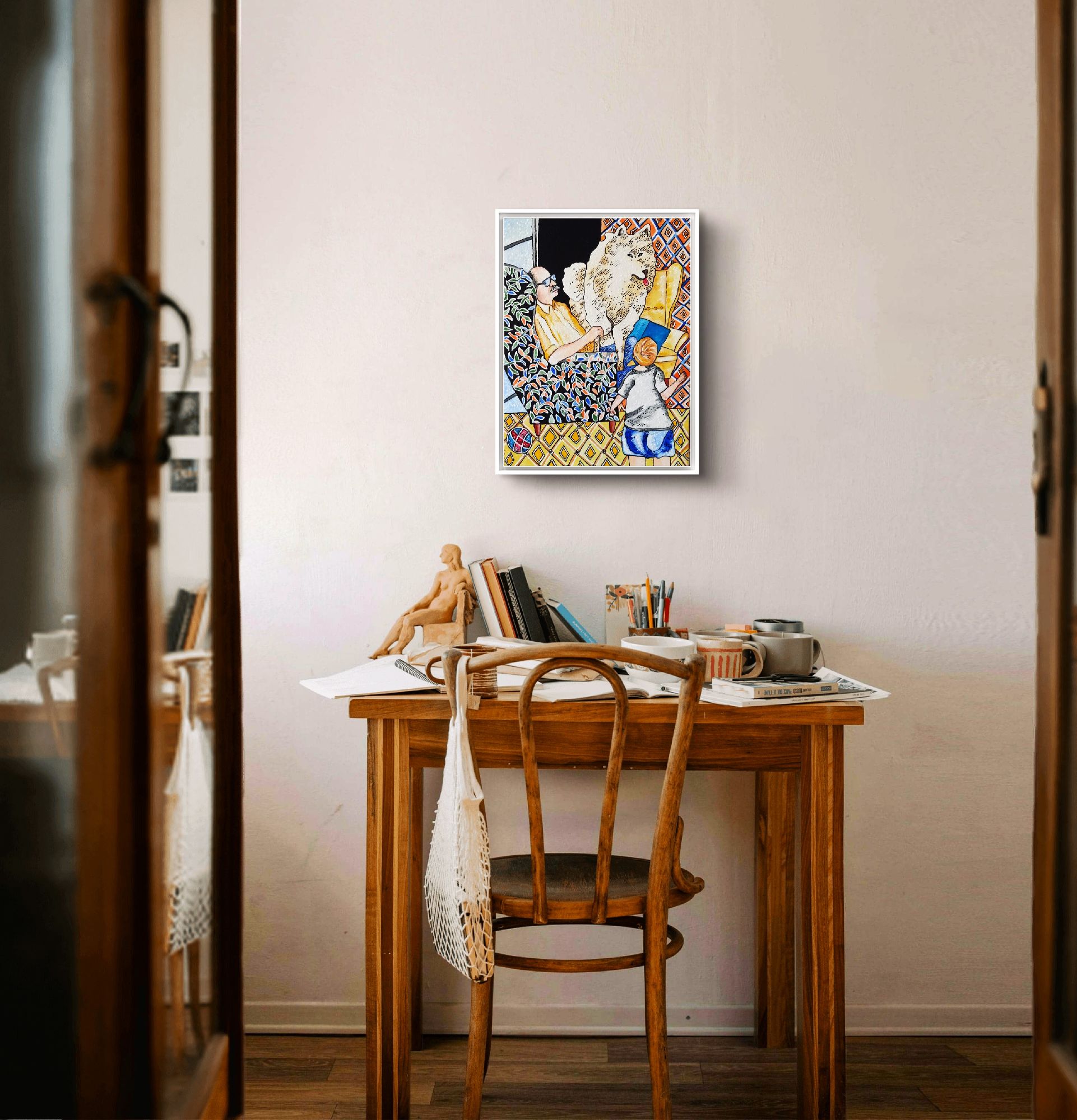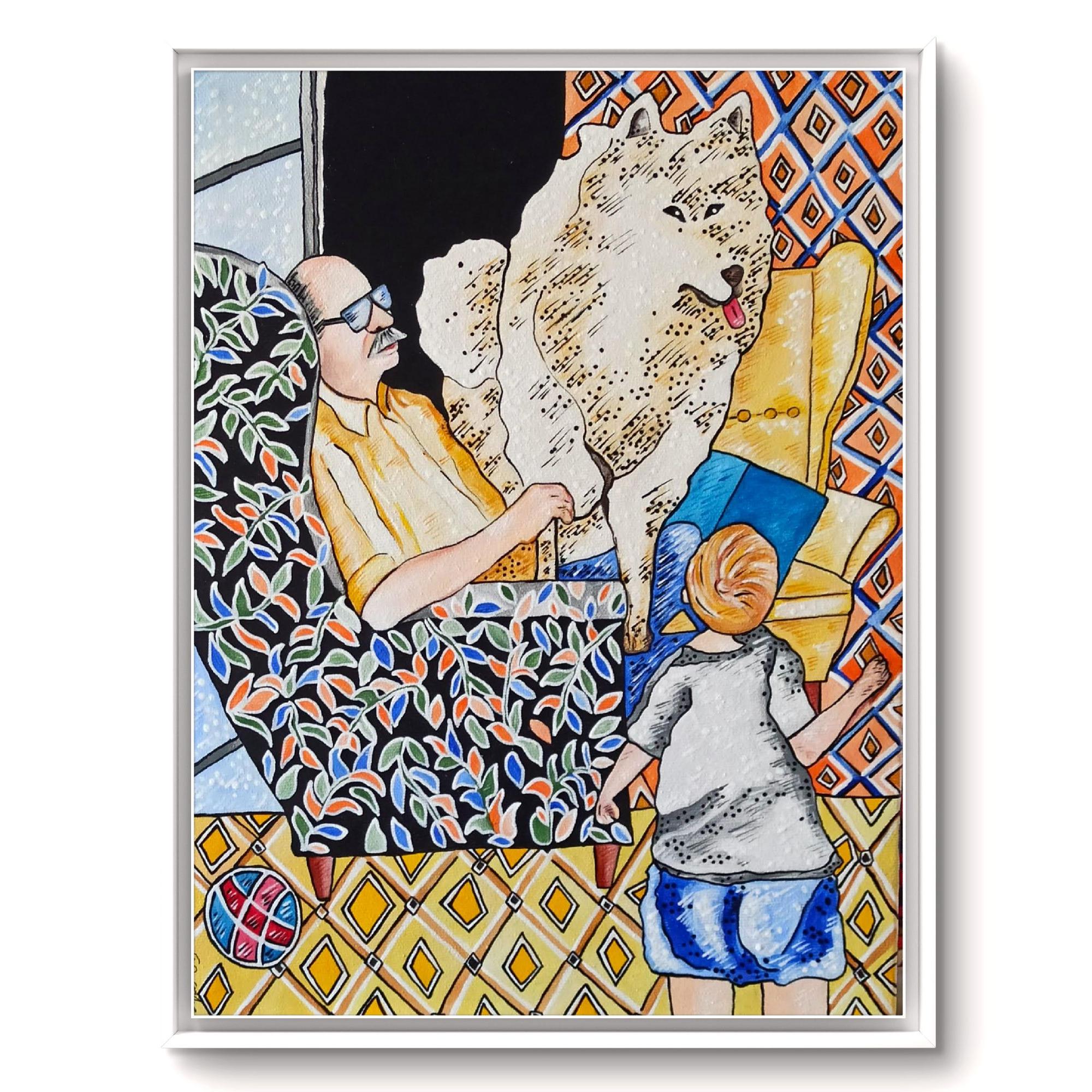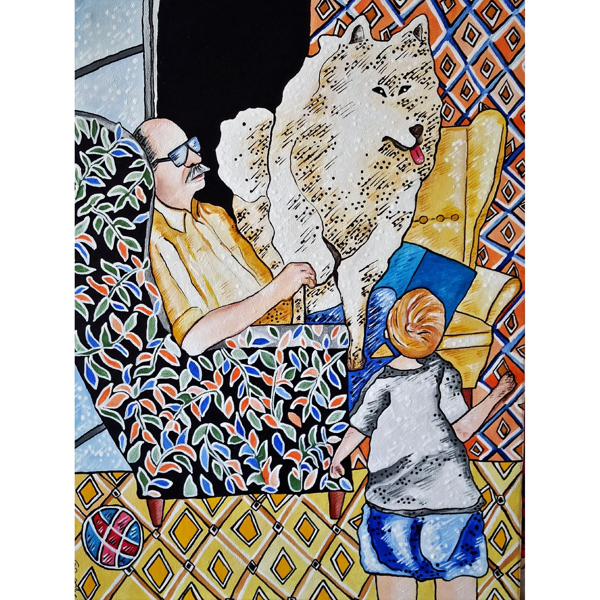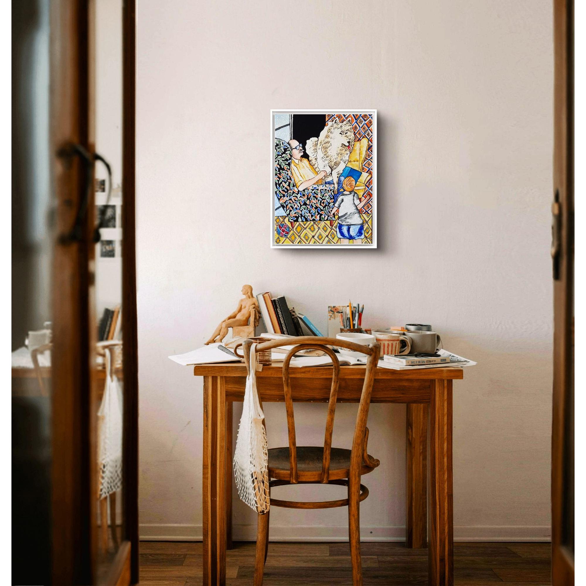 In questo piccolo quadro è rappresentato un interno domestico, una scena familiare rassicurante.L'opera che ho creato è un'espressione vivace e colorata che unisce elementi del figurativo e del pop art. Ho usato l'acrilico per catturare l'intimità di un momento familiare, vivacizzando l'ambiente con pattern audaci e texture delineate. Il contrasto tra i colori caldi e freddi evoca un senso di calore domestico e freschezza contemporanea. È un invito a riflettere sull'importanza dei legami umani e animali, un'ode alla gioia quotidiana che infonderà energia e connettività nella tua casa.
